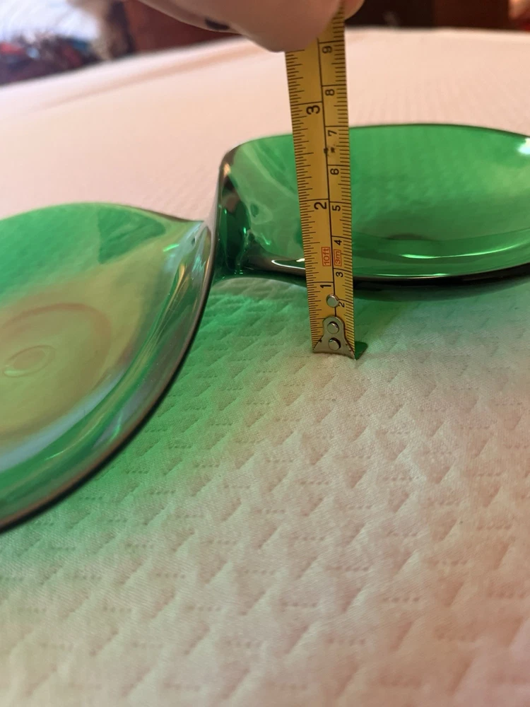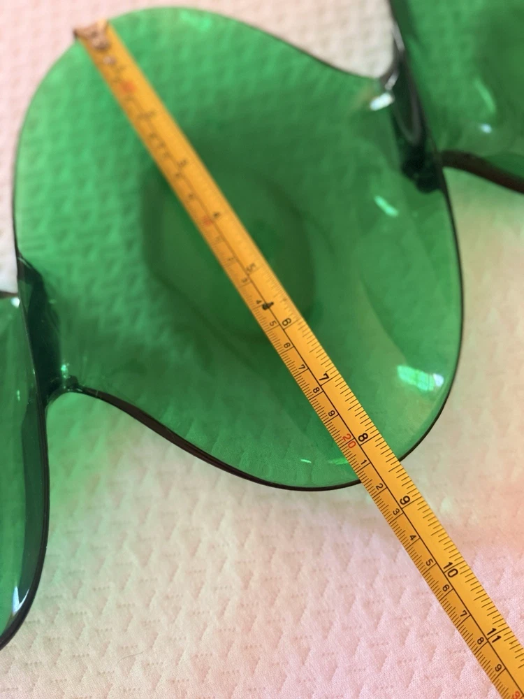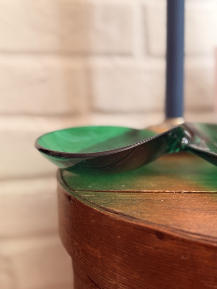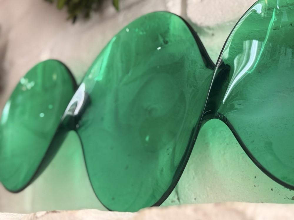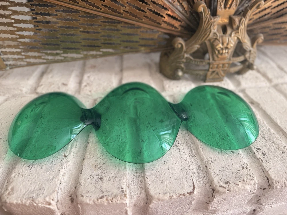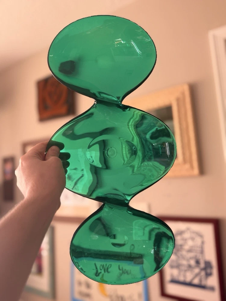 Vintage emerald green lucite sculptural centerpiece bowl, circa 1970s–1980s. This striking design features a flowing, organic form that feels very Space Age / Postmodern. The rich translucent green acrylic catches light beautifully and makes a dramatic statement on a console table, coffee table, or shelf. Measures approximately: • Length: approx. 23–24 inches • Width (each bowl): approx. 8–9 inches • Height: approx. 1 inch Material: Molded acrylic / lucite Color: Emerald green, translucent Good vintage condition with typical surface wear consistent with age. Light surface scratches present (common with acrylic), but no cracks or structural damage. Displays beautifully. This is an unmarked piece. Style is reminiscent of 1970s modernist and Hollywood regency.