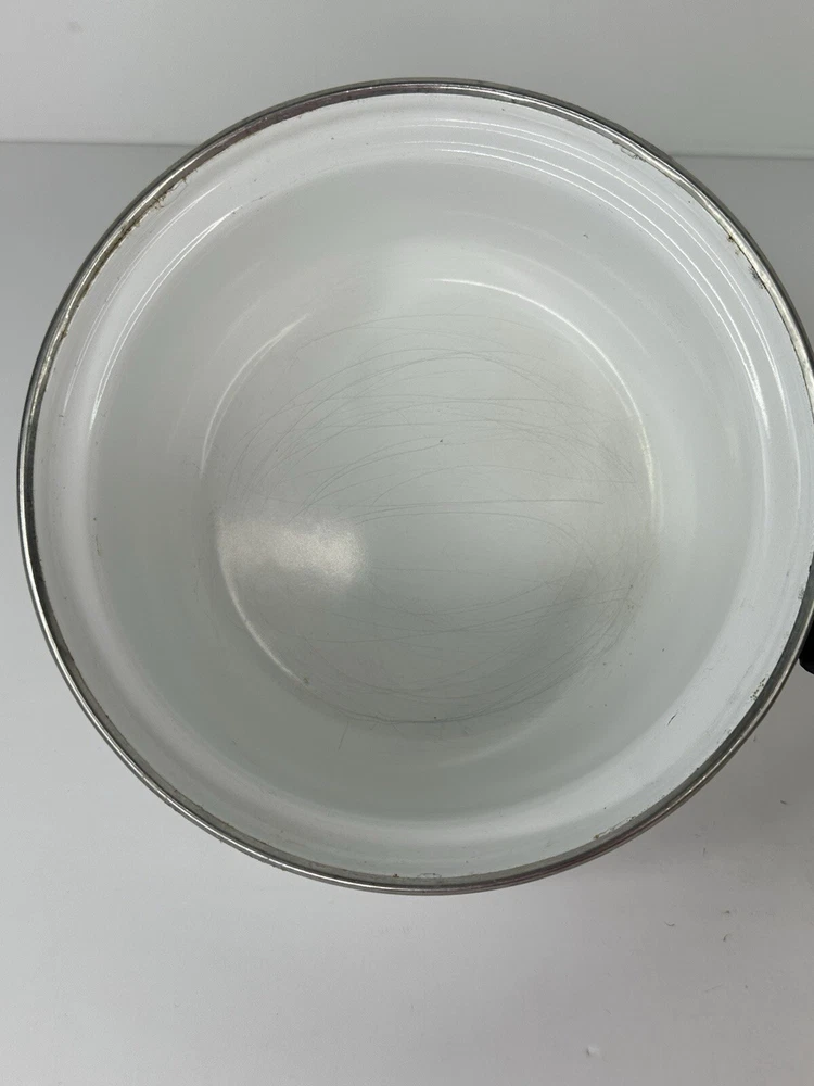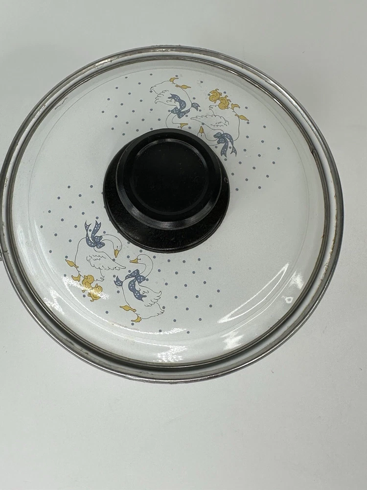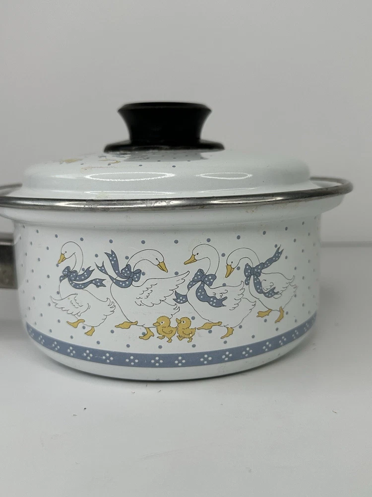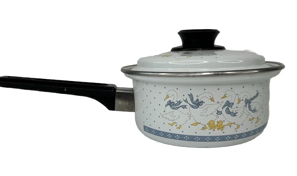 Vintage Enamel Wear 80's Country Geese Goose 6" Sauce Pan with Lid Please see photos for condition. Has some scratches.