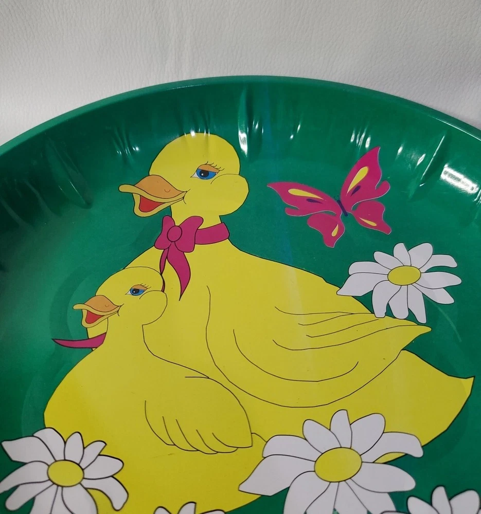 Vintage Enesco Easter Themed Ducks, Butterfly & Flowers Metal Tray 10” EUC