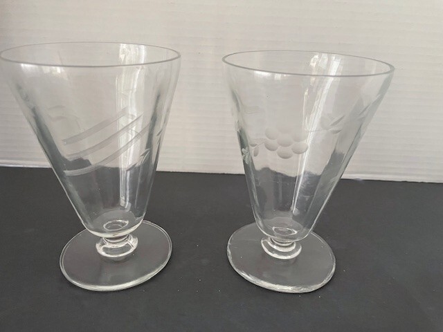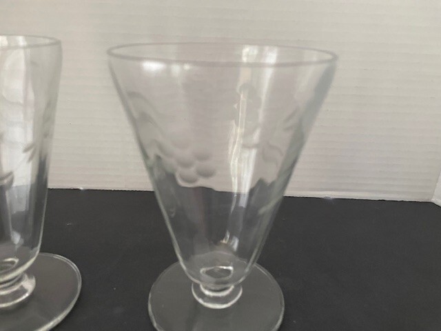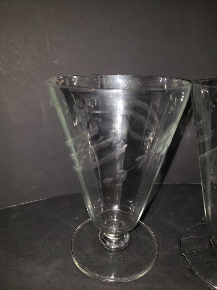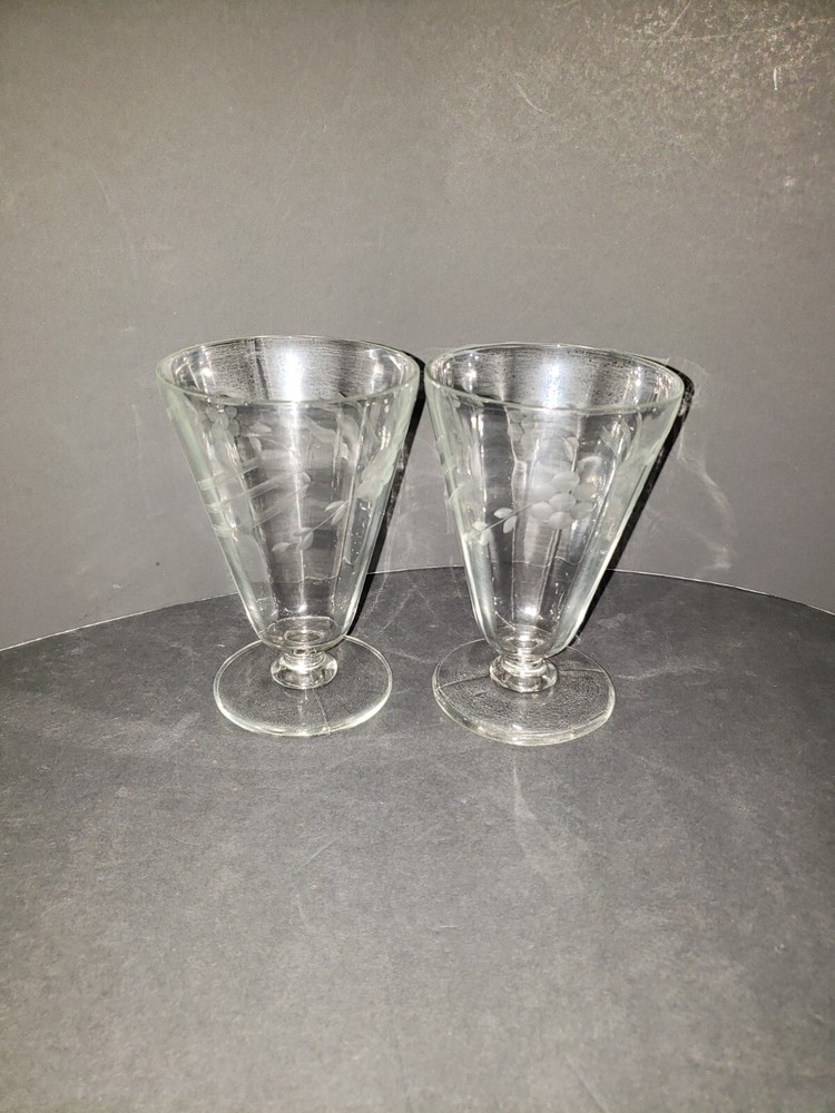 Elevate your table setting with this set of vintage footed parfait glasses, perfect for serving chilled desserts or your favorite iced teas. The glasses feature elegantly etched patterns that add a touch of sophistication and charm to any occasion. Crafted from high-quality clear glass, these goblets are designed to highlight the beauty of your desserts and drinks, making them an ideal choice for those who appreciate the finer details. Unmarked yet undeniably stylish, these glasses blend functionality with a classic aesthetic. The intricate etching not only enhances the visual appeal but also serves as a subtle indicator of the craftsmanship involved. Whether you're hosting a formal dinner or enjoying a casual meal, these glasses are sure to impress your guests and enrich your dining experience. Set Of 4 Vintage Etched Floral Footed Parfait/Iced Tea Glasses 5. 1/2 inches tall.