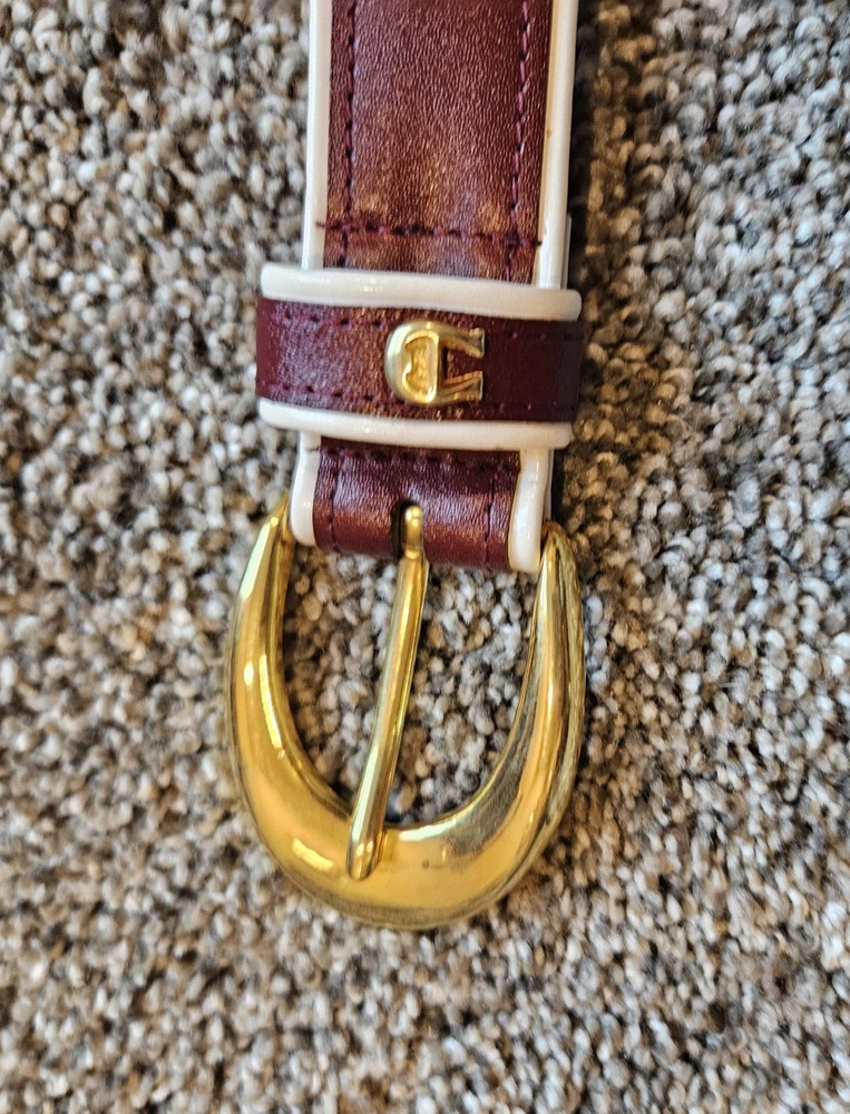 This vintage Etienne Aigner belt is a classic accessory for women who love a touch of retro style. Made from brown leather with a skinny width, it features the iconic logo buckle, adding a touch of designer flair. The adjustable belt fits a waist size of 29-30 inches, making it a versatile piece for any outfit. With its solid pattern and vintage appeal, this belt is perfect for those who appreciate timeless fashion and 90s-inspired accessories.