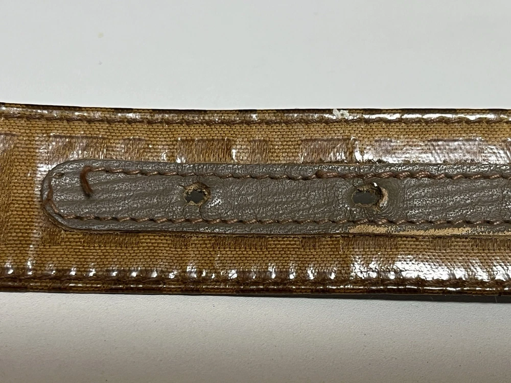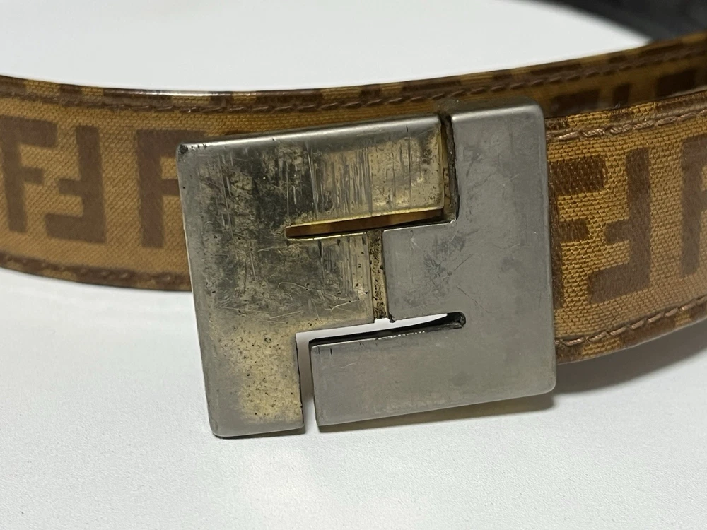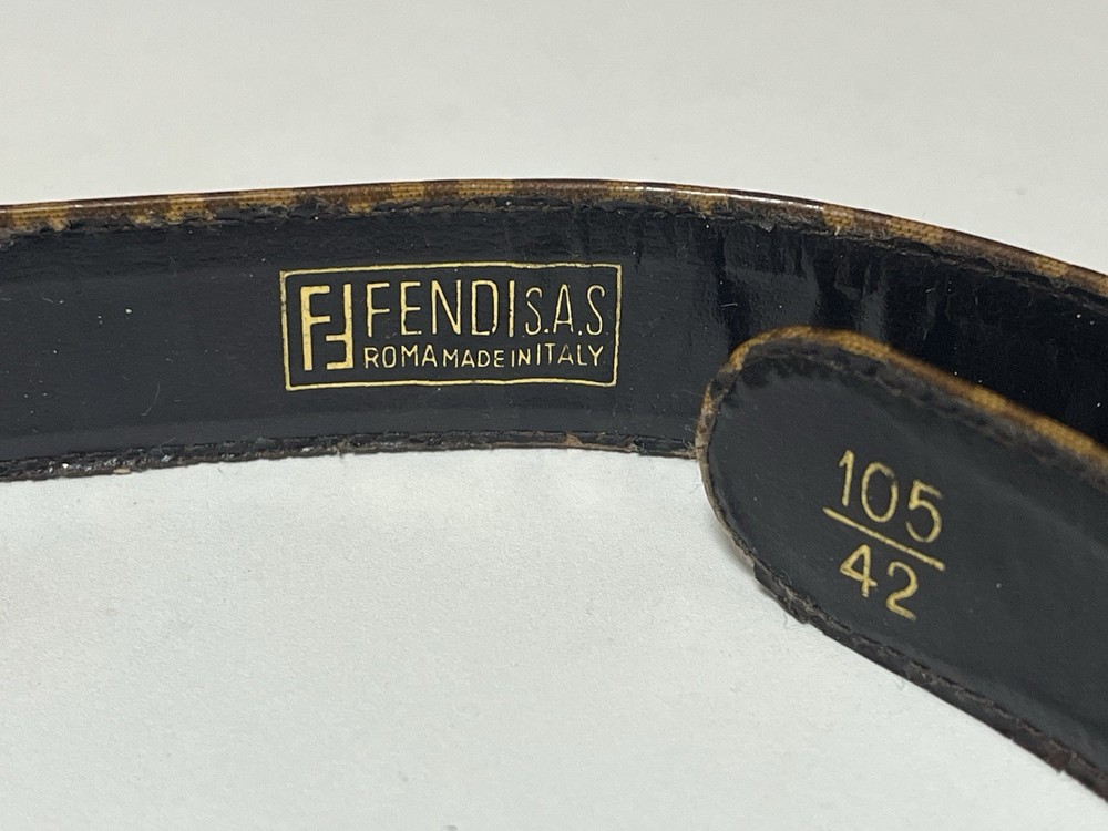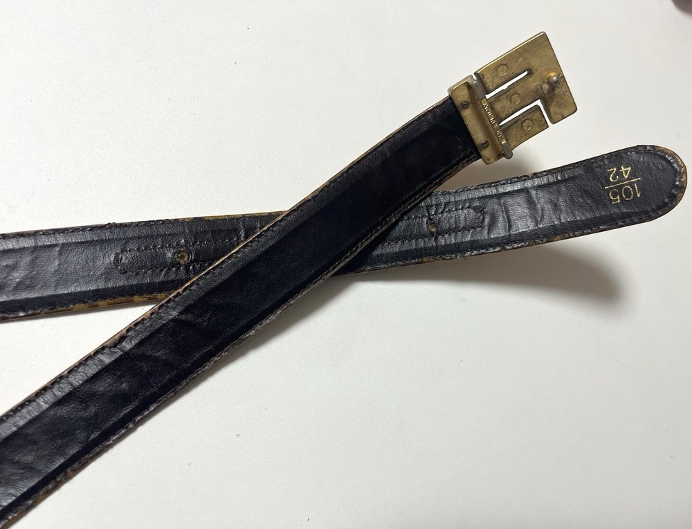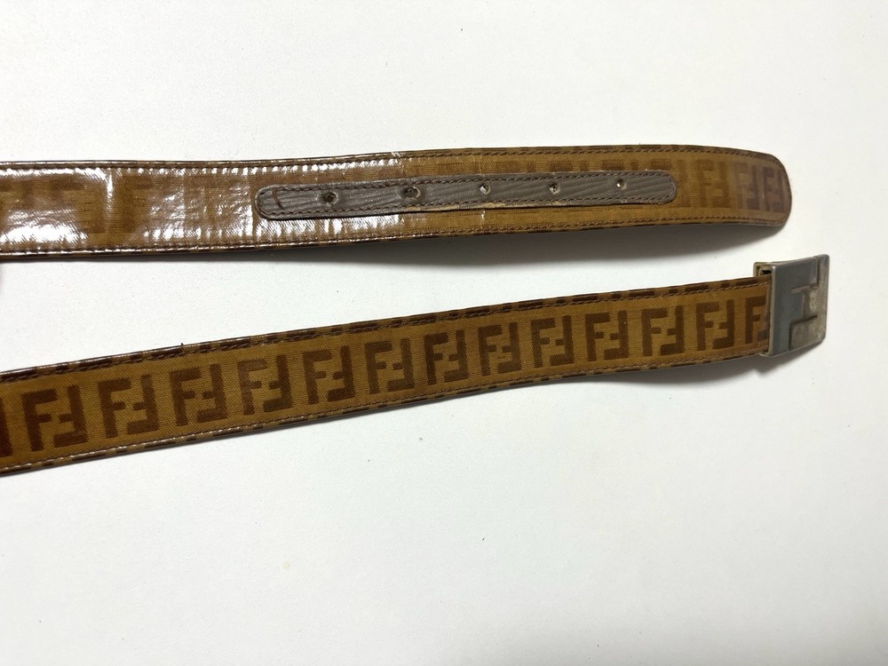 Vintage FENDI belt featuring the iconic FF logo pattern. Made in Italy. The belt is made of coated canvas on the exterior, with a leather lining on the inside. 【 Size 】 Marked size: 105 / 42 Total length: approx. 91 cm (35.8 in) Fits waist: approx. 72–82 cm (28.3–32.3 in) Belt width: approx. 3 cm (1.18 in) 【 Material 】 Outer: Coated canvas Lining: Leather Buckle: Metal 【 Condition 】 This is a vintage item and shows noticeable signs of use. The leather lining shows aging, wrinkles, and wear around the holes. The buckle has scratches, discoloration, and patina. The coated canvas surface also shows wear and aging consistent with vintage use. Please review all photos carefully before purchasing. No accessories included.