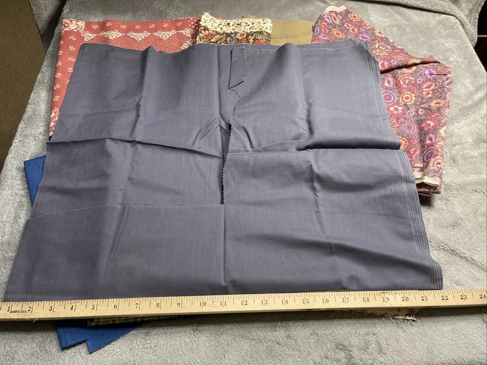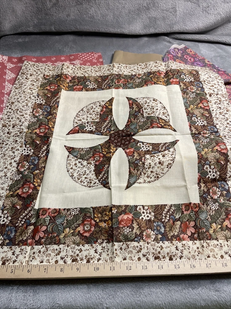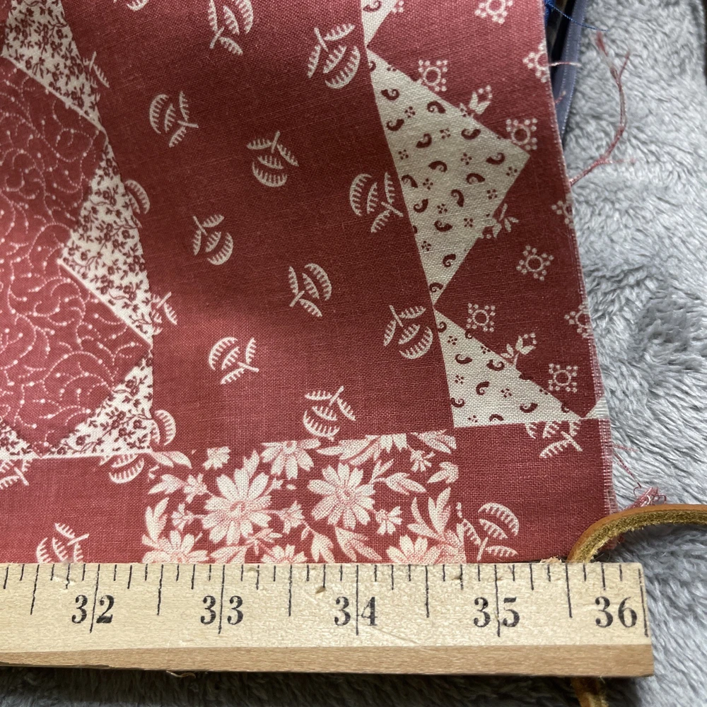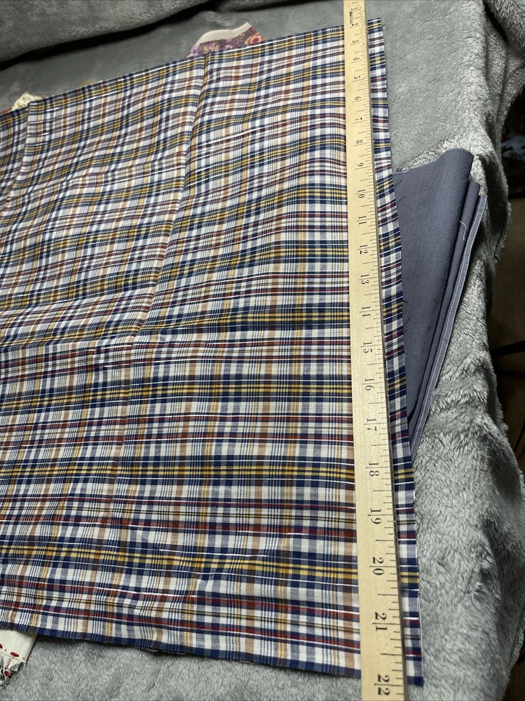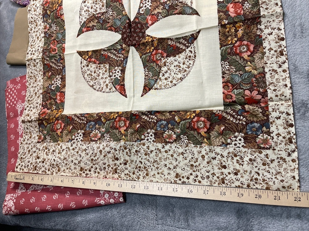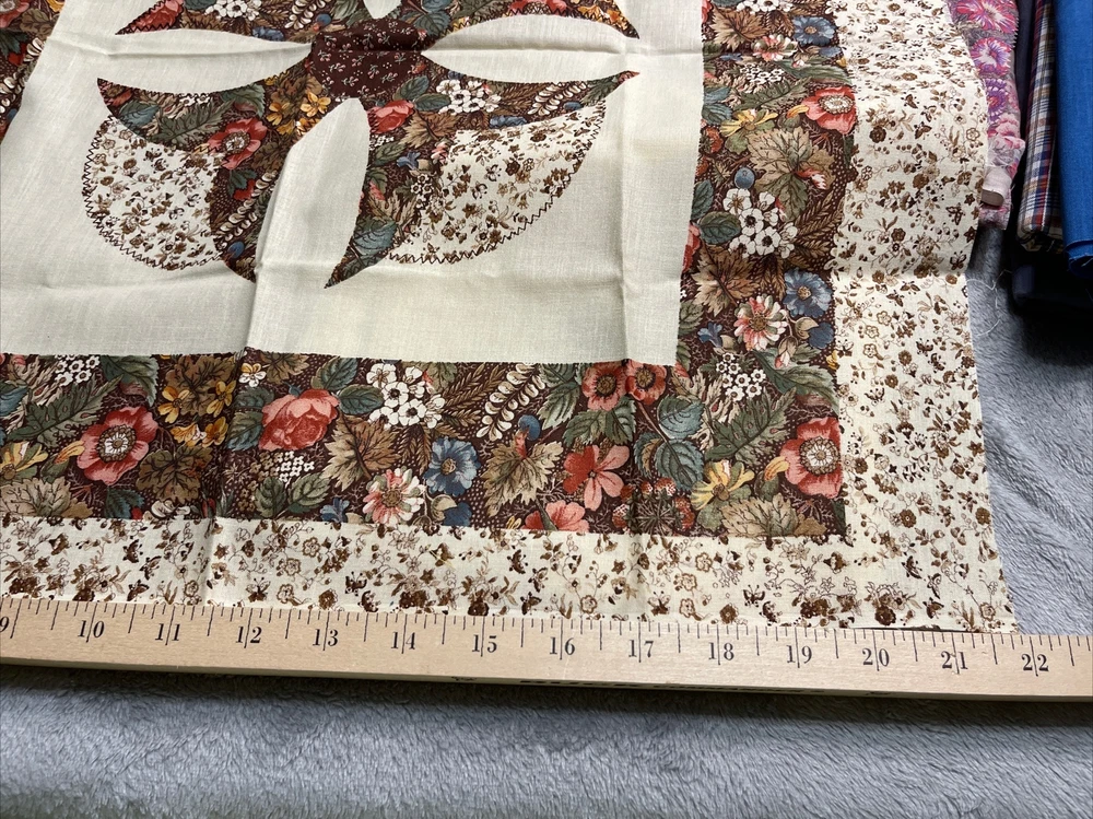 This vintage fabric is a charming addition to any collection. It features a delightful floral and striped pattern in multicolor shades, perfect for all occasions. Made of light cotton material, it's suitable for quilting projects with a country style theme. The fabric is from the 1980s and comes in various sizes. It's an original piece and perfect for those who appreciate the beauty of vintage textiles. Add this to your linens and textiles collection today! Gray/Blue fabric is 39 inches x 44 inches with a section of 15 inches x 24 inches cut out. Stripe with silver stripe fabric is 33 inches x 44 inches. Bright Blue fabric is 22.5 inches x 44 inches. Square patterned fabric is 22 inches x 22 inches. Tan fabric is in two strips measuring 31 inches x 10 inches each. Pink star fabric is 36 inches x 44 inches. The country squares are 9 inches x 9 inches for a total of 9 squares. The floral fabric is 86 inches x 20 inches with a 11 inch x 9.5 inch piece cut out and a 32 inch x 23 inch section making it an L shape piece of fabric.