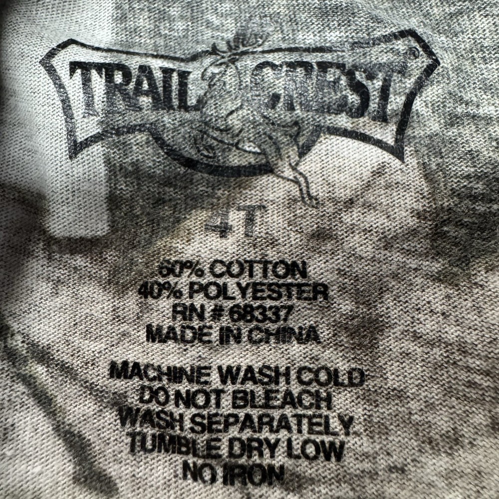 Material: Cotton Blend, Polyester Accents: Logo Department: Boys Style: Ringer Vintage: No Fit: Regular Color: Camo Garment Care: Machine Washable Neckline: Crew Neck Occasion: Casual, Workwear Performance/Activity: Hunting, Fishing, School, Walking Handmade: No Sleeve Length: Long Sleeve Size: 4T Type: T-Shirt Season: Fall, Spring, Winter Character: Boy Personalize: No Pattern: Camo Brand: TRAILCREST