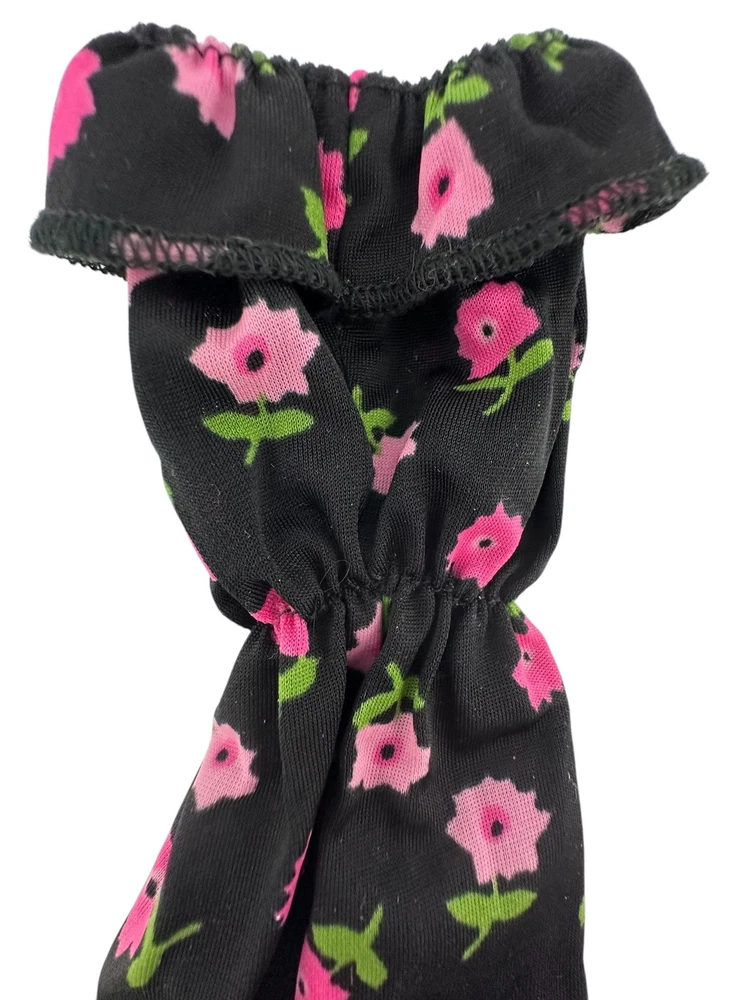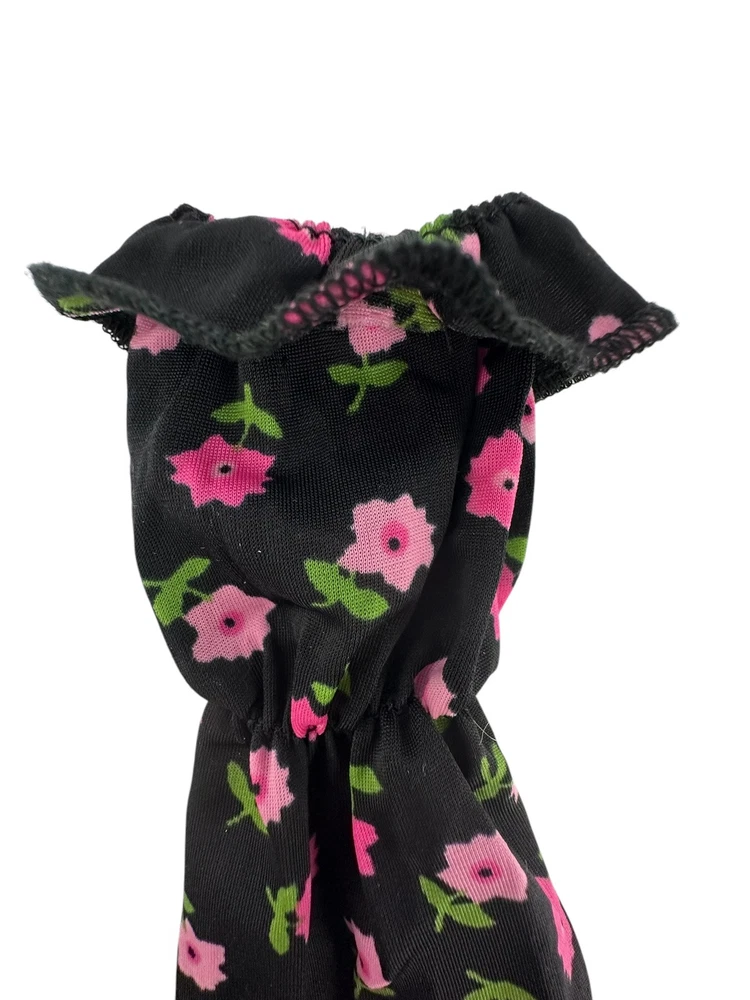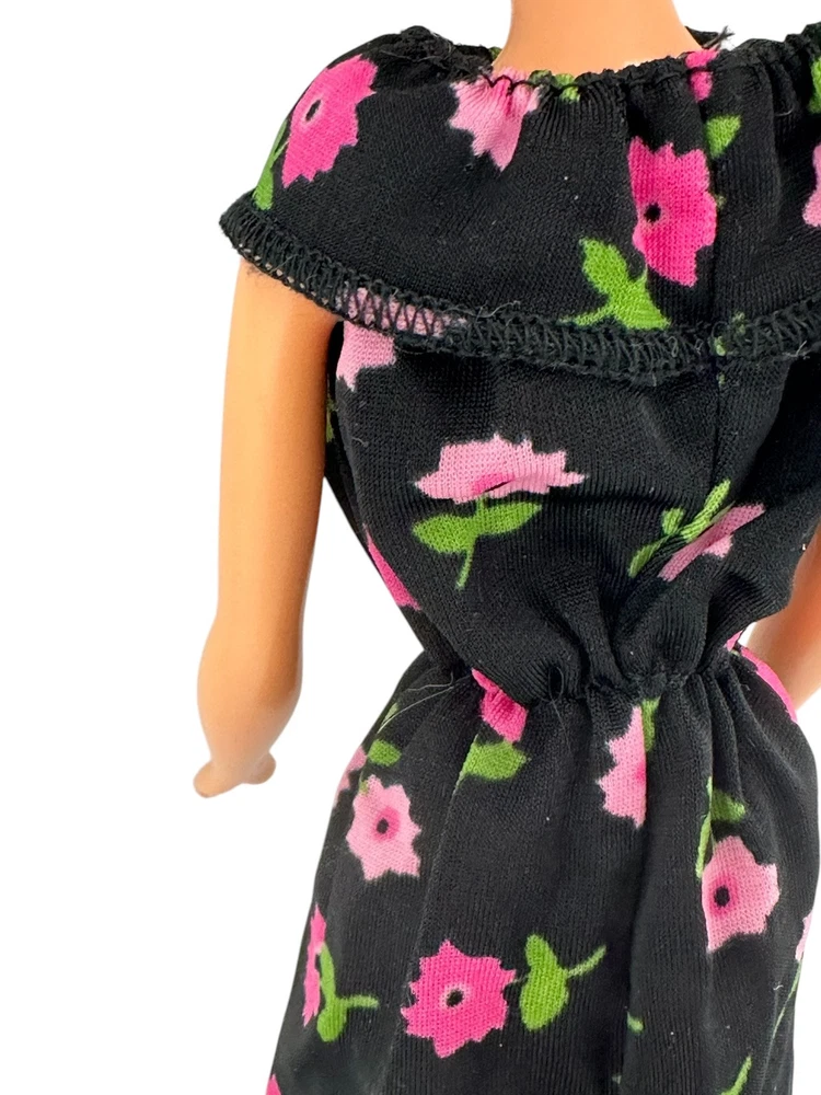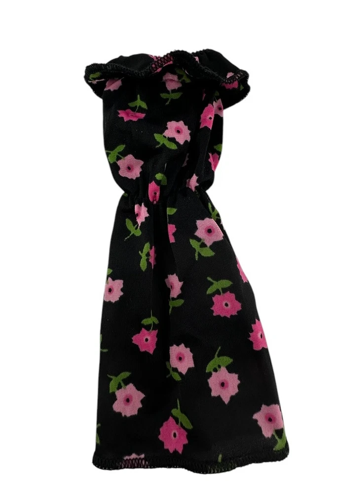 Vintage Fashion Doll Summer Dress Black Flowers Floral Ruffle Off Shoulder Unbranded, but looks like the same pattern as the … 1978 Superstar Barbie Doll Christie Fashion Favorite #1401 Summer Dance …look it up. Same fabric pattern, but different style of dress. See pics. Doll NOT included.