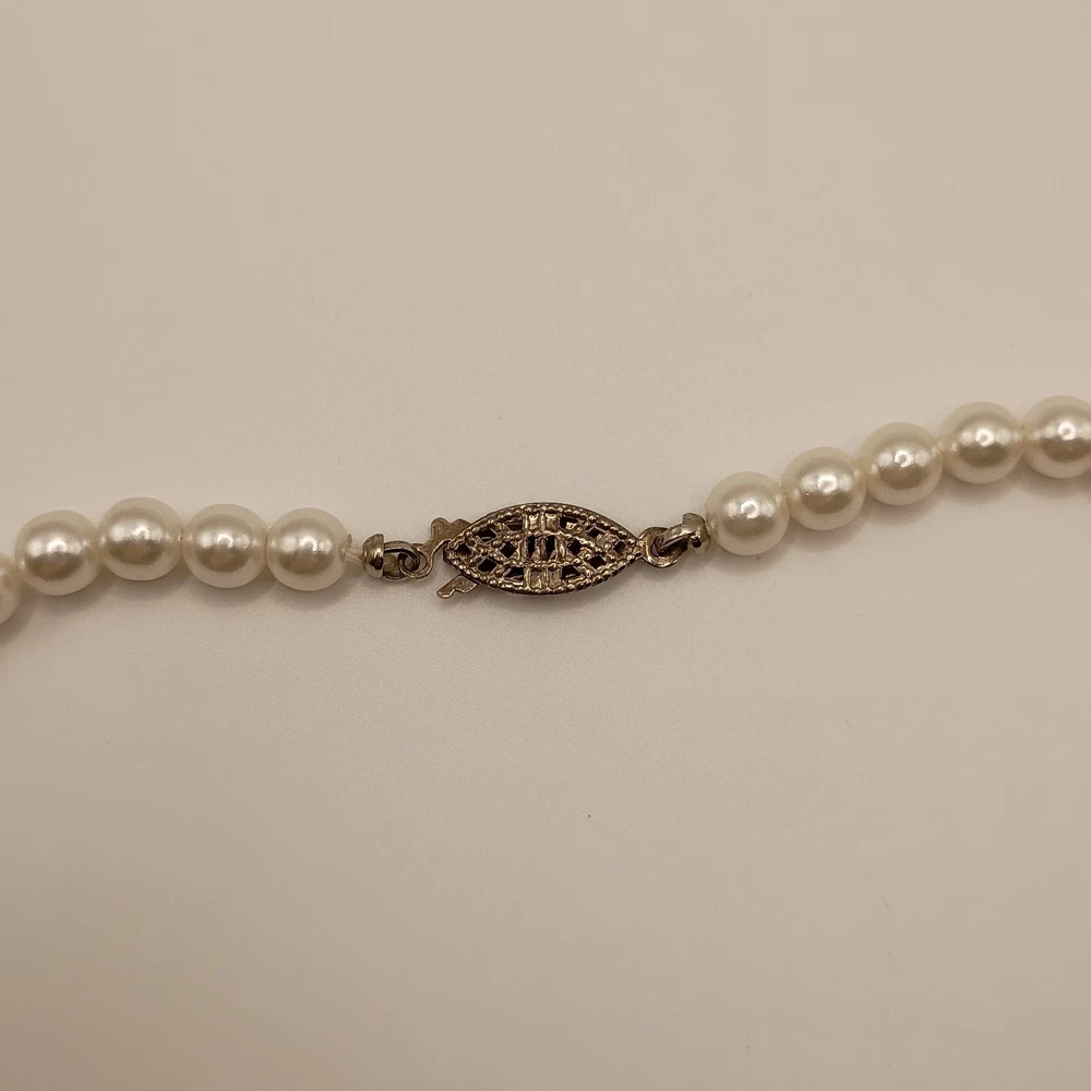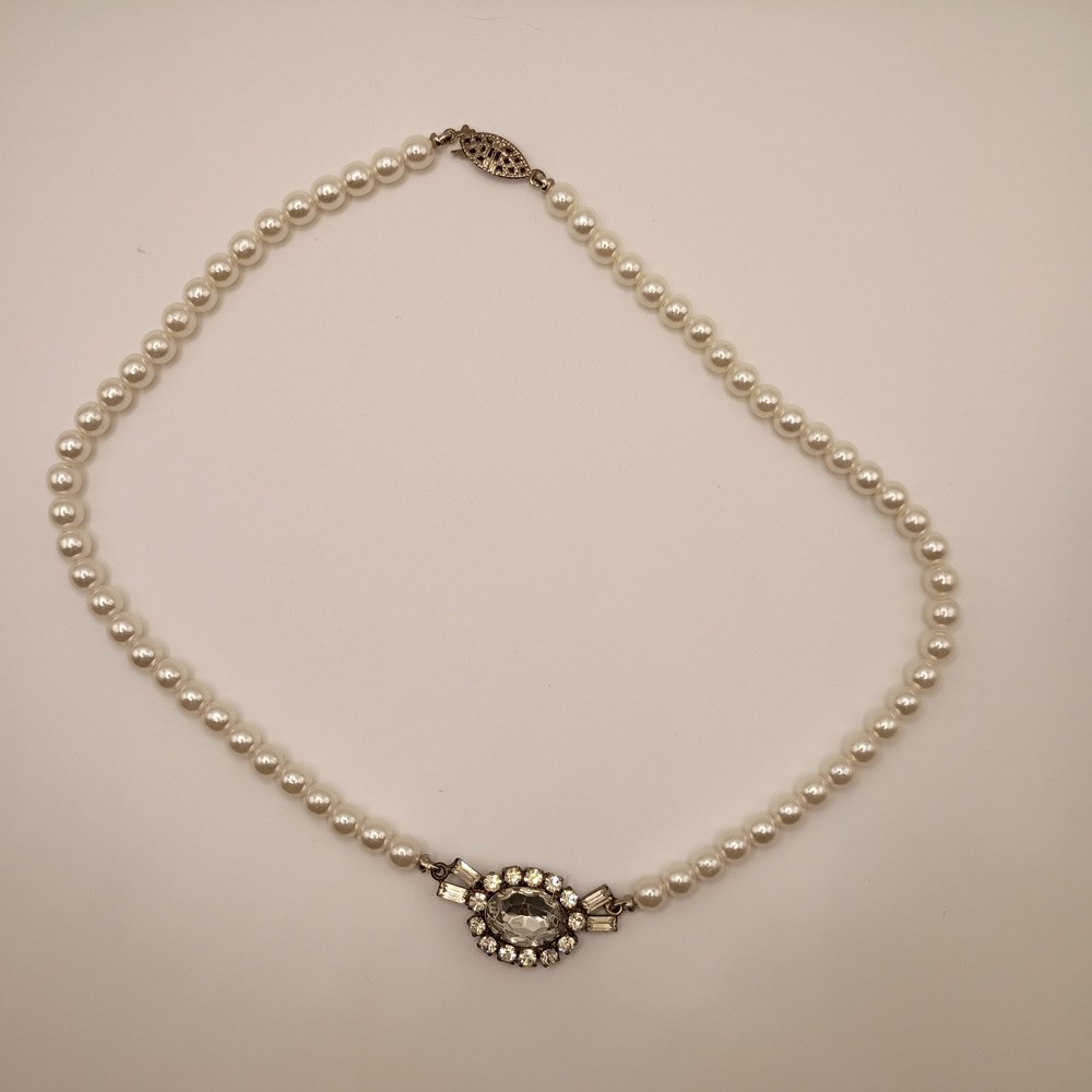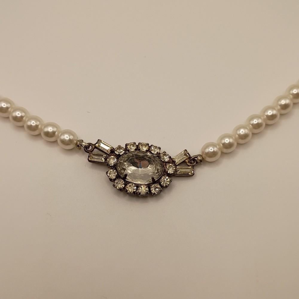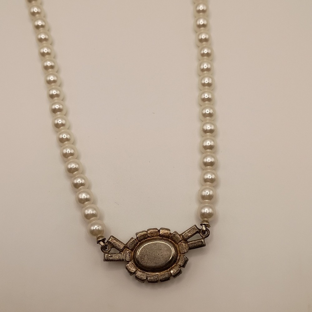 The metal has tarnish please take a close look at the photos for a better description.This is a Vintage single-strand choker necklace, 16 inches long, featuring white faux pearls and a decorative centerpiece of clear rhinestones. The necklace secures with a decorative clasp.
