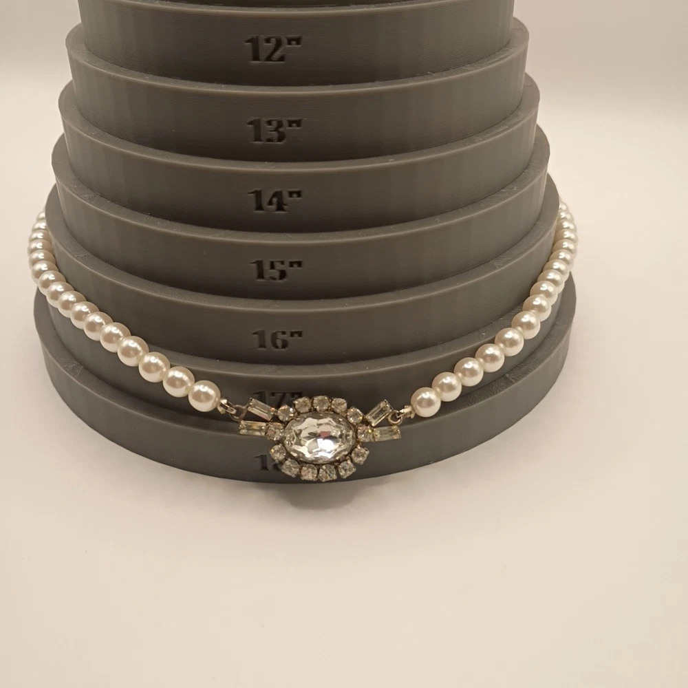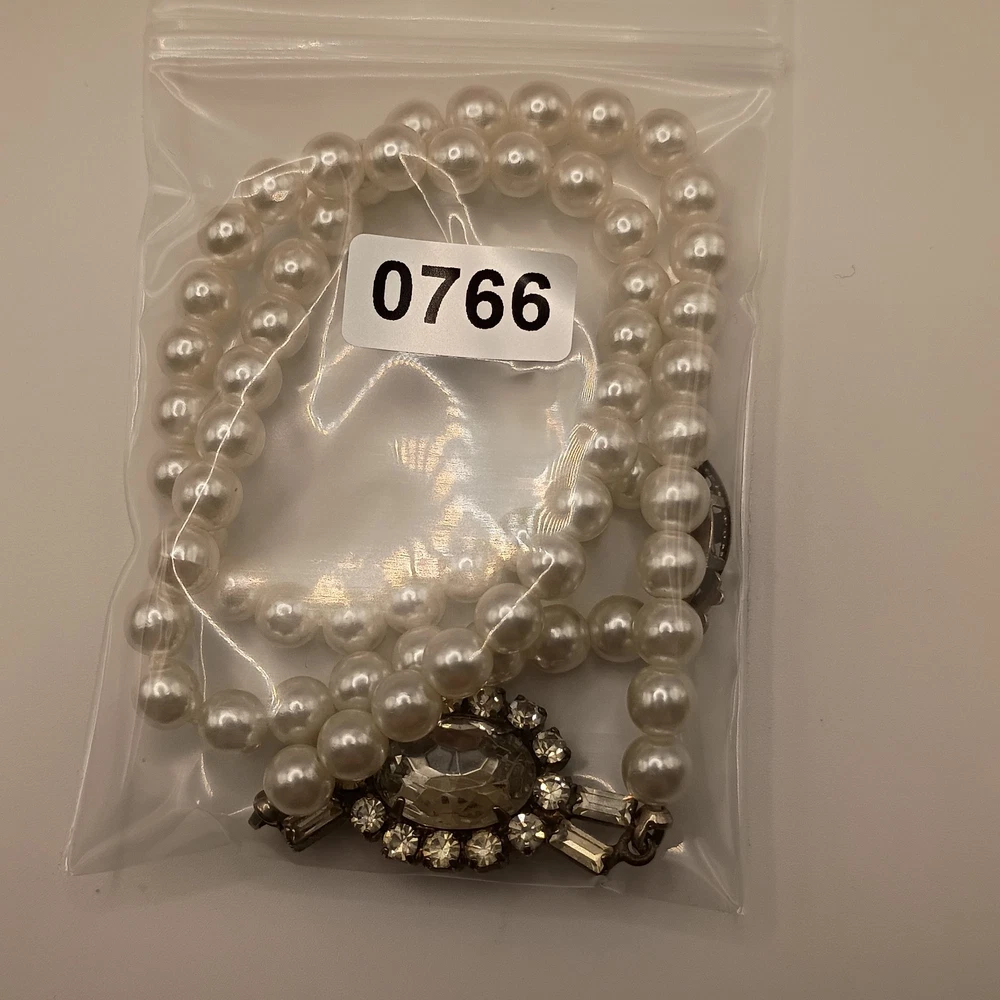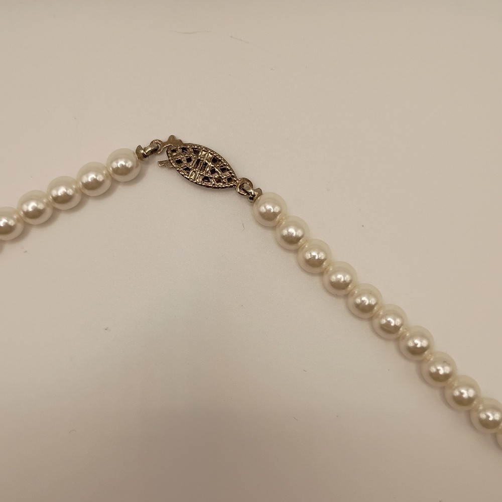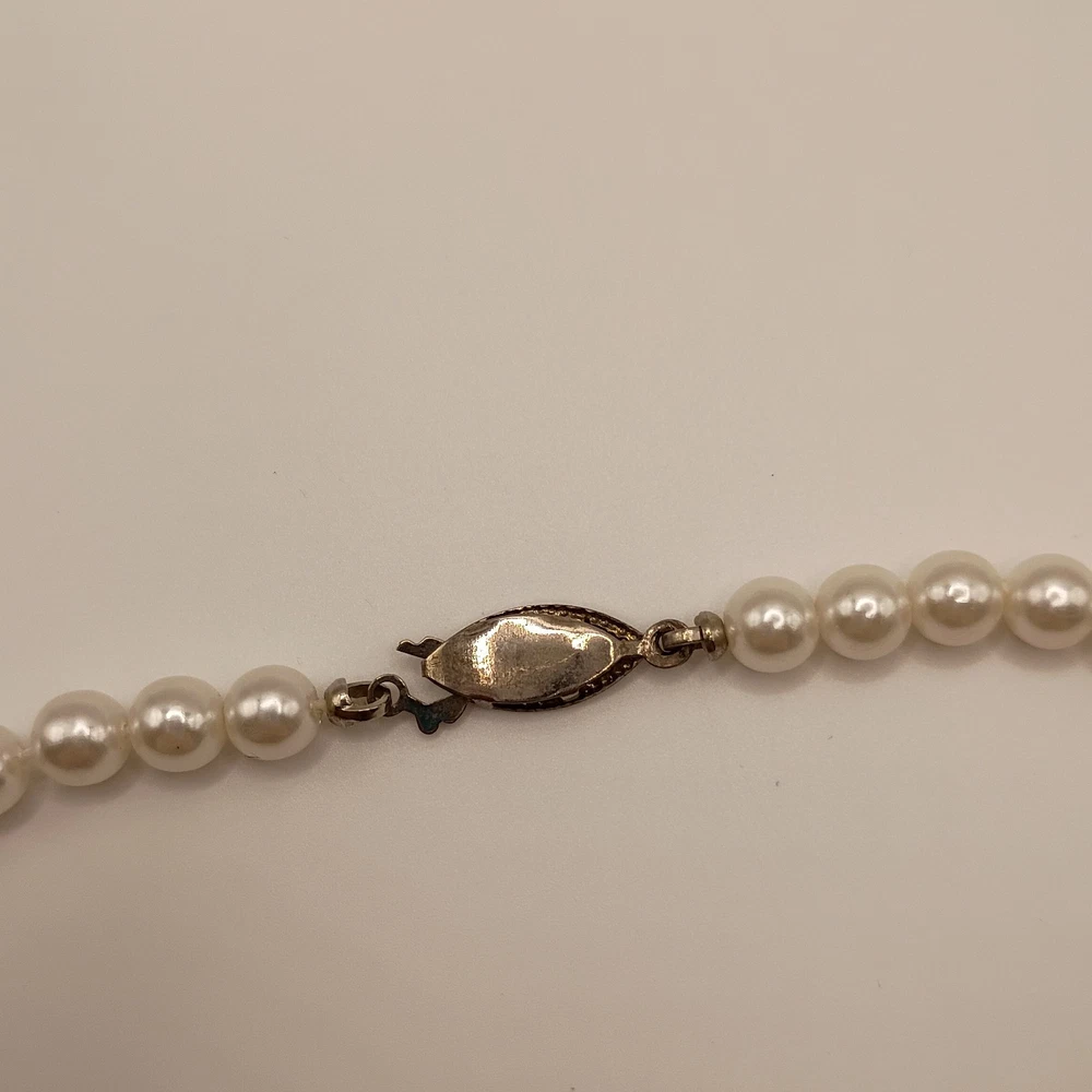 The metal has tarnish please take a close look at the photos for a better description.This is a Vintage single-strand choker necklace, 16 inches long, featuring white faux pearls and a decorative centerpiece of clear rhinestones. The necklace secures with a decorative clasp.