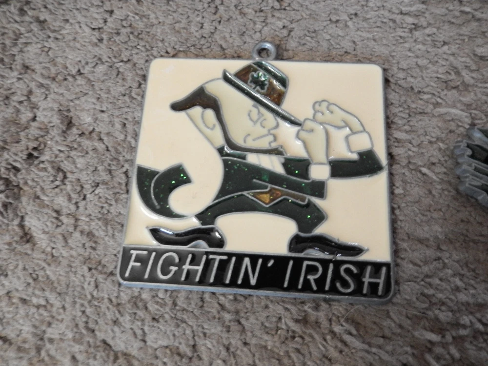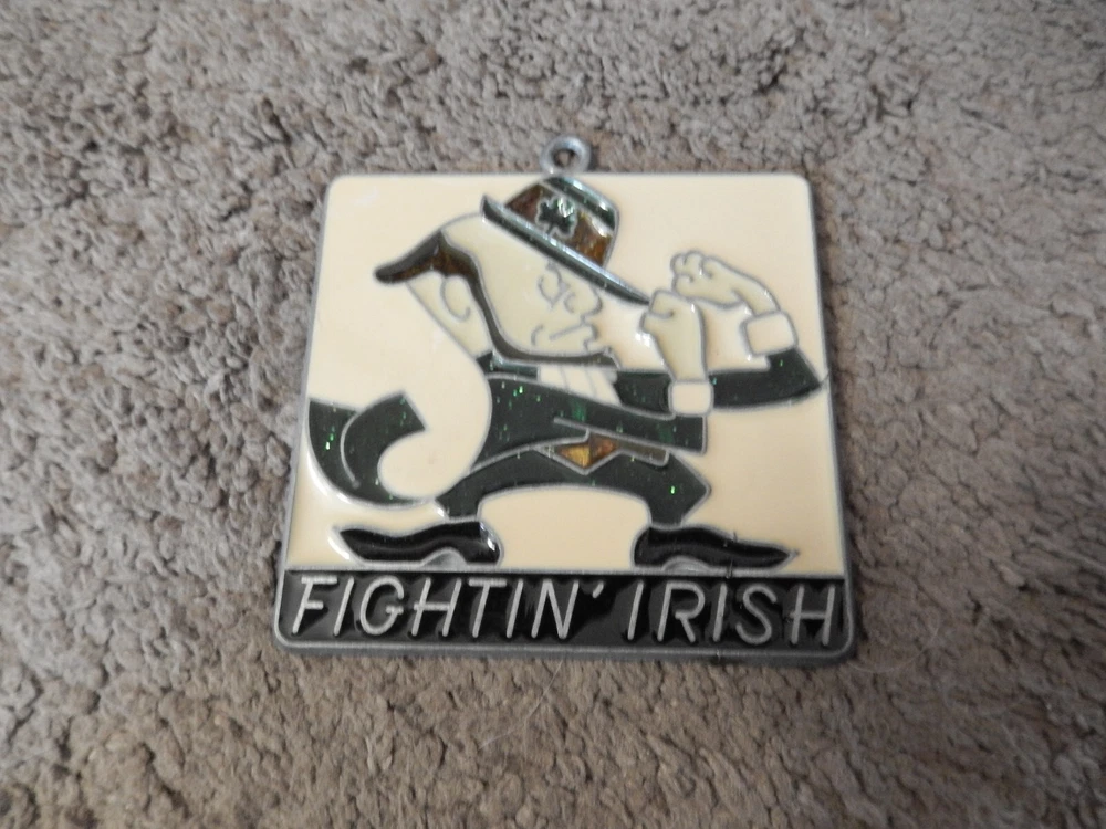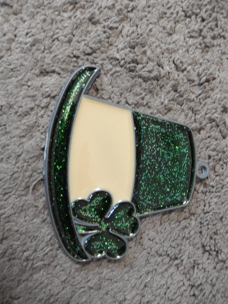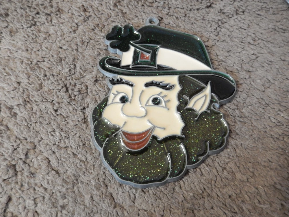 Add some vintage charm to your holiday decor with this set of four faux stained glass ornaments. These Irish-themed plastic sun catchers feature a lephrecaun, a lephrechaun hat, a map of Ireland, and a Notre Dame Fighting Irish ornament. all in less than 5 inches in height. The colorful multicolor designs are perfect for St. Patrick's Day or any occasion that calls for a touch of whimsy. Measuring at approx 4 inches in length, these medium-sized ornaments are sure to catch the eye of any visitor. Whether you're looking to decorate your home or add to your collection, these Irish-themed ornaments are a must-have. Celebrate the holiday season in style with these charming faux stained glass ornaments. THESE ORNAMENTS ARE IN EXCELLENT CONDITION, NO CHIPS, CRACKS, OR BREAKS. THEY ARE ALL GLITTERED IN SPOTS. THEY MEASURE BETWEEN 3'' AND 4'' IN LENGTH AND WIDTH. NICE GROUPING MESSAGE ANY OTHER QUESTIONS AND THANKS FOR LOOKING