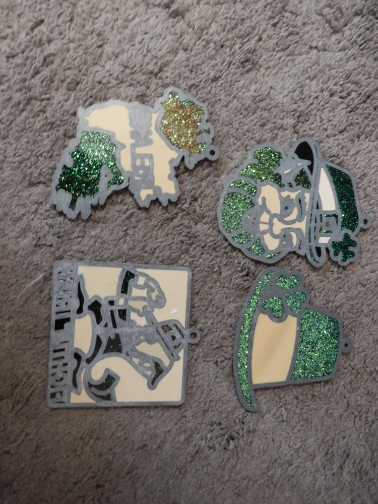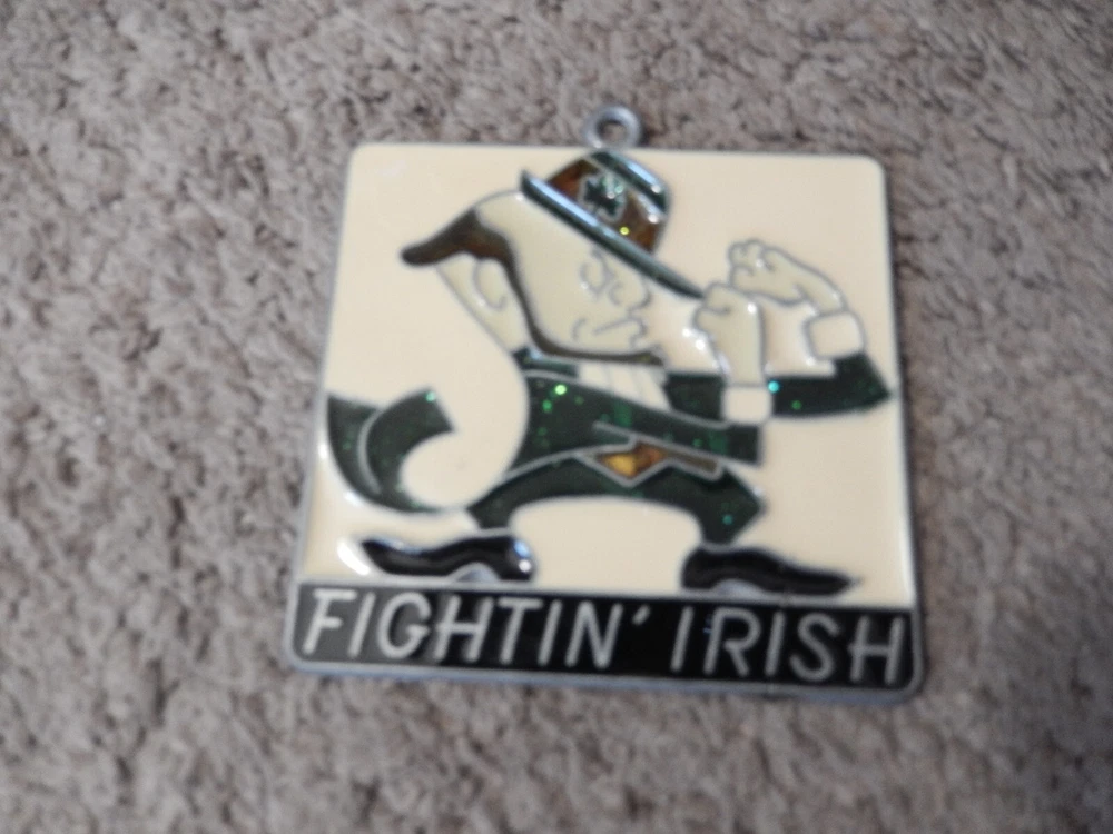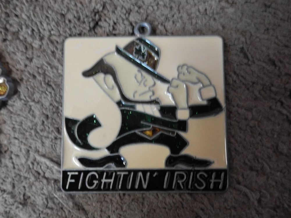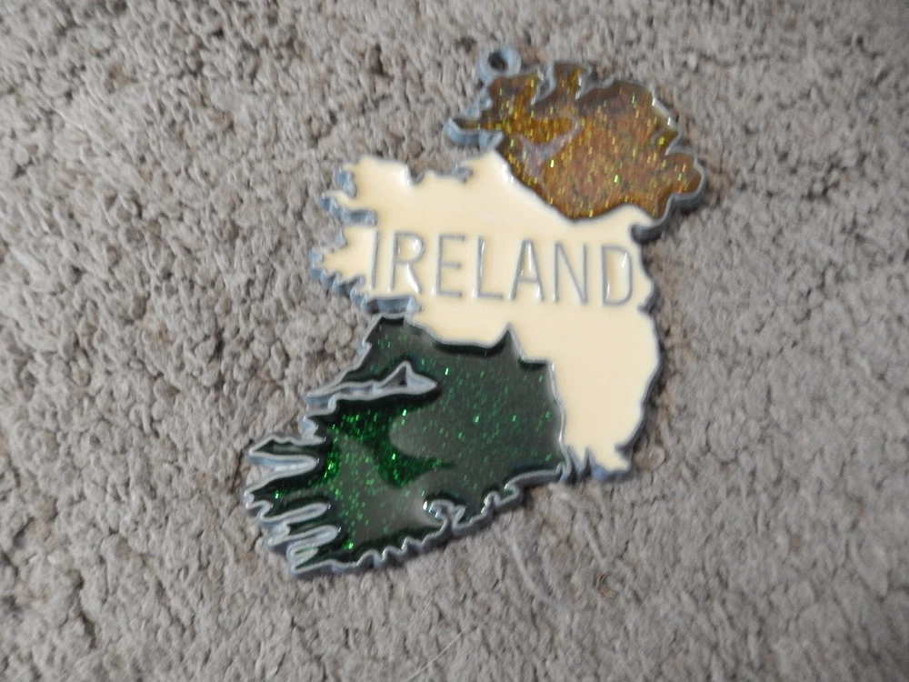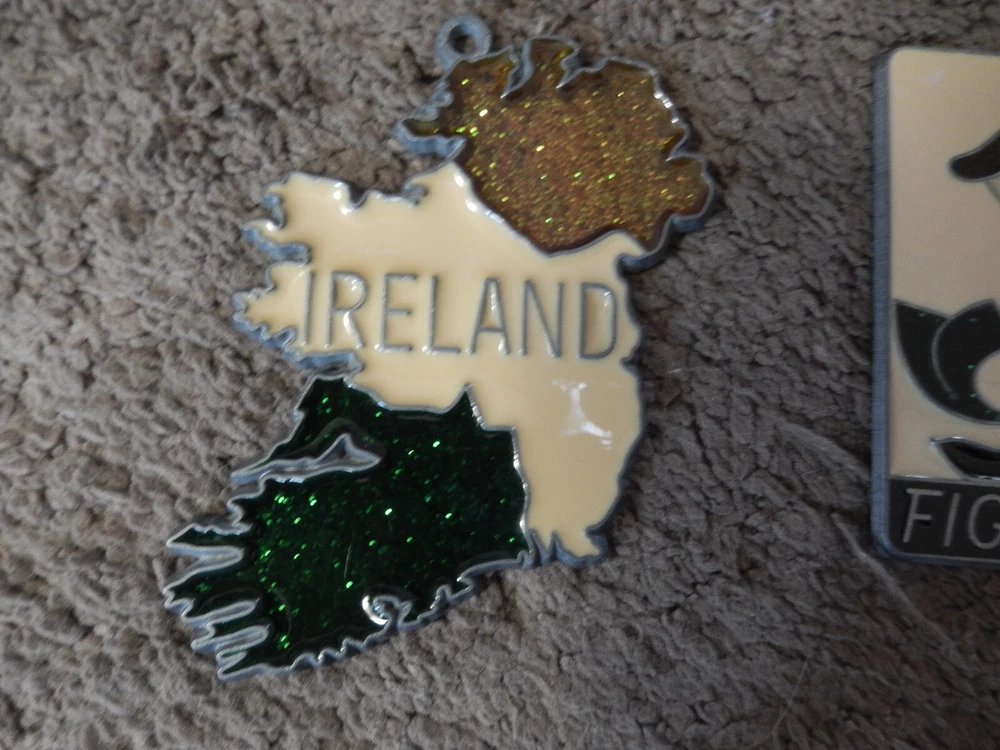 Add some vintage charm to your holiday decor with this set of four faux stained glass ornaments. These Irish-themed plastic sun catchers feature a lephrecaun, a lephrechaun hat, a map of Ireland, and a Notre Dame Fighting Irish ornament. all in less than 5 inches in height. The colorful multicolor designs are perfect for St. Patrick's Day or any occasion that calls for a touch of whimsy. Measuring at approx 4 inches in length, these medium-sized ornaments are sure to catch the eye of any visitor. Whether you're looking to decorate your home or add to your collection, these Irish-themed ornaments are a must-have. Celebrate the holiday season in style with these charming faux stained glass ornaments. THESE ORNAMENTS ARE IN EXCELLENT CONDITION, NO CHIPS, CRACKS, OR BREAKS. THEY ARE ALL GLITTERED IN SPOTS. THEY MEASURE BETWEEN 3'' AND 4'' IN LENGTH AND WIDTH. NICE GROUPING MESSAGE ANY OTHER QUESTIONS AND THANKS FOR LOOKING