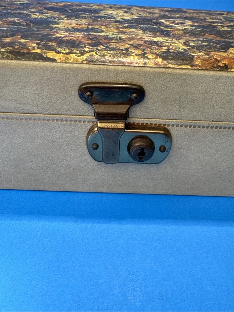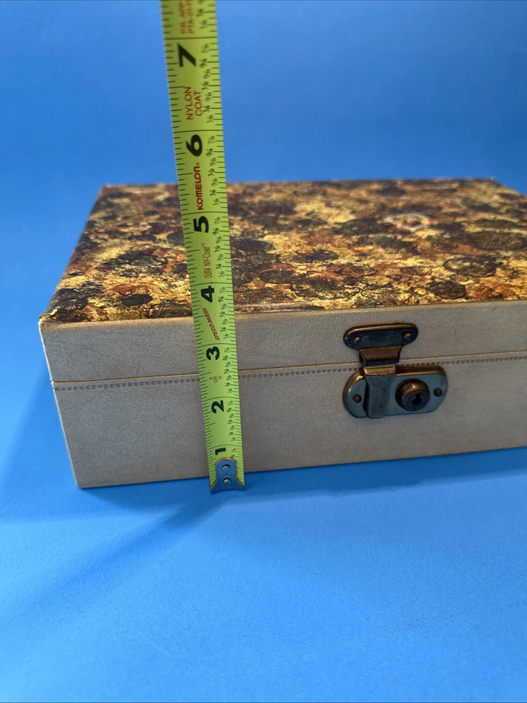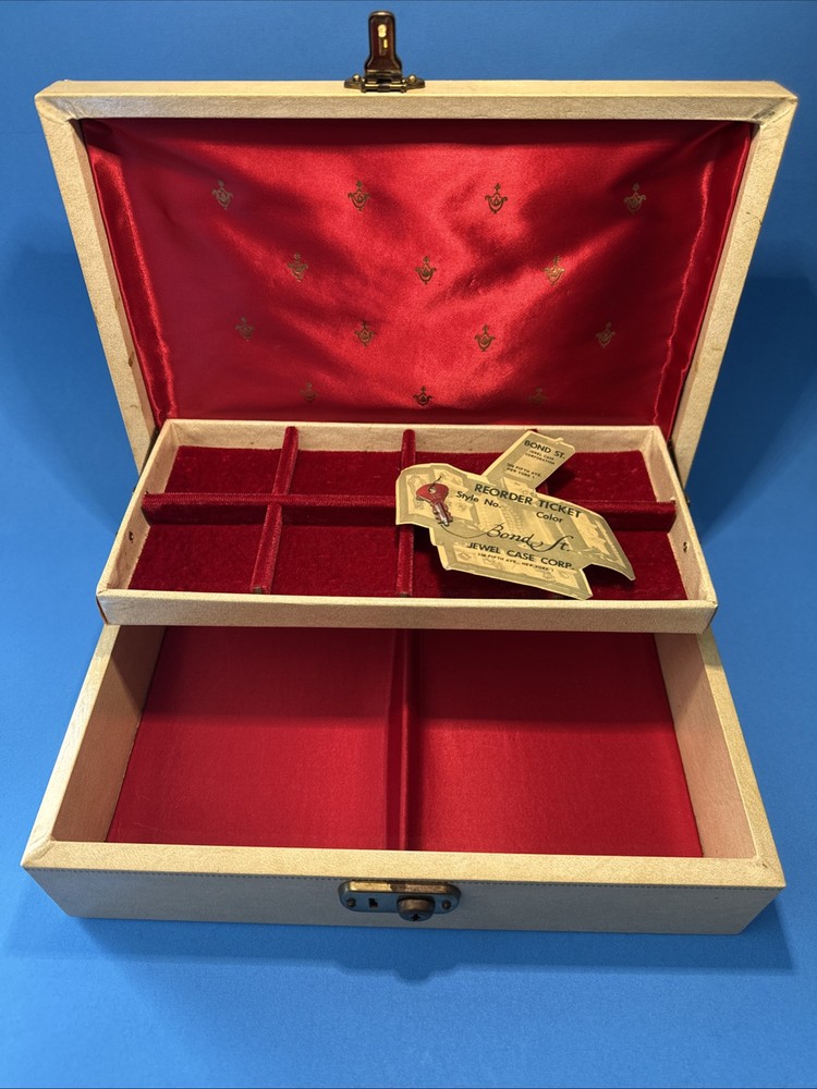 This vintage jewelry box from Bond St. Jewel Case Corp is the perfect organizer for all your precious jewelry. The faux tortoise shell & cream color with red velvet and satin lining adds a touch of retro elegance to your collection. The box features a pop-up tray and lock, making it easy to keep your items safe and secure. Made with faux leather, wood, and velvet, this jewelry box is suitable for necklace, bracelet, ring, anklet, cufflinks, earring, and body jewelry. The rectangular shape and original key make it a unique addition to your collection. This jewelry box is perfect for unisex adults and was made in the United States.