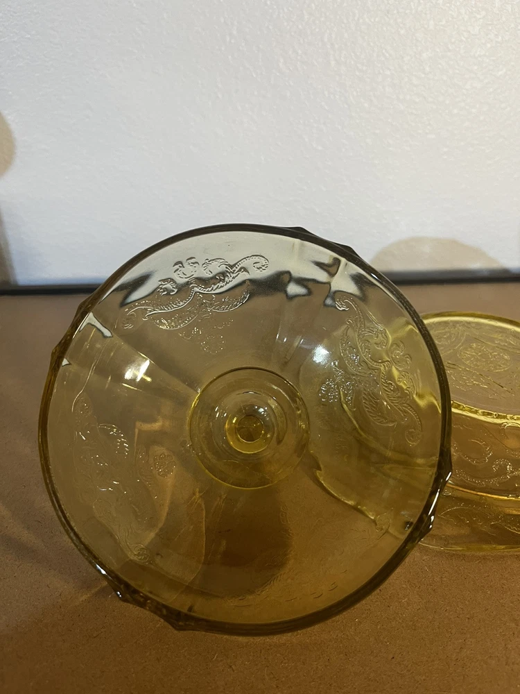 This is a vintage Federal Glass butter dish in the Madrid pattern from the American Home Collection. Made of depression glass in an amber color, this Federal piece showcases a classic American design. Perfect for collectors of glassware, this butter dish exudes a Federal style and is a charming addition to any kitchen or dining room.