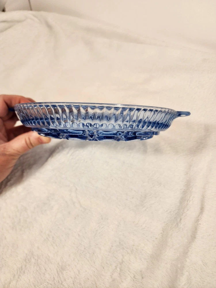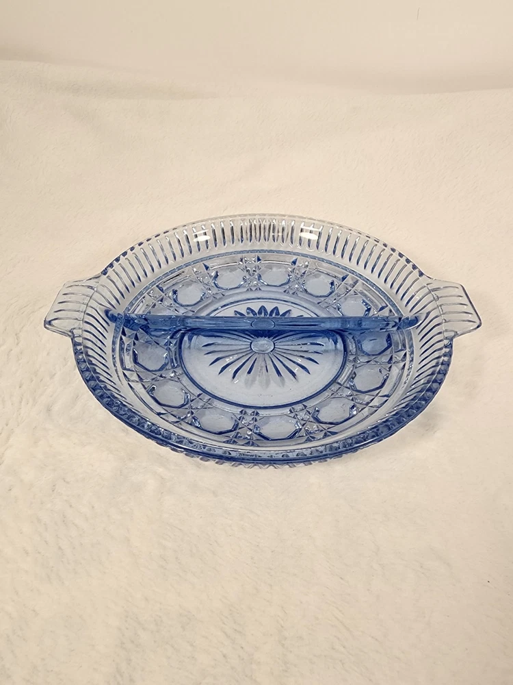 Enhance your serving collection with the classic elegance of the Federal Glass Windsor blue glass divided relish candy dish. This round piece, measuring 8.5 inches in length and 1 inch in depth, is a testament to timeless design, featuring an all-over pattern that catches the eye. Its two compartments allow for a neat presentation of your sweets or condiments, making it a practical addition to any table setting. Crafted in the United States during the 1970s, this original, pressed glass dish reflects the quality and style of the era. With a glossy finish and a color that's as vibrant today as it was back then, this dish is a beautiful piece for both use and display. Please note, to maintain its vintage beauty, hand washing is recommended for this item. please note the last pic for condition. tiny chip on handle.