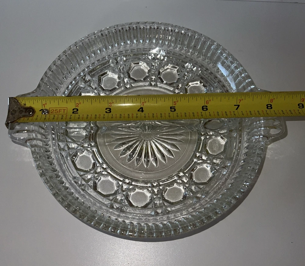 The vintage Federal Indiana Glass Windsor-Button and Cane-Divided Relish plate was manufactured in the United States in 1940. This clear glass relish plate features the Windsor pattern and is a part of the Windsor product line. The design showcases button and cane motifs, reflecting the elegant style of the 1940s. Ideal for serving relish or other condiments, this piece adds a touch of nostalgia and sophistication to any table setting.