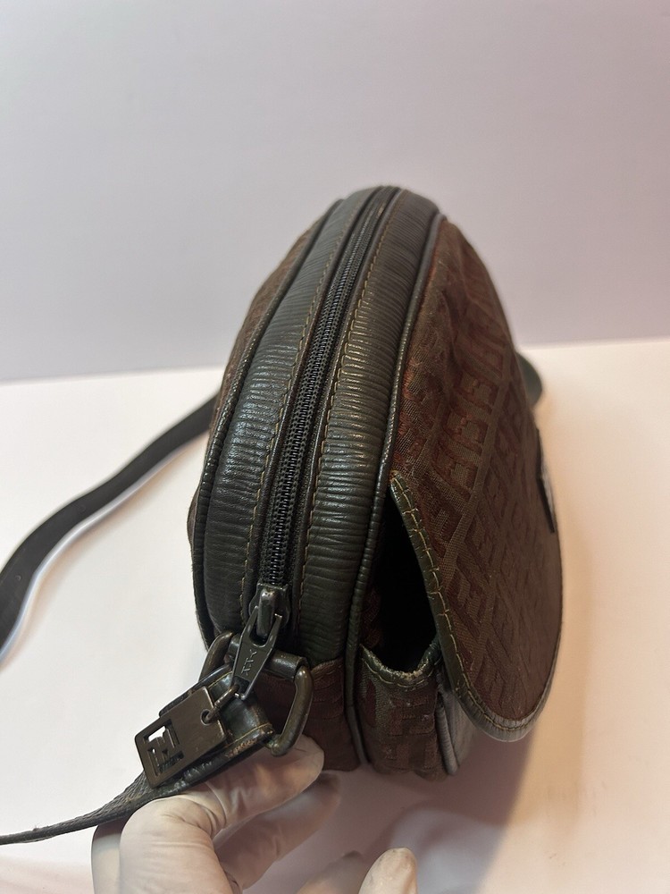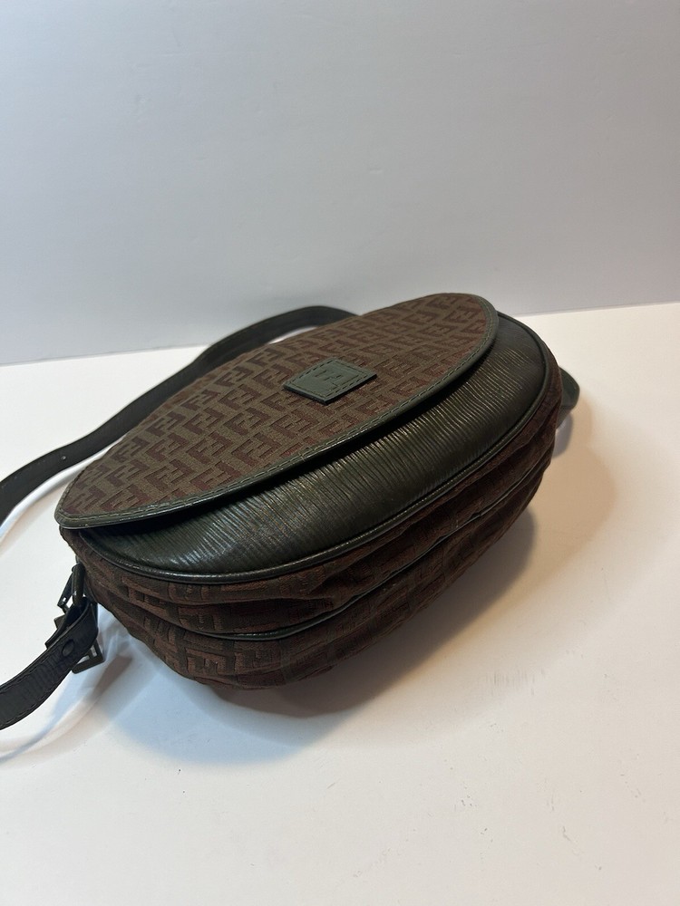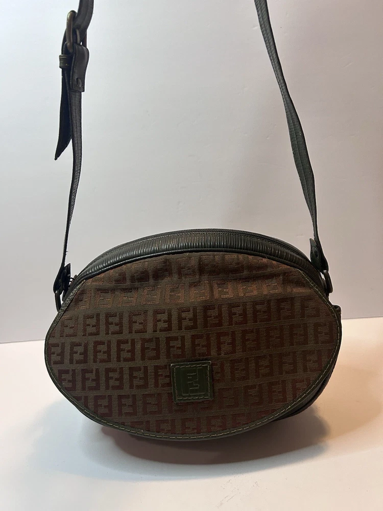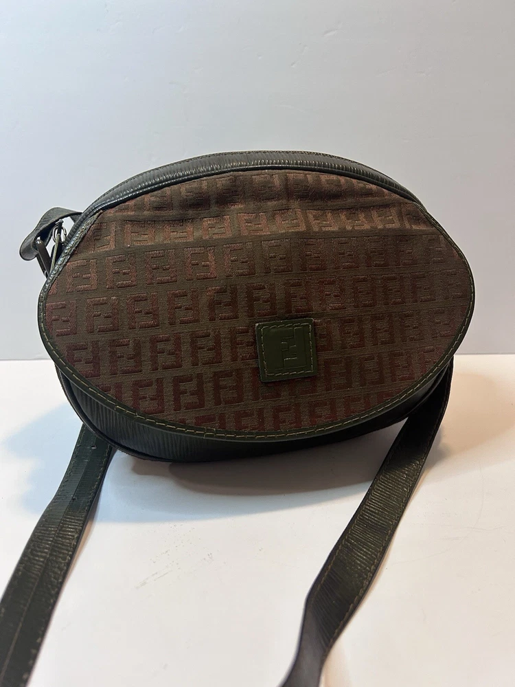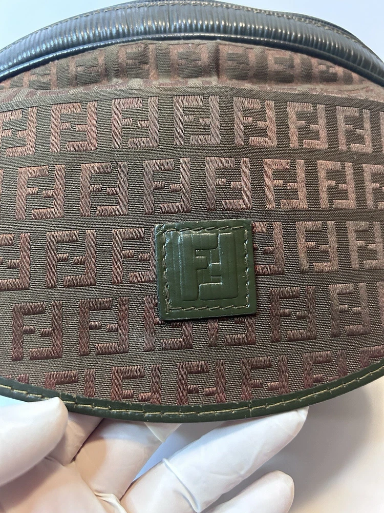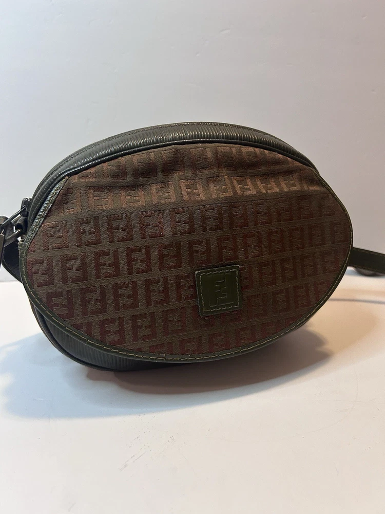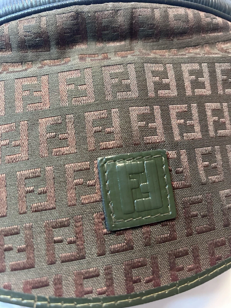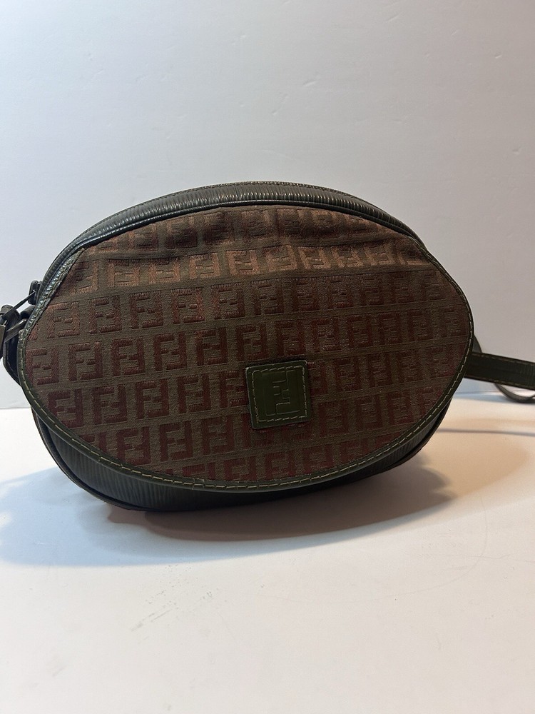 This Fendi shoulder bag is a vintage piece with a beautiful green and oxblood exterior color. It features a unique monogram pattern, brass hardware, and a shoulder strap made of leather. The bag has a zip and snap closure, with inner pockets and a lined interior. It also comes with a bag charm . The bag is medium-sized, with a width of 10 inches, a height of 7 inches, and a depth of 3 inches. The fabric type is knit, and the lining material is leather. The bag is not handmade, and it was manufactured in Italy. This Fendi shoulder bag is a classic designer piece, perfect for casual occasions. The bag is in excellent condition… some folding on bottom and strap but body in good condition. Inside some scratches on leather and tag from brand name is almost gone . I have a certificate of authenticity included.