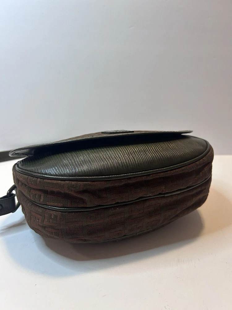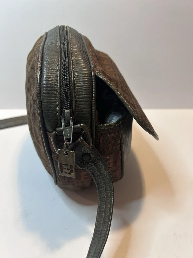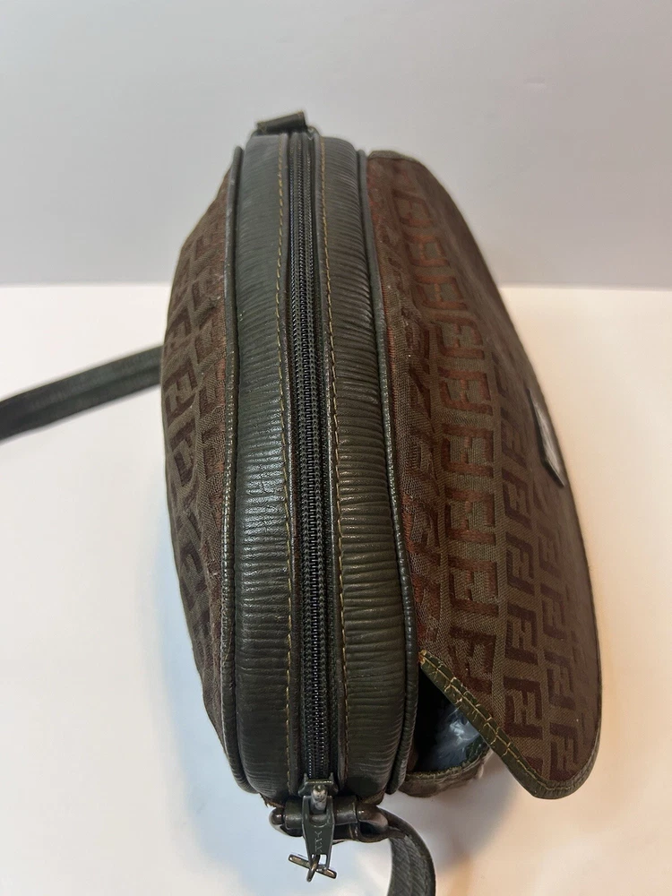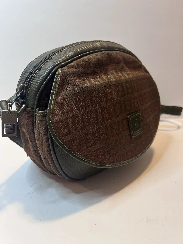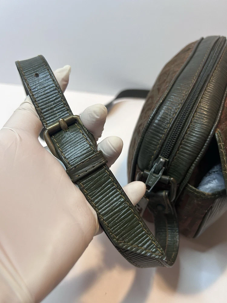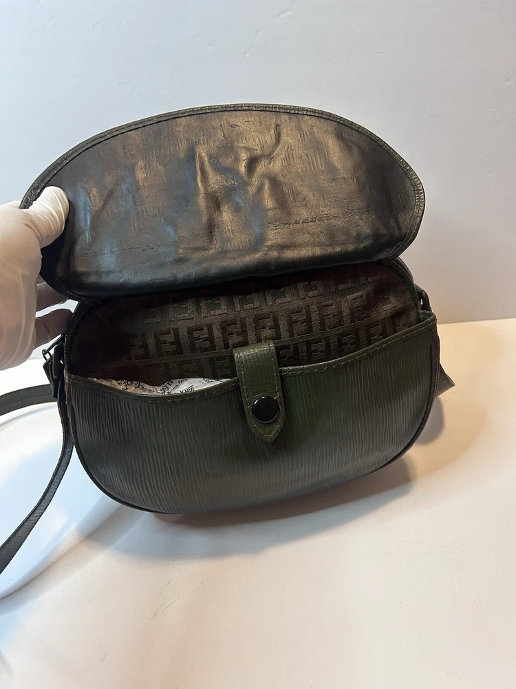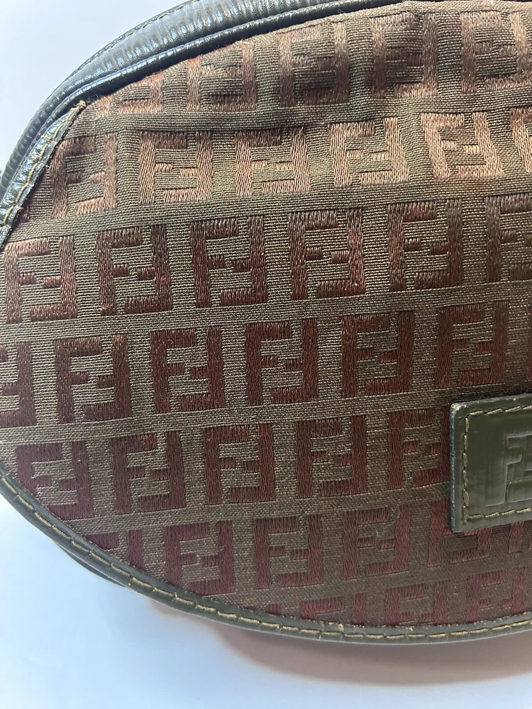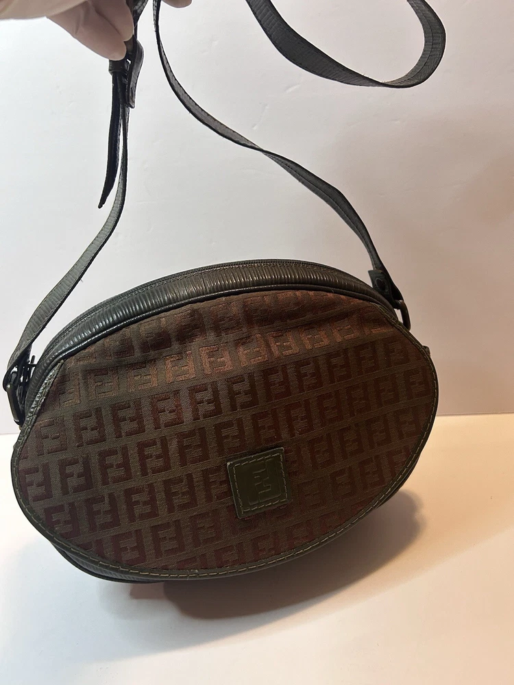 This Fendi shoulder bag is a vintage piece with a beautiful green and oxblood exterior color. It features a unique monogram pattern, brass hardware, and a shoulder strap made of leather. The bag has a zip and snap closure, with inner pockets and a lined interior. It also comes with a bag charm . The bag is medium-sized, with a width of 10 inches, a height of 7 inches, and a depth of 3 inches. The fabric type is knit, and the lining material is leather. The bag is not handmade, and it was manufactured in Italy. This Fendi shoulder bag is a classic designer piece, perfect for casual occasions. The bag is in excellent condition… some folding on bottom and strap but body in good condition. Inside some scratches on leather and tag from brand name is almost gone . I have a certificate of authenticity included.