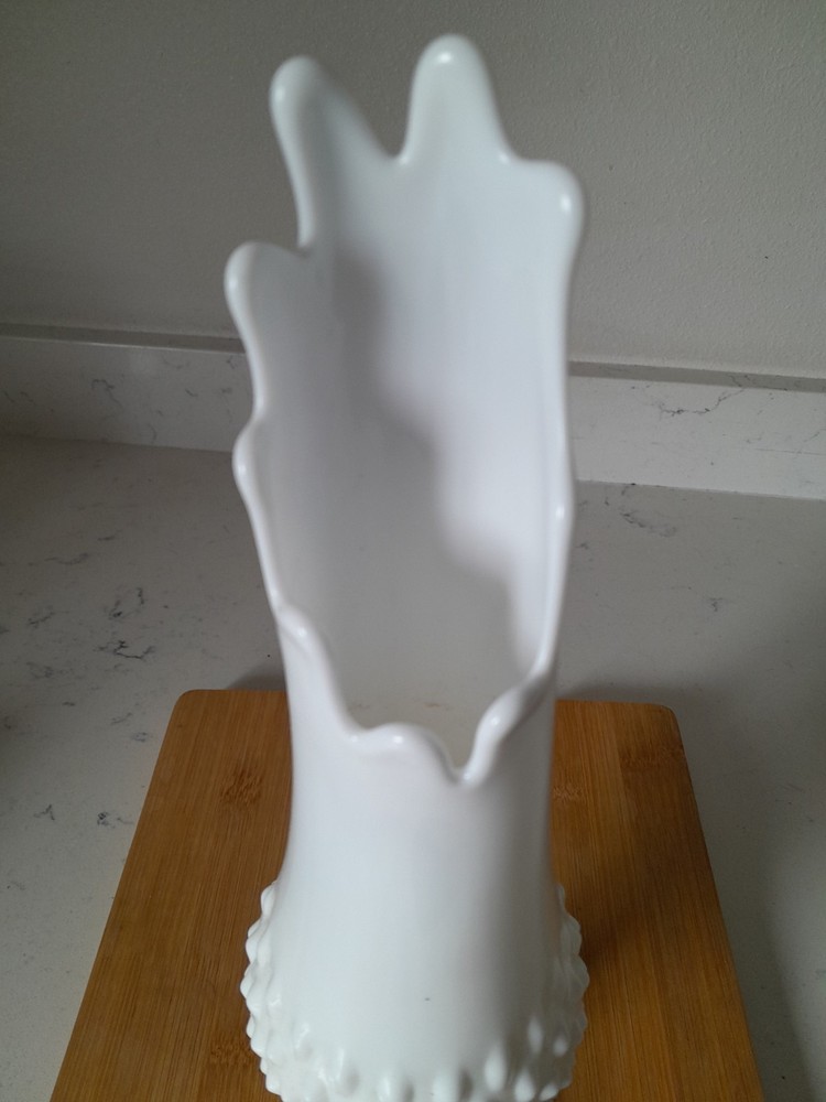 This vintage Fenton 13" pedestal milk glass swung stretch vase in hobnail style is a beautiful and unique piece of decorative pottery. The white glass vase features a glossy finish and a distinctive swung glass pattern, with a production technique of fused glass. Made in the United States, this original piece exudes an abstract theme and is a perfect addition to any collection of vintage glassware. Beautiful Condition