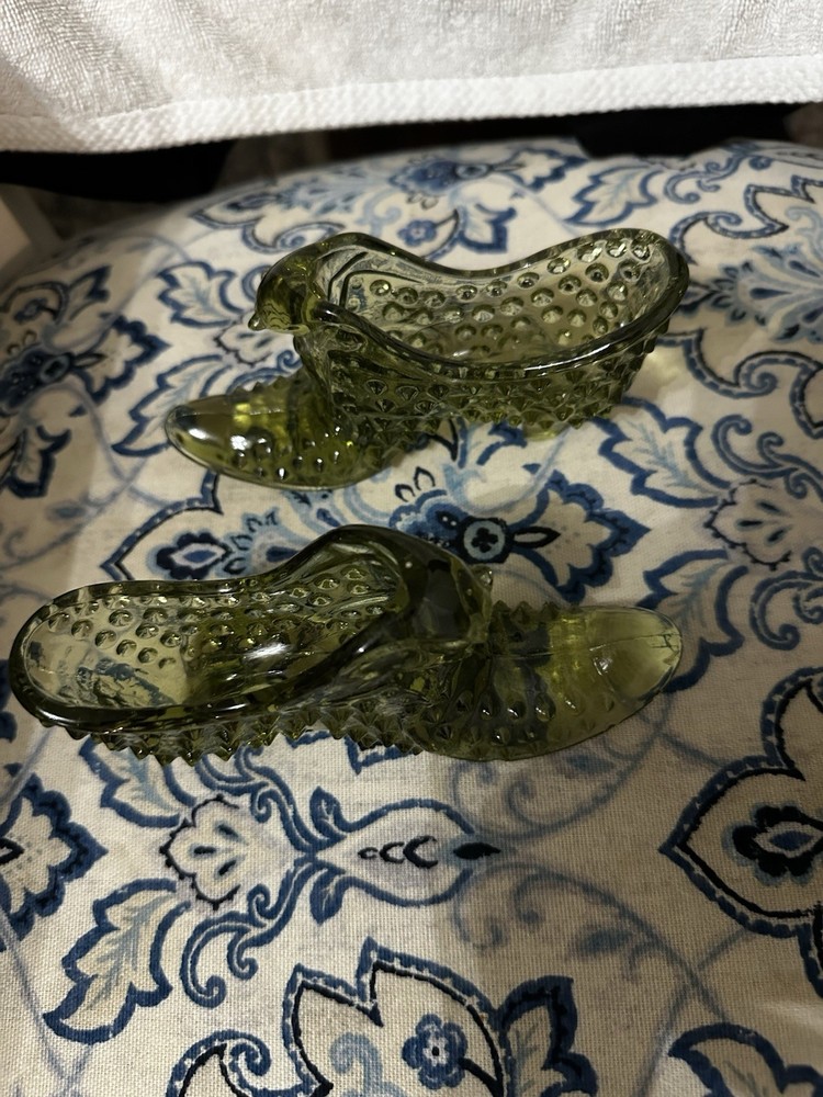 The Vintage Fenton Art Glass Olive Green Hobnail Cat Head Shoe Slipper Heel Boot is a Victorian-style figurine featuring a decorative shoe slipper design. Made of art glass in the United States in the 1970s, this original piece stands at 6 inches long and 3 inches tall, with a glossy finish. The elegant and unique design, with a cat head detail on the heel, makes it a charming and collectible item for those interested in vintage glassware and artisanal pieces. Set of 2