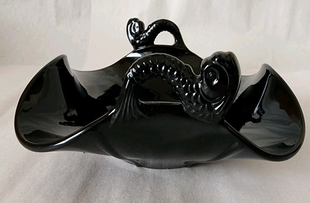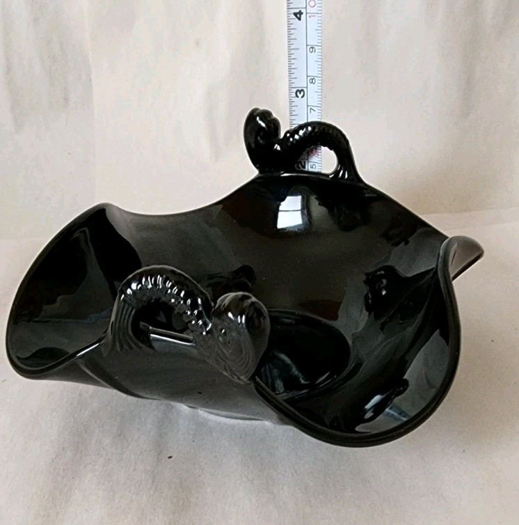 This vintage Fenton trinket dish is a stunning piece of black amethyst glass with a glossy finish. The dish has a square shape with a waved edge and double handles, making it perfect for use as a candy dish or for holding small items such as jewelry. Measuring 2.5 inches in height and 6 inches in width, this dish is compact yet versatile. Crafted with care and precision, this Fenton dish features a production style of amethyst glass and is made of high-quality glass material. Its vintage charm is undeniable, making it a unique addition to any collection or home decor. This dish is perfect for those who appreciate the beauty and craftsmanship of vintage glassware.