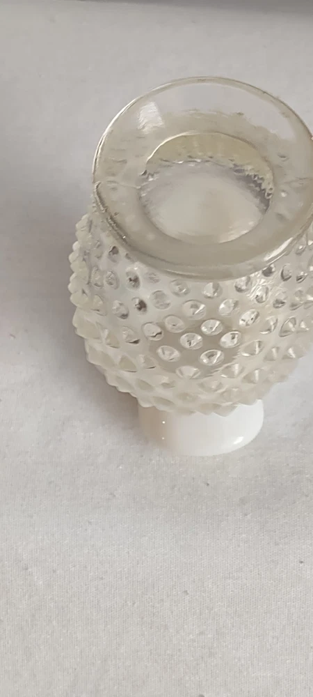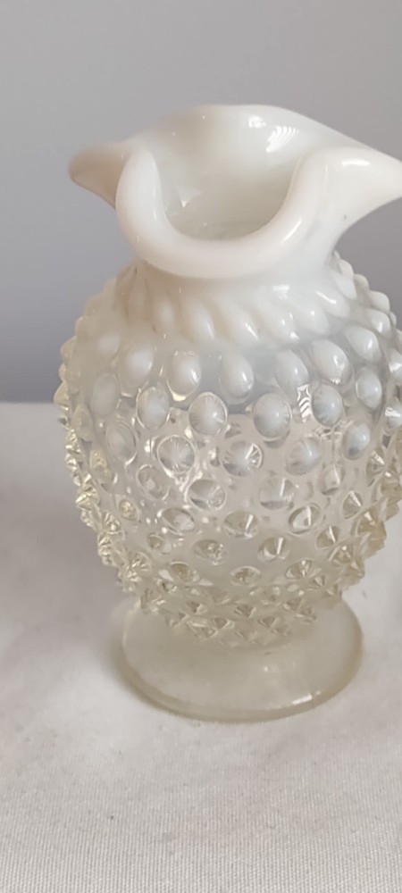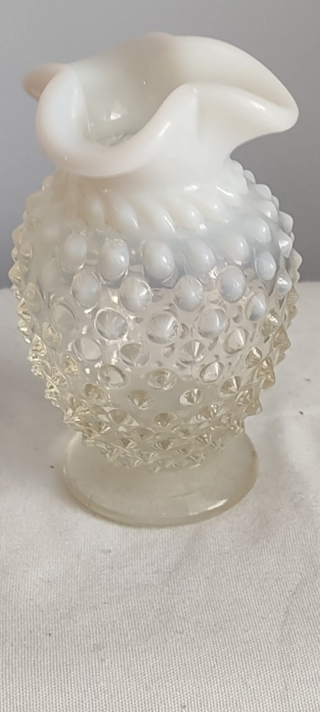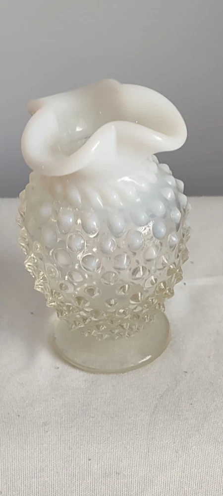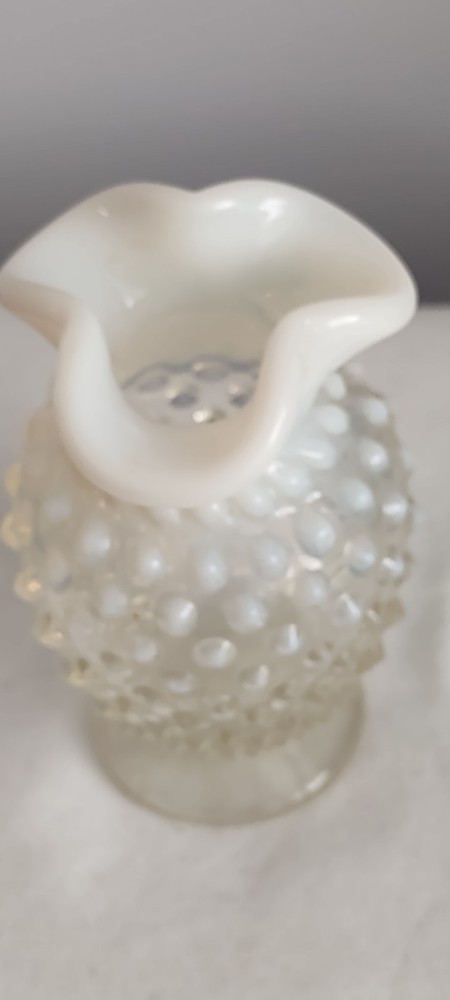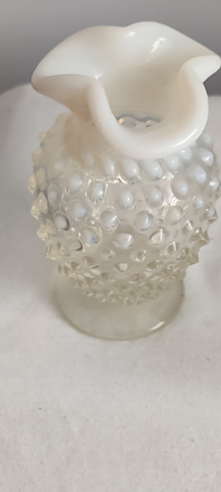 This is a Beautiful Vintage Fenton White Clear Small Vase. The measurements are approx 3.75 inches tall and 2.75 inches . The top of the vase is a white ruffled one very nice. Excellent Vintage Condition. No Chips, No Cracks. Smoke Free Home.