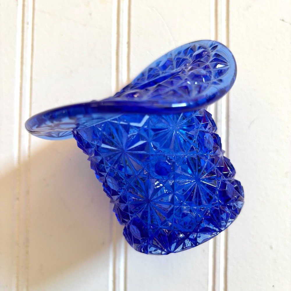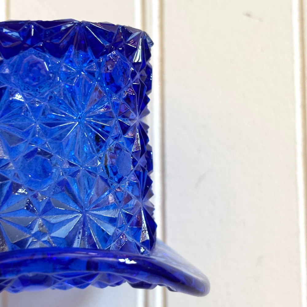 Fenton Cobalt Blue Top Hat Toothpick Holder, Glass Daisy and Button Pattern for holding Cigarettes, Matches, Votive Candles or whatever you can dream up! This fancy blue glass gem stands 2 1/2 inches high and 3 inches across. Just a stunner!