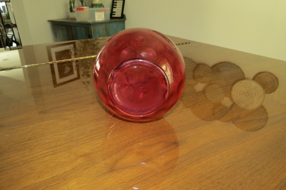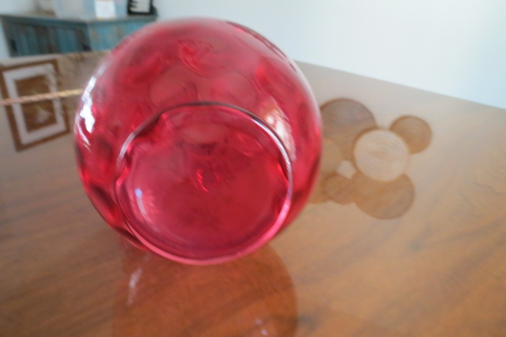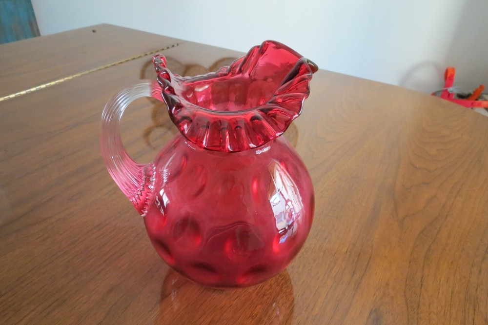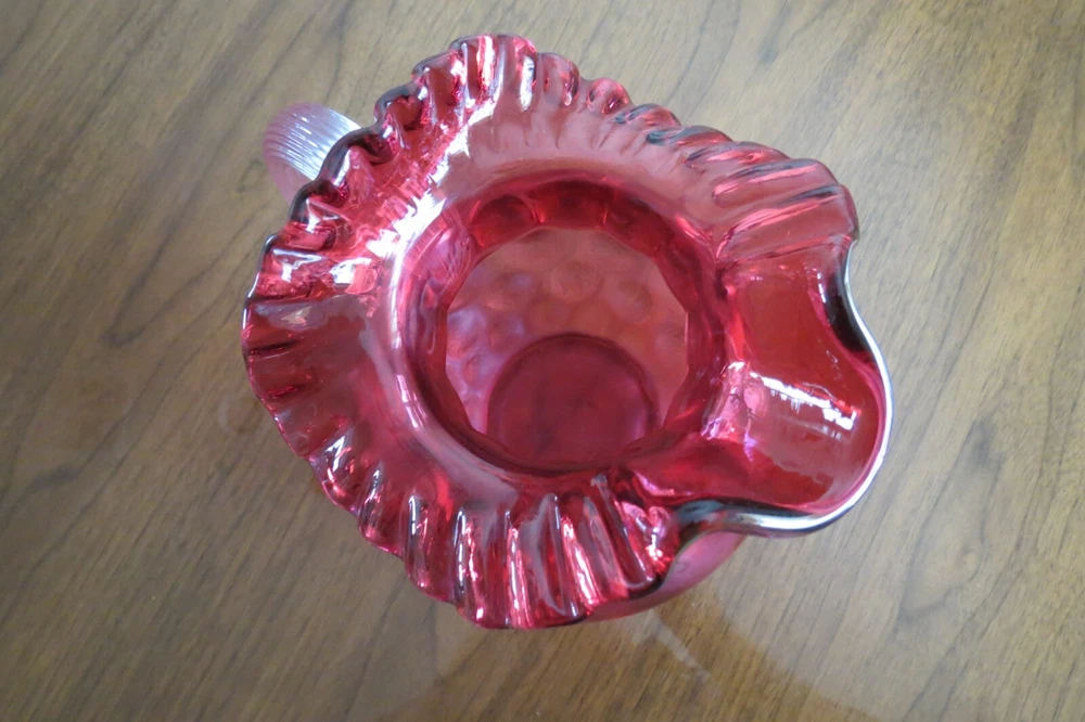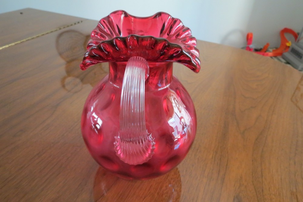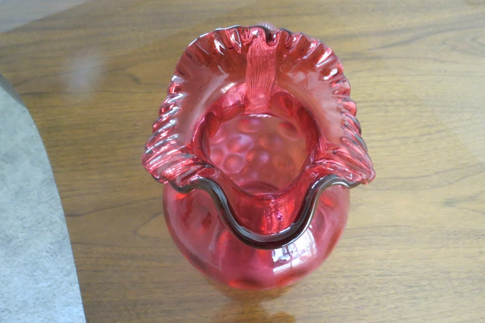 Elevate your home decor with the Fenton Cranberry Water Picture vase, an exquisite piece of art glass that marries functionality with aesthetic appeal. The rich cranberry hue cascades the vase's surface, complementing any room with a touch of vintage elegance. Crafted from high-quality glass, this vase showcases the timeless beauty of Fused Glass techniques, ensuring a seamless blend of durability and intricate design.Renowned for their exceptional craftsmanship, the Fenton brand stands as a testament to the vase's authenticity and artistic merit. Whether displayed alone as a statement piece or used to showcase your favorite blooms, this vase promises to be a captivating addition to your collection or a thoughtful gift for someone who appreciates the finer things. No chips or cracks, inside of pitcher has some water stains.