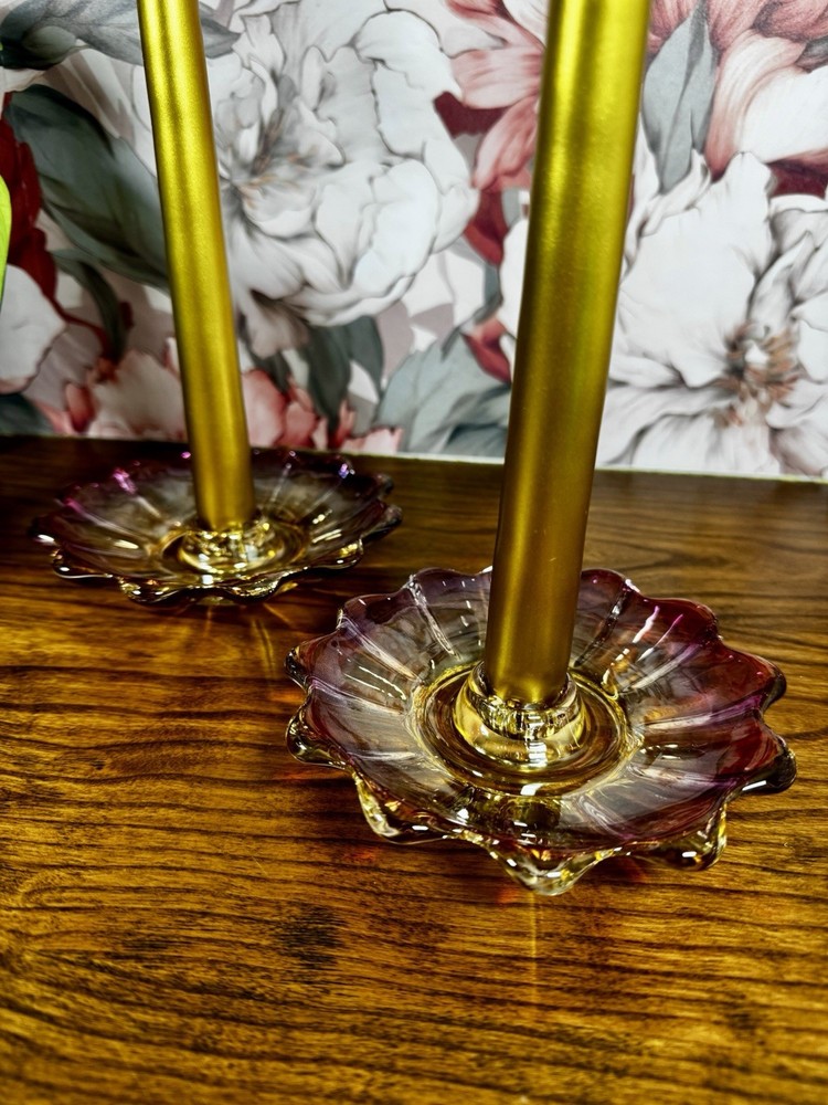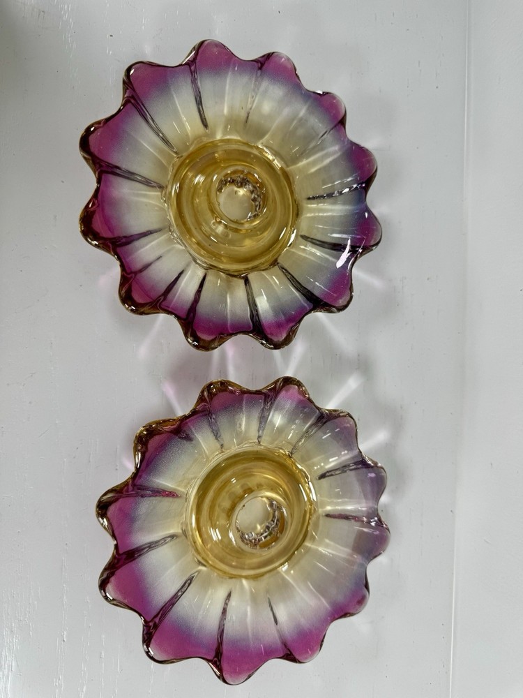 Beautiful pair of vintage Fenton cranberry opalescent glass candle bobeches featuring softly ruffled edges and a classic pink-to-opalescent fade with warm amber centers. Designed to catch wax drips beneath taper candles, these mid-century glass bobeches also serve as elegant decorative accents when paired with brass, crystal, or traditional candlesticks. Perfect for collectors replacing missing original bobeches or anyone styling romantic vintage tablescapes. Details: • Approx. 5” diameter • Approx. 1” tall • Fits standard taper candles • Matching pair included Unmarked example consistent with earlier Fenton production prior to logo usage. Carefully packed for safe shipping. replacement bobeche candle drip tray cranberry glass pink opalescent ruffled glass vintage candle accessory fenton replacement part ⭐ Kerby Curates No junk. Just gems. Feel free to reach out with any questions — happy to help!