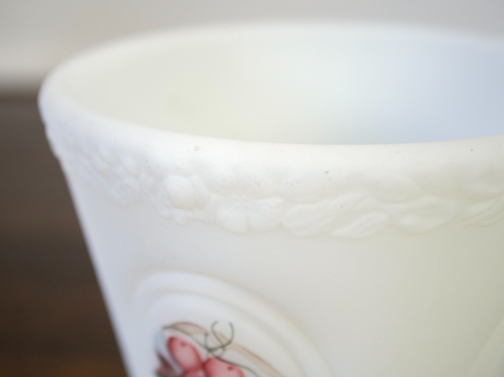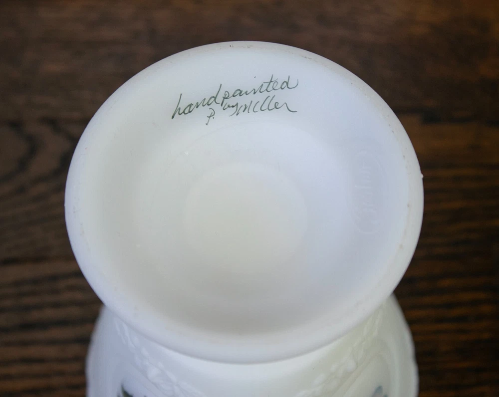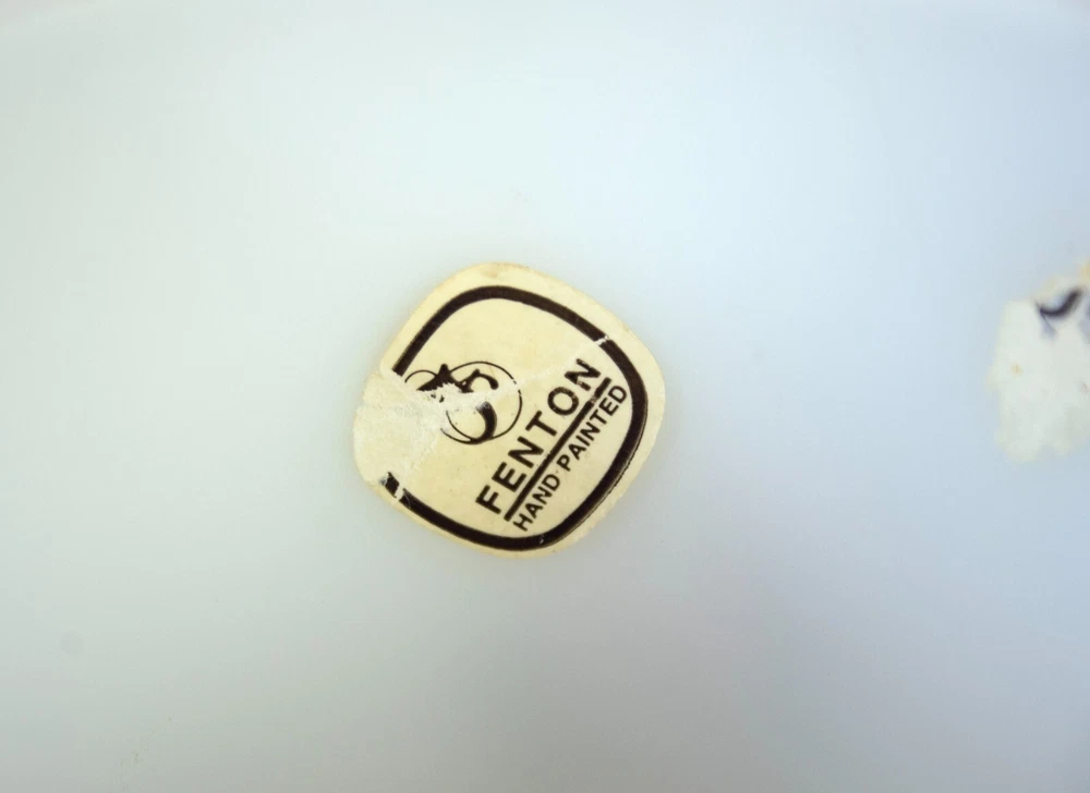 Lovely vintage Fenton white satin glass pedestal candy dish with no lid and hand-painted details. The hand painting is placed in pressed oval cameos with little berry/cherry clusters around the dish. There is a Fenton sticker on the interior, The Fenton logo is pressed into the bottom with the artist's signature painted. The dish is in good condition with no chips or cracks. The pedestal dish measures approximately 5.75" tall and 4.25" in diameter.