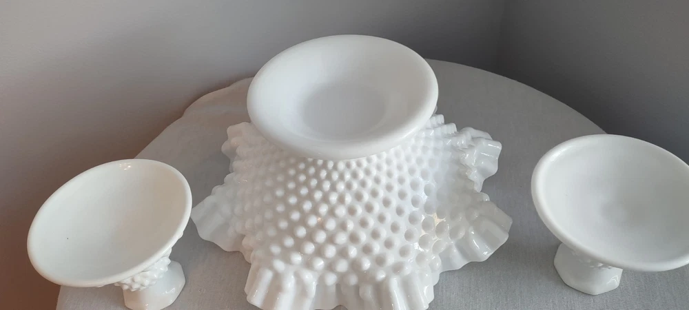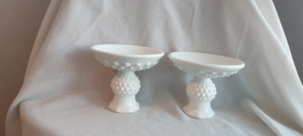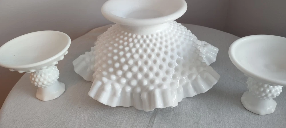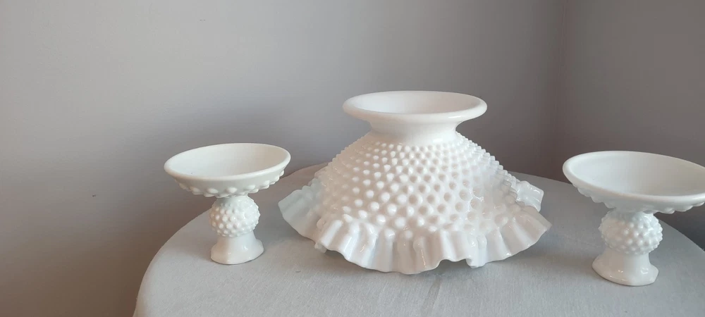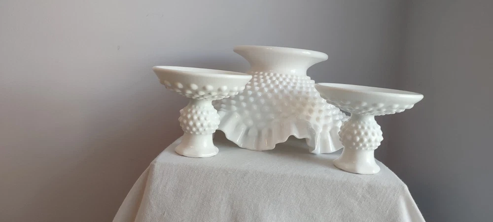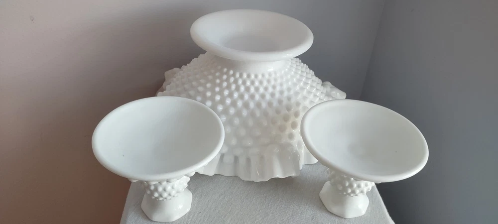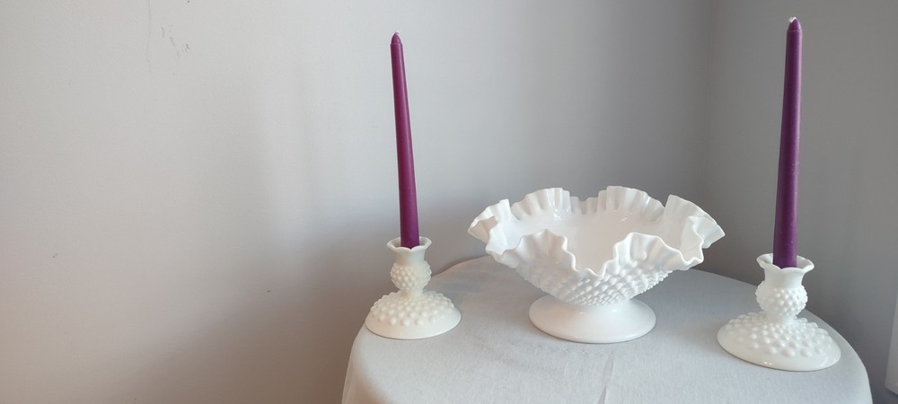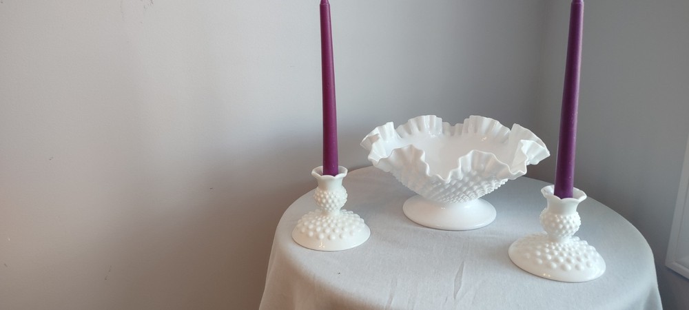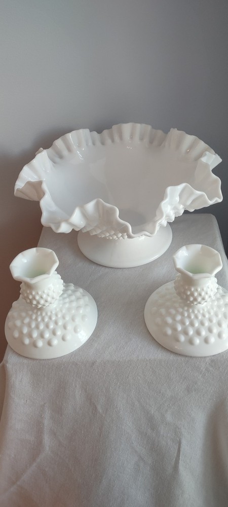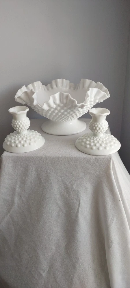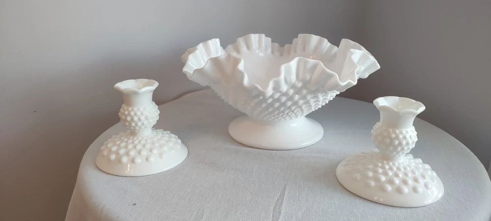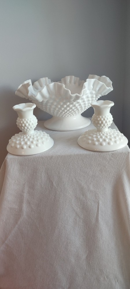 This is a Beautiful Vintage Set of Fenton Milk Glass Hobnail Bowl and 2 matching Candle Holders. The measurements for the bowll are approx 10 inches in diameter and 5 inches tall. The Candle Holders are approx 3 inches tall and the base 4 inches. They are in Very Good Vintage Condition. No Chips, No Cracks, No Scraches. Smoke Free Home