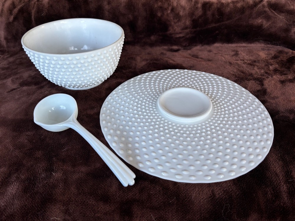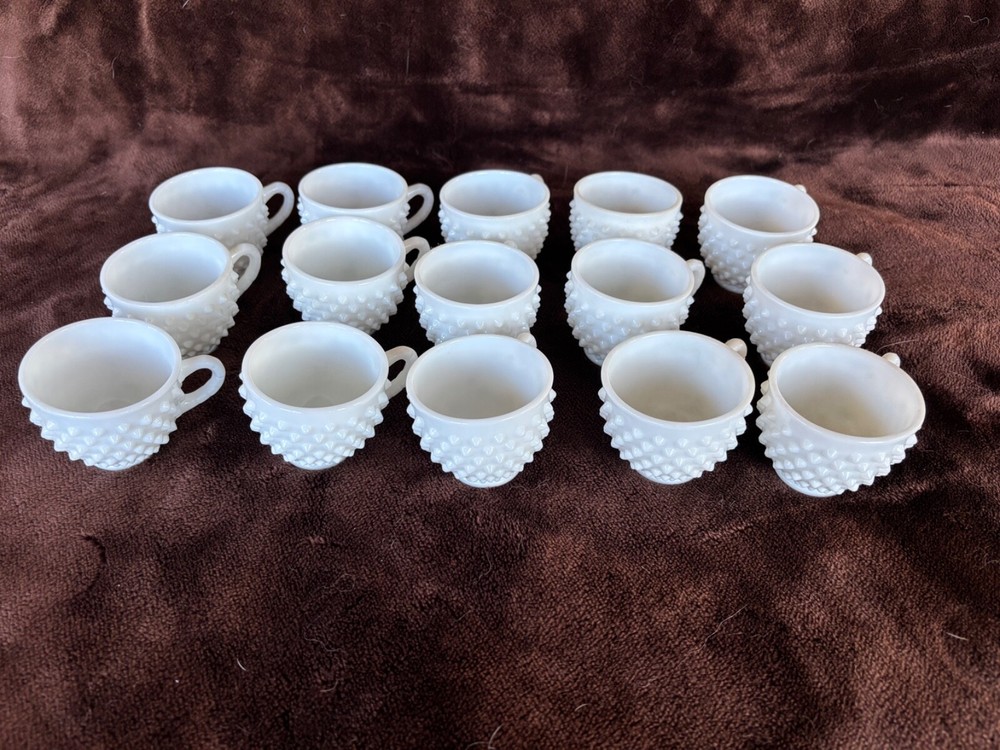 This vintage Fenton Hobnail Milk Glass Punch Bowl Set includes 18 pieces in white milk glass. The set features a classic hobnail pattern and is made of glass. Perfect for serving punch or just as a decorative piece, this set is a timeless addition to any collection. Note: This listing has a lower buy-now price and with substantially more cups than other similar listings on Ebay.