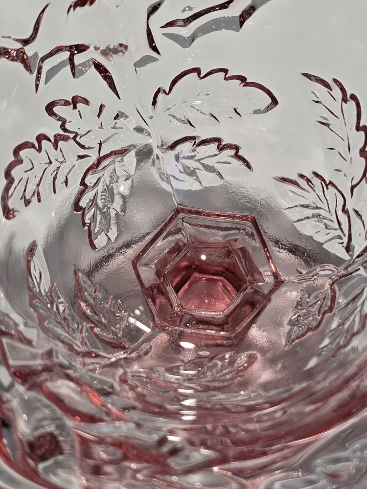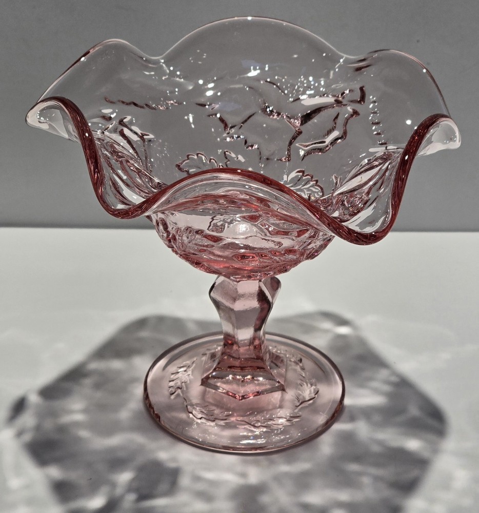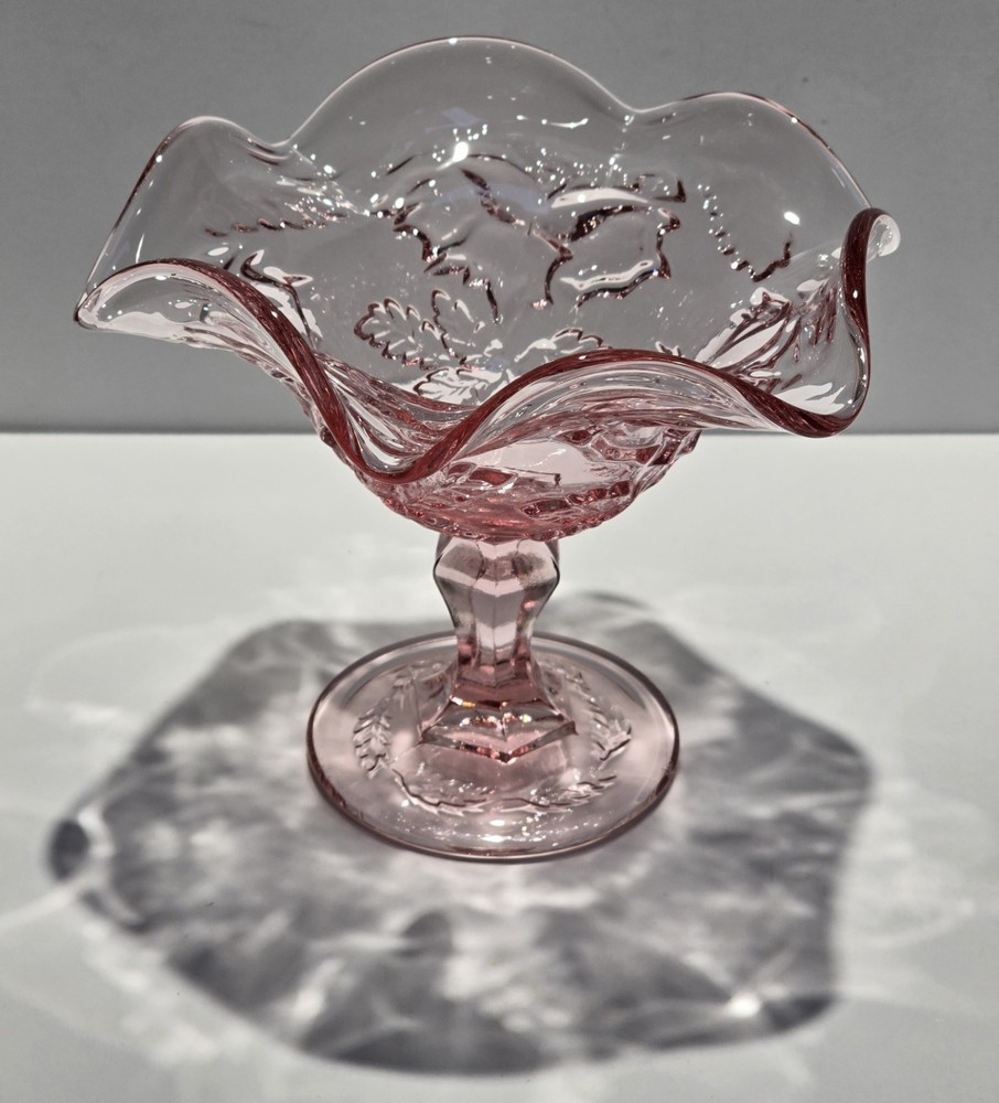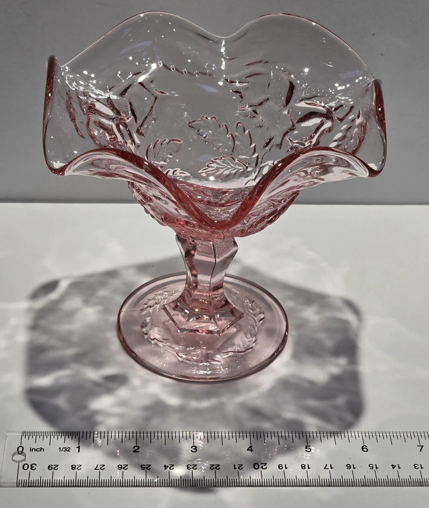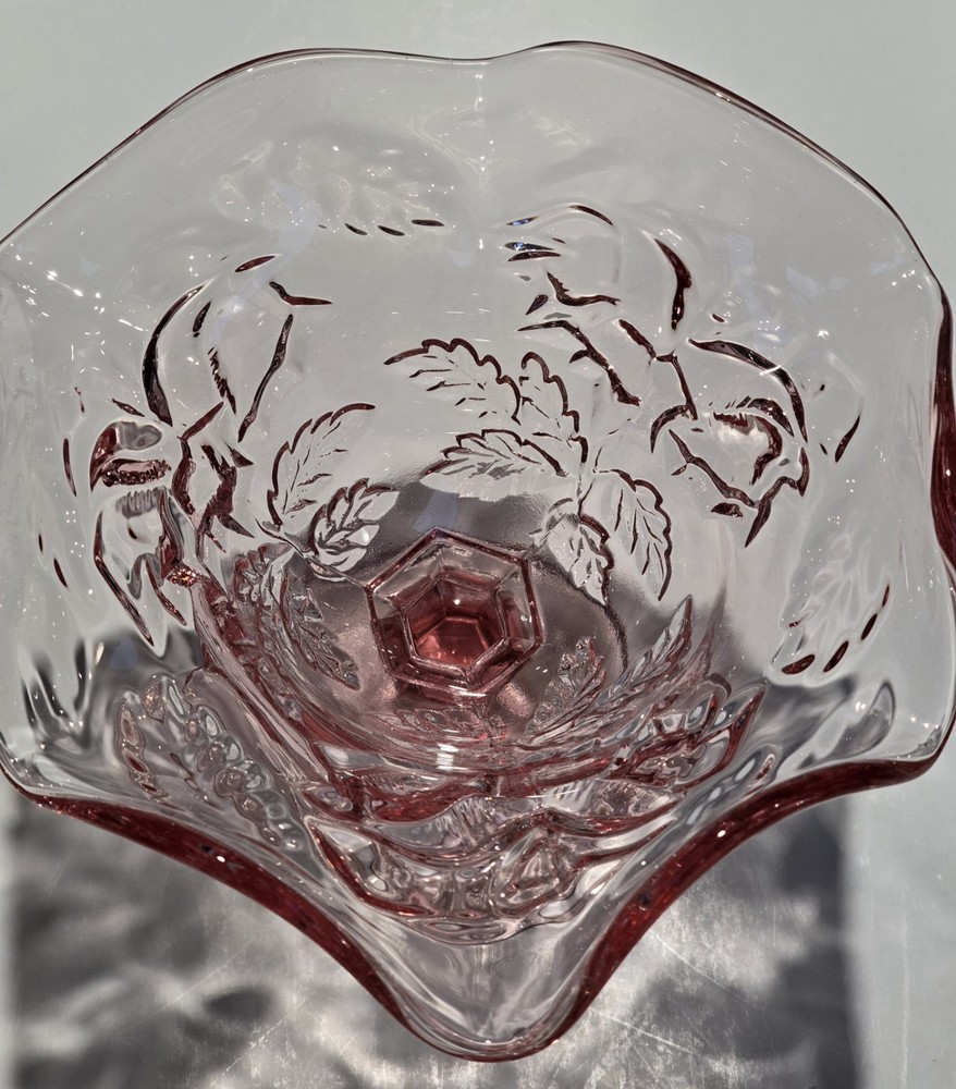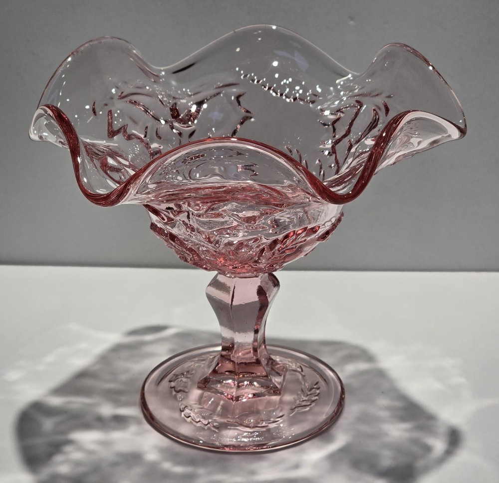 This beautiful vintage mid-20th century glass candy dish features the classic Fenton brand and a lovely pink color with a Wild Rose - Madonna pattern. The dish has a ruffled edge and measures 6.5 inches in diameter and 6 inches in height, perfect for displaying as a decorative piece or serving sweets. The dish is made of glossy fused glass, and the production style is art glass, with a production technique of fused glass. The dish is an original piece from the United States and should be hand washed only. This dish is perfect for those who love vintage glassware and appreciate the beauty of flower-themed decorations. This beautiful item is pre-owned and is in excellent condition with no damage. Please review all the photos and zoom in for condition as they are part of the description. #B