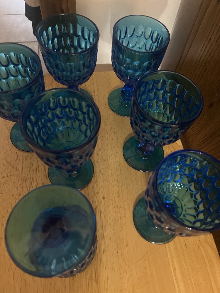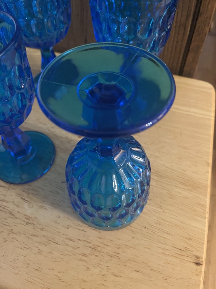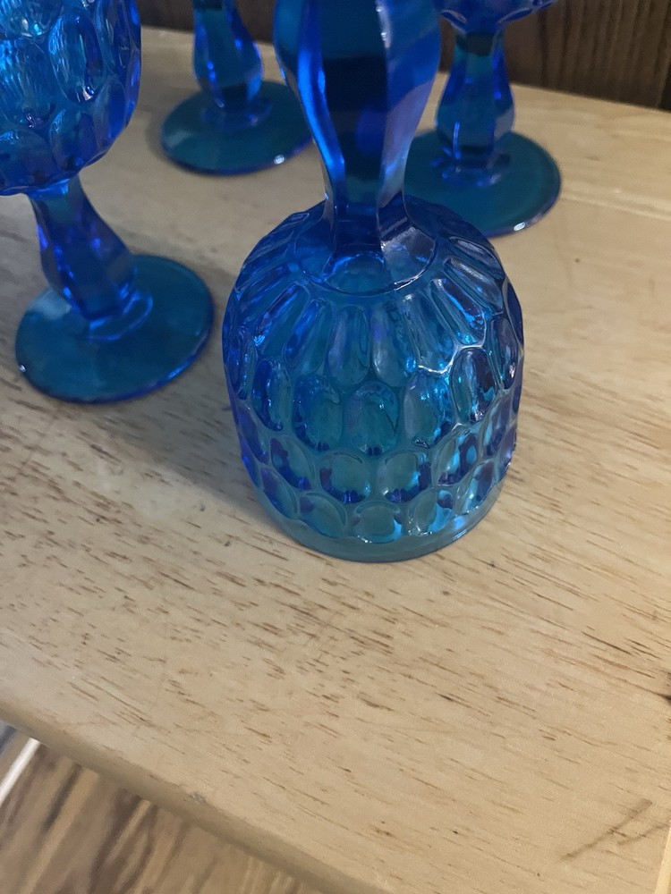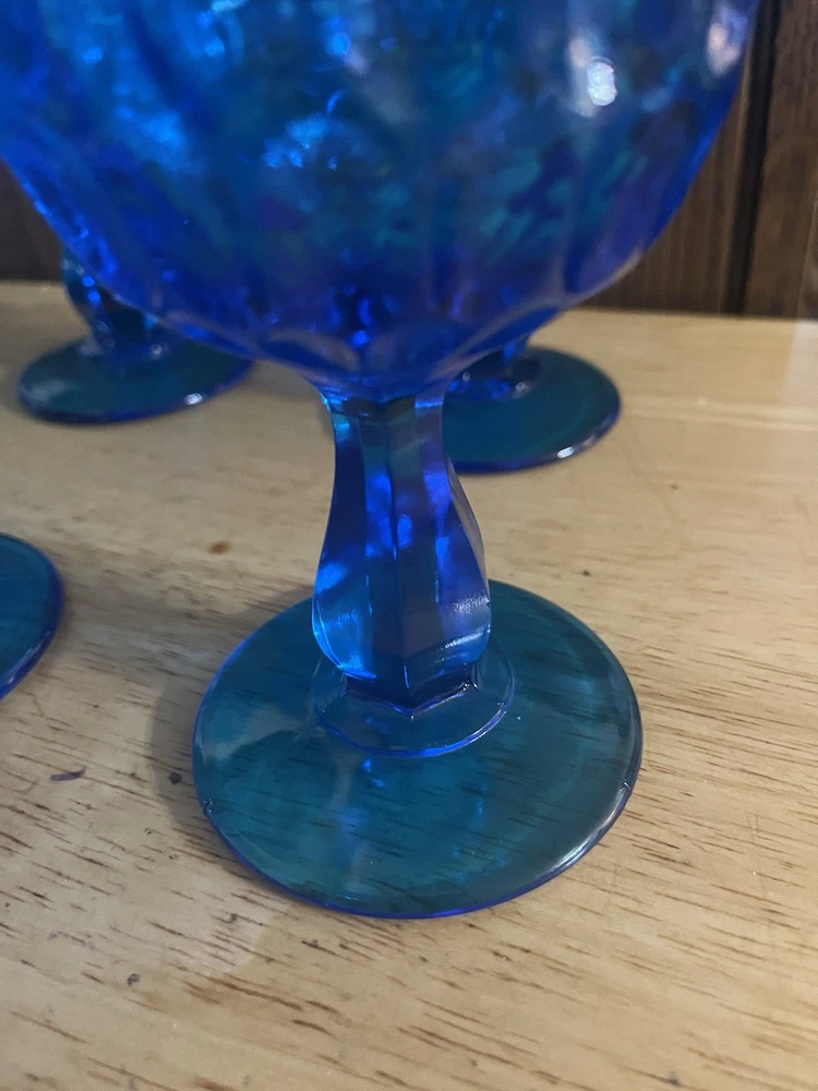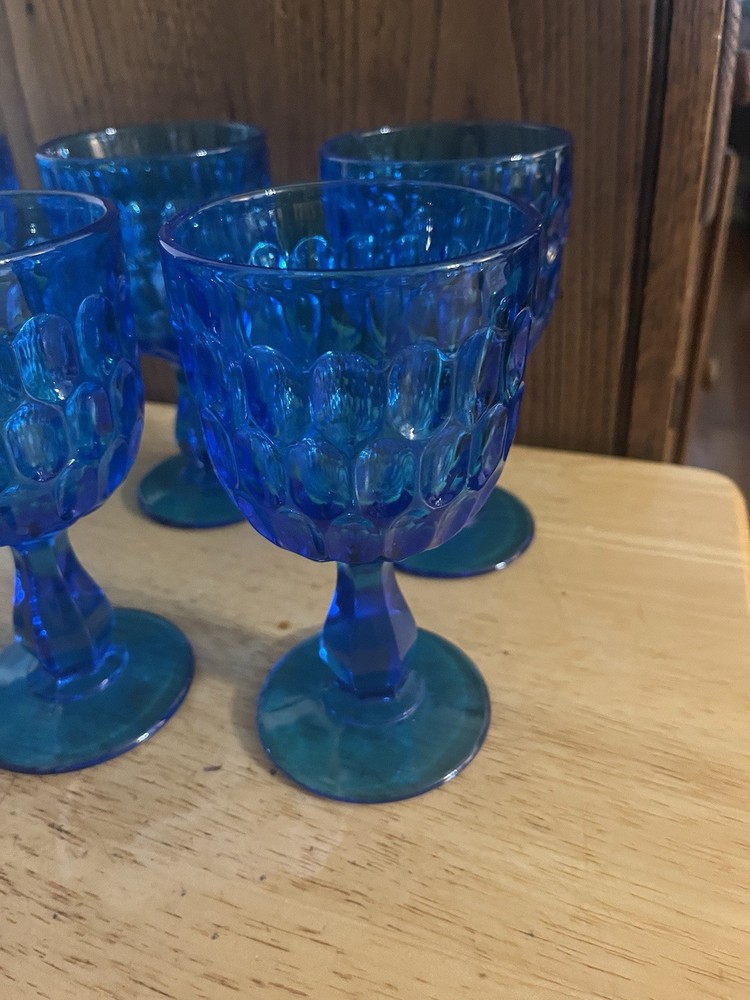This set of 7 vintage Fenton colonial-style goblets is a must-have for any glassware collection. The beautiful thumb print pattern and rich royal blue color make them a perfect addition to any table setting. Each goblet measures 6.5 inches in height and 3.5 inches in width, making them perfect for all occasions. These goblets are made of high-quality glass and have a production style of pressed glass, which gives them a unique and elegant design. They are perfect for both men and women and can be used for all occasions. Whether you are looking to add to your collection or simply want to impress your guests, these Fenton goblets are sure to do the trick.