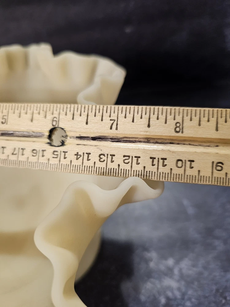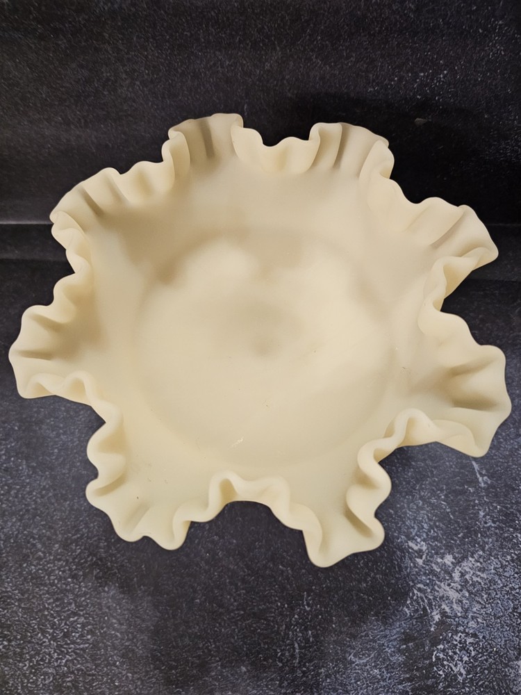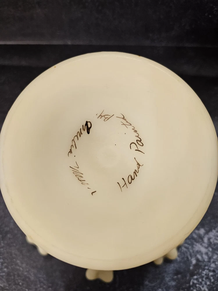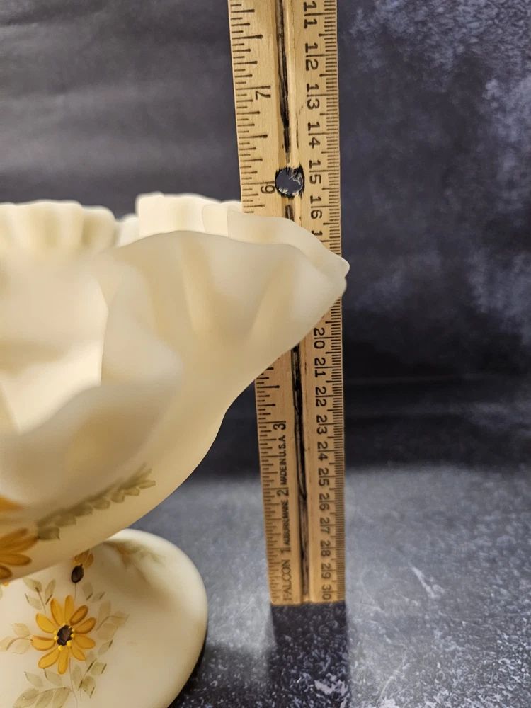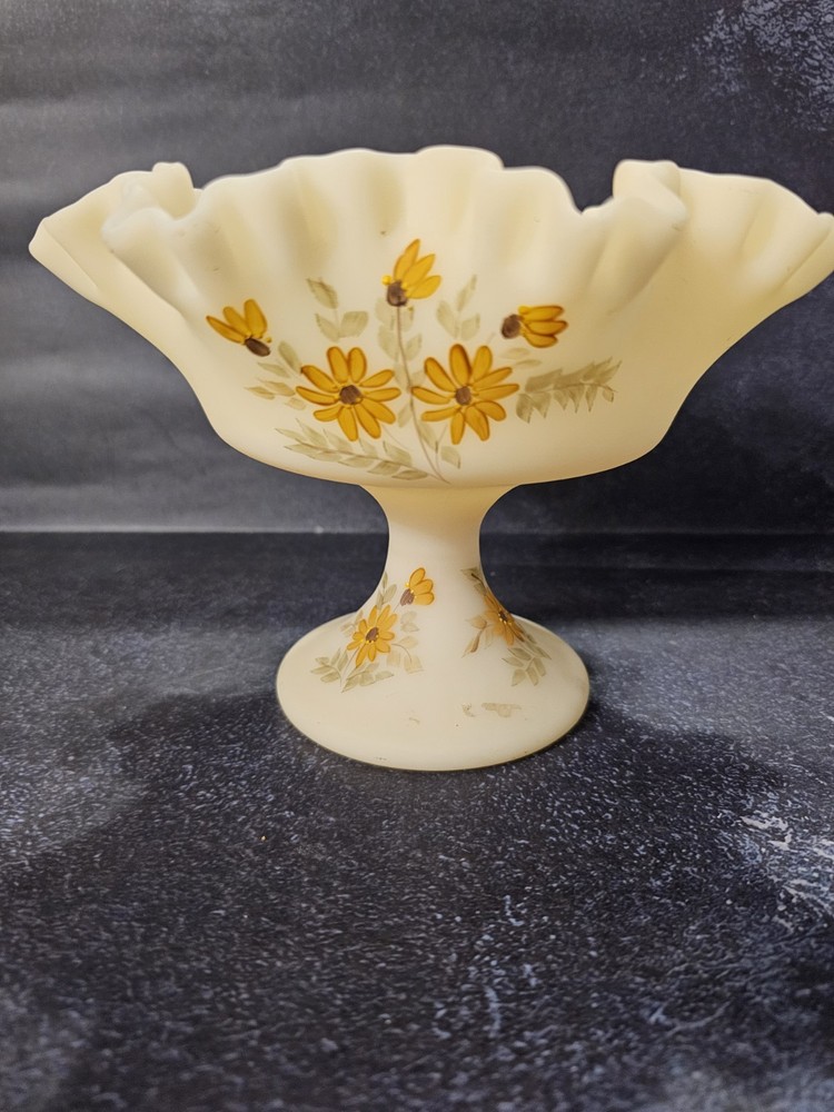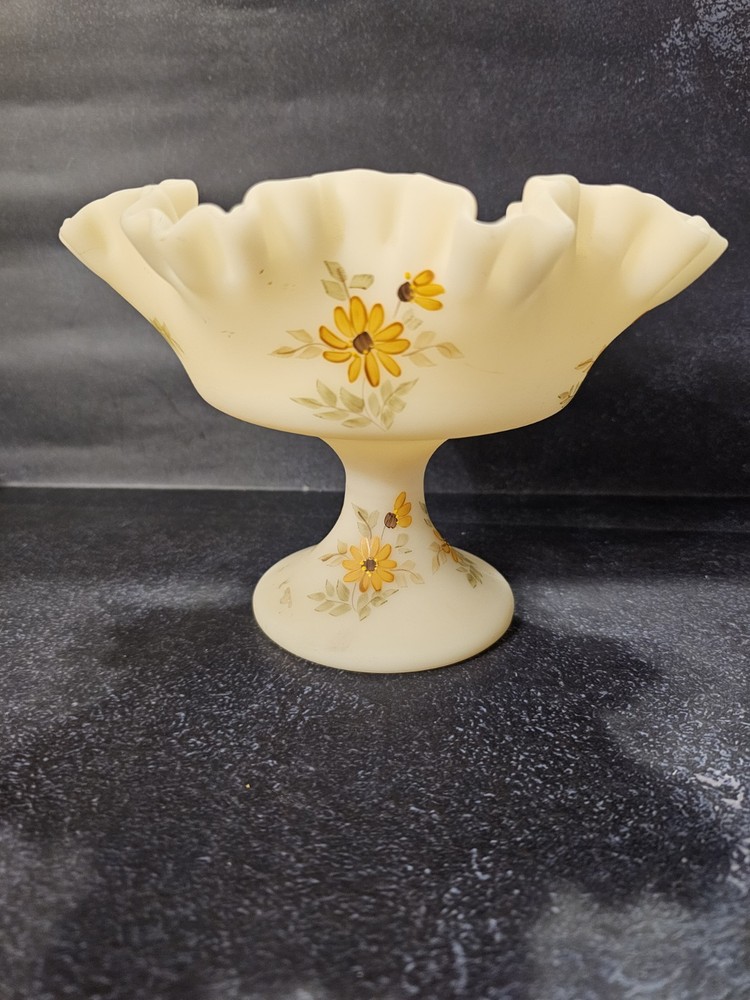 no chips or cracks Experience the charm of vintage art glass with this exquisite Fenton compote. Crafted from high-quality satin glass, it features a delightful almond shape and a ruffled edge that adds a touch of elegance to any display. Hand-painted with intricate daisy motifs in a warm yellow hue, this piece is a testament to the timeless craftsmanship of Fenton glassware. Originating from the United States and dating back to the post-1940 era, this compote is an original piece that exudes a sense of history and heritage. Its beige coloration is both versatile and striking, making it a perfect addition to any collection or as a standalone decorative item. Whether you're a seasoned collector or simply appreciate the beauty of historic glassware, this Fenton compote is sure to captivate and inspire.