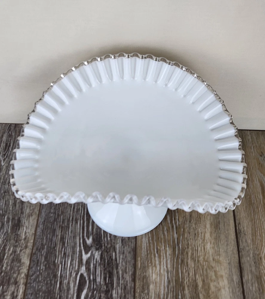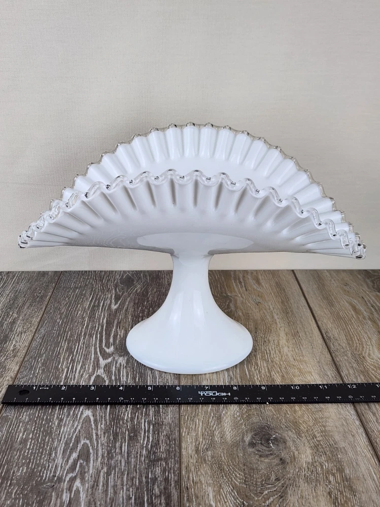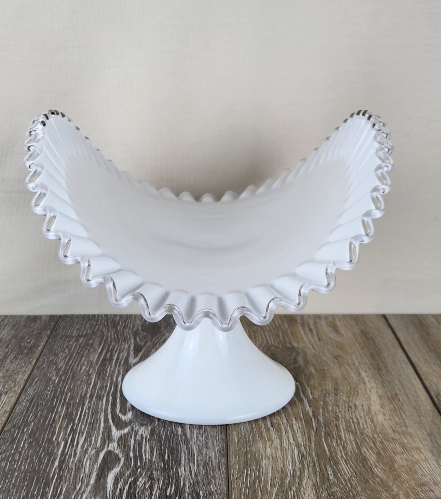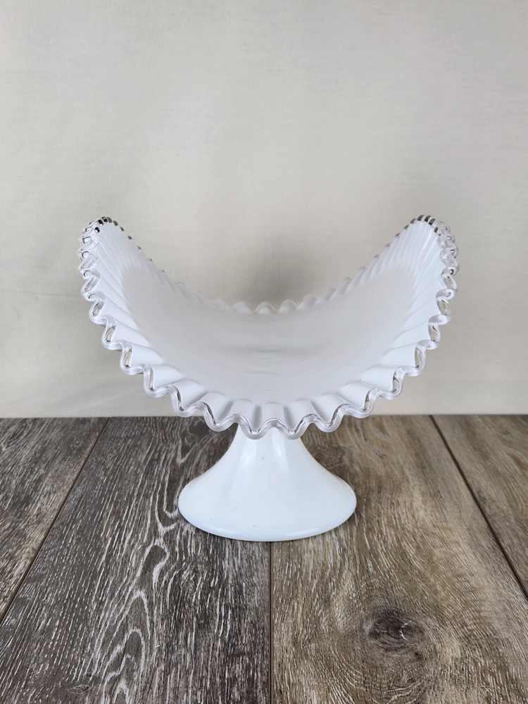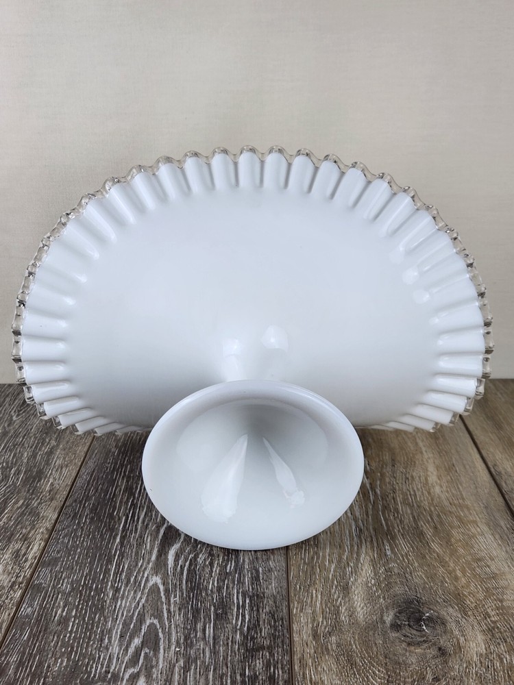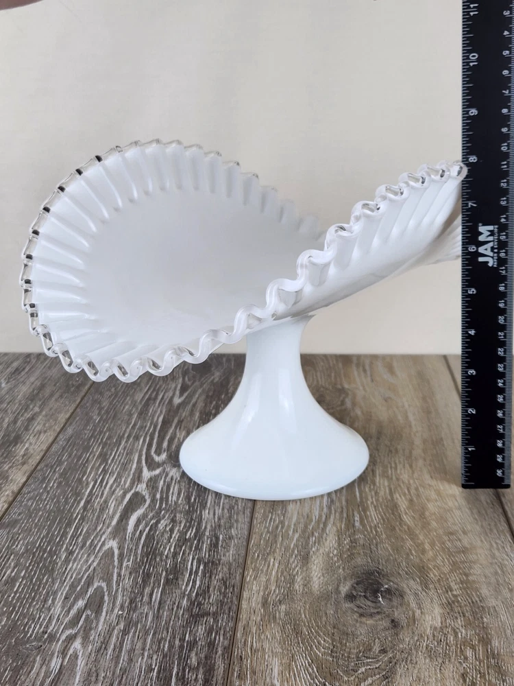 Whether you're styling a vintage kitchen or gifting a special piece to a collector, this Fenton Silver Crest milk glass fruit bowl is the perfect pick. The pure white body contrasts beautifully with the clear glass crimped edge, adding a refined touch to any display. Perfect for holding fruit, florals, bread, or seasonal decor, this pedestal serving dish also works wonderfully as a wedding centerpiece or a shabby chic accent. A charming piece of vintage glassware that’s both practical and beautiful. *Excellent condition!