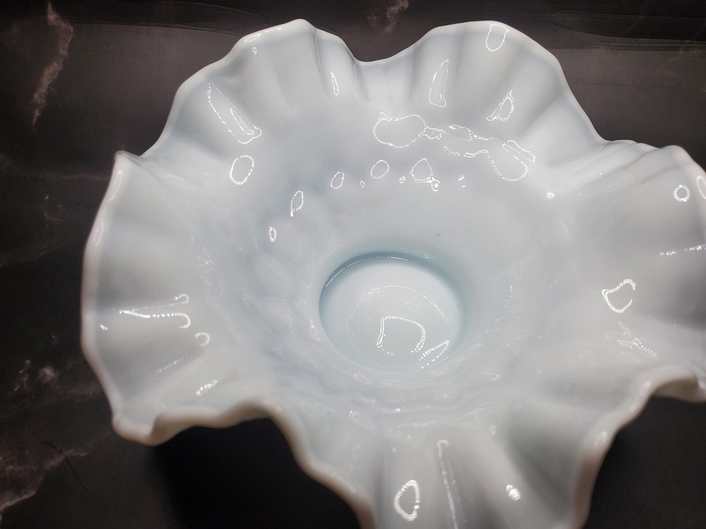 This vintage Fenton white milk glass bowl is a charming piece of elegant glassware from 1957. Handmade in North America, this round bowl features a ruffled thumbprint pattern that adds a decorative touch to any occasion. With a glossy finish and a diameter of 6 inches, this Art Deco style bowl is perfect for serving nuts, candies, or other small treats. A timeless piece from the mid-20th century, this Fenton Colonial bowl is a lovely addition to any glassware collection. Small mark on base as shown.