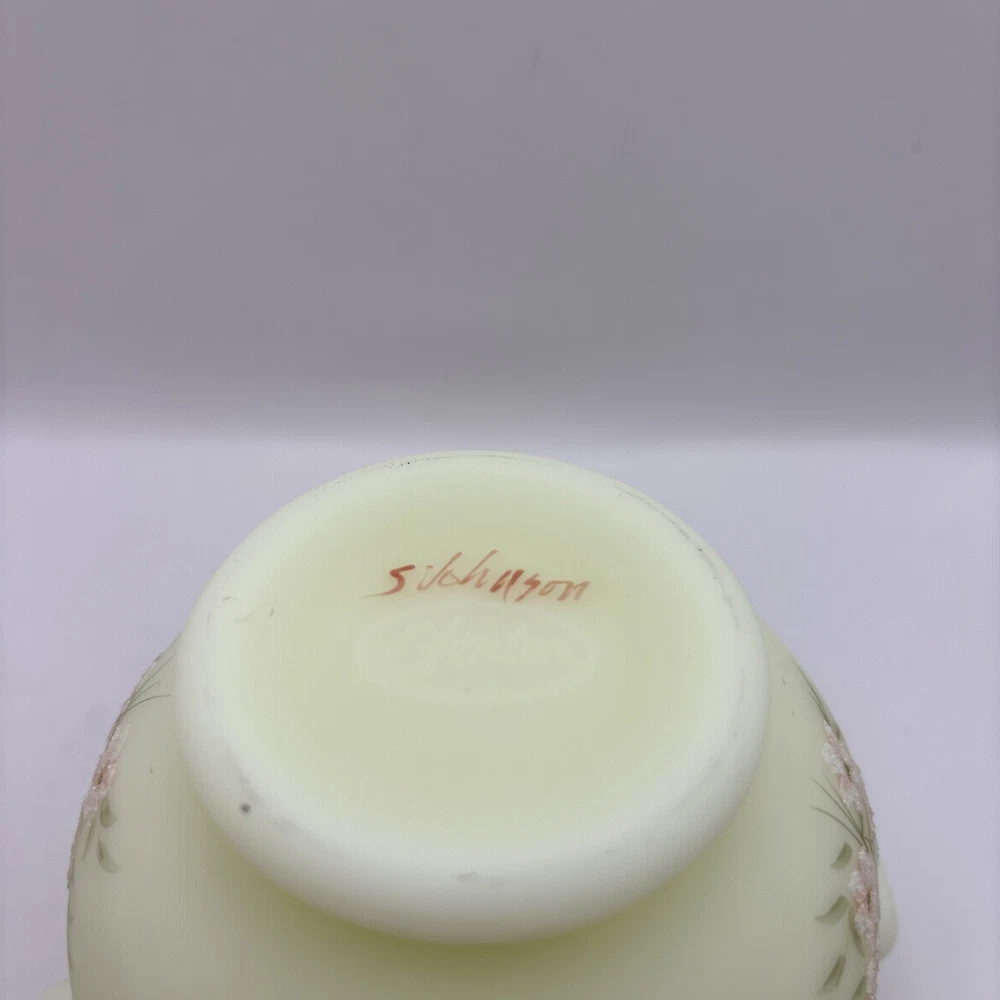 This vintage Fenton glass bowl features a beautiful hand-painted floral design in yellow and lime green colors. Made in the United States as part of the Art Glass production style, this piece is signed by the artist and showcases the brand's quality craftsmanship. With its charming flower theme and unique color combination, this Fenton glassware would make a lovely addition to any collection of decorative pottery and glassware.