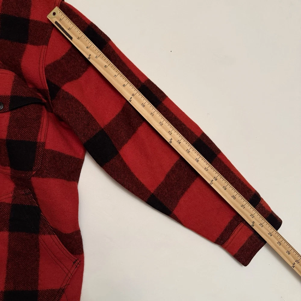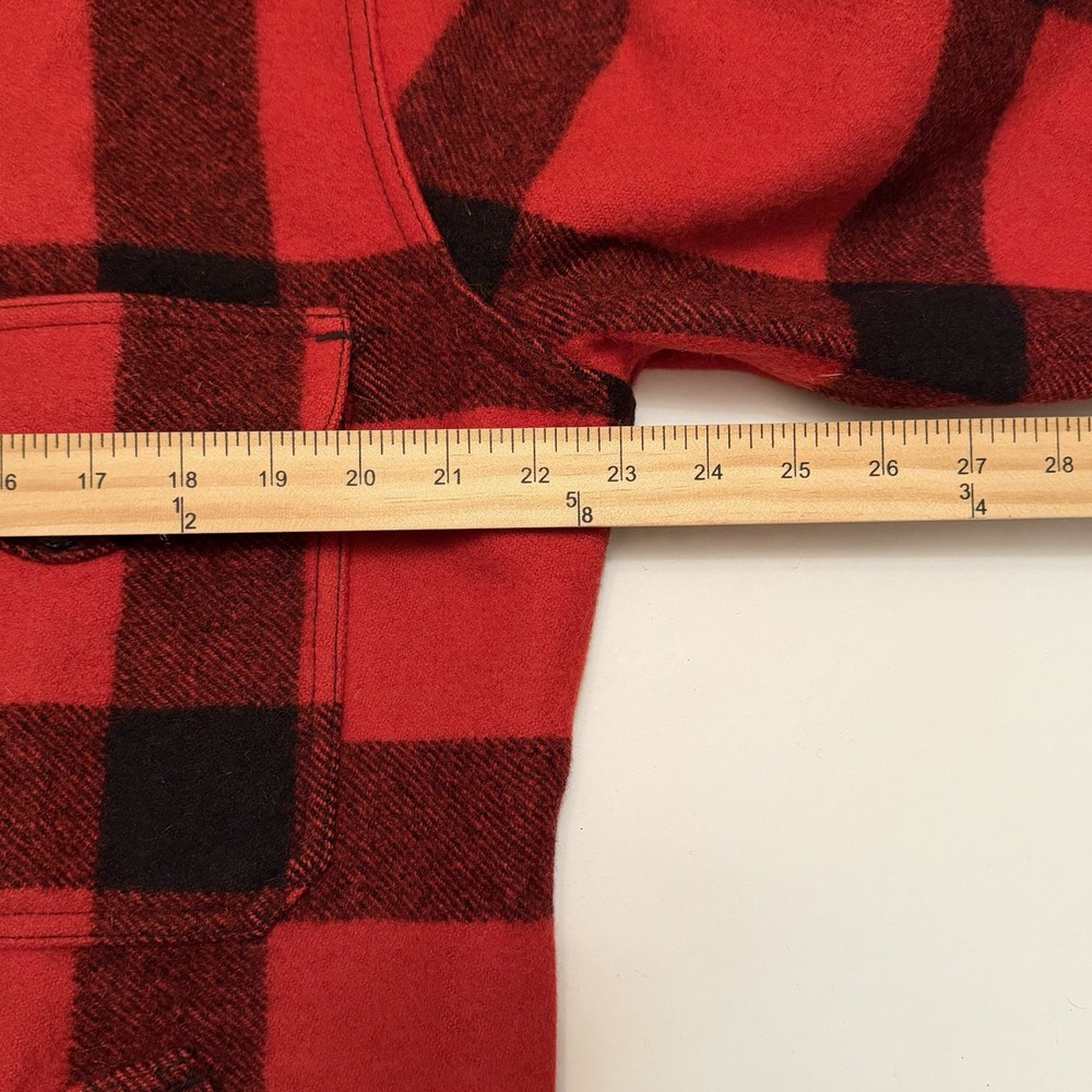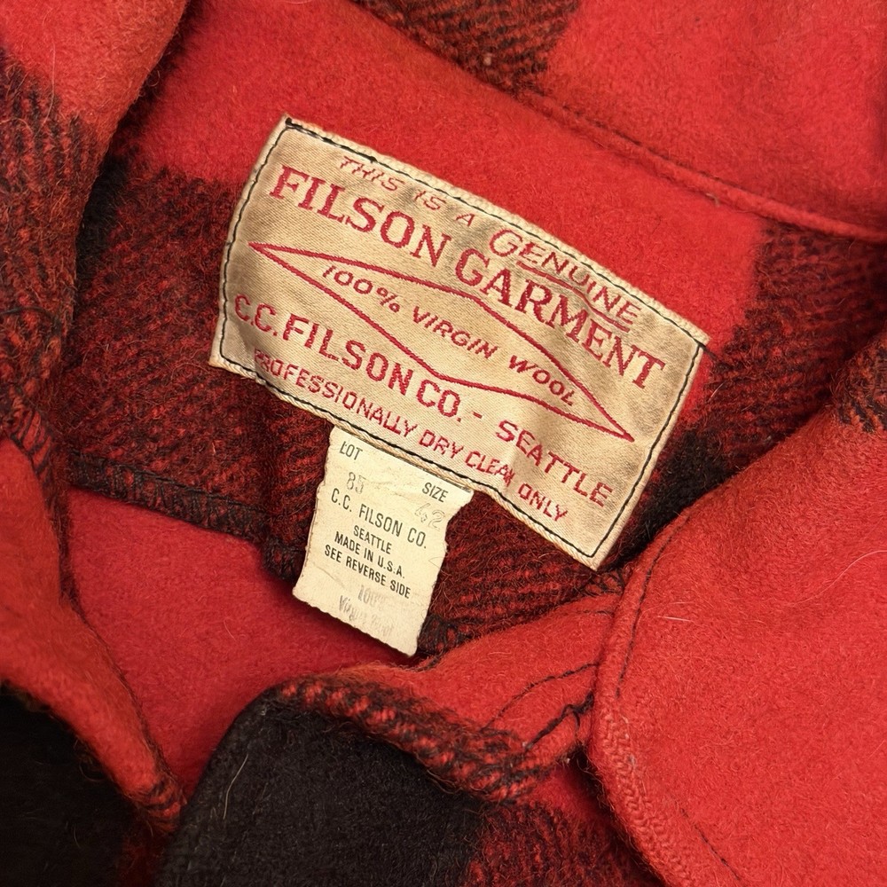 Authentic Filson Mackinaw wool jacket in the iconic red & black buffalo plaid. Made from 100% virgin wool, this is a true Filson classic—warm, durable, and built for hard use. Features a button-front closure, chest flap pockets, hand-warmer pockets, and heavy-duty Filson hardware. This is not a modern reproduction—this is a genuine vintage Filson garment with the classic Seattle tag. A timeless piece of American workwear, perfect for outdoor wear, heritage styling, or serious Filson collectors. ⸻ Condition Very good vintage condition • Wool is thick and still plush • No holes or tears noted • Light surface lint / natural wear consistent with age • Buttons intact and functional Overall, a clean and well-preserved vintage Filson piece. ⸻ Tag Details • Brand: Filson • Material: 100% Virgin Wool • Made in USA • Tag size: 42 (see measurements for best fit) Fit Recommendation Typically fits like a Men’s Large (L) in vintage Filson sizing. Always compare measurements to a jacket you own for best fit. ⸻ Details • Color: Red / Black • Pattern: Buffalo plaid • Closure: Button front • Pockets: Multiple front utility pockets • Style: Mackinaw / Cruiser / Workwear ⸻ Shipping Fast & secure shipping Jacket will be packed carefully to protect the wool. Returns / Condition Disclosure (PLEASE READ) This is a vintage Filson wool jacket and is being sold as described and as shown. • All photos are of the exact item you will receive • Condition has been clearly described • Any signs of age-related wear are normal for vintage wool garments • No holes, no structural damage, and all buttons are intact unless otherwise stated Vintage items are not new and may show minor wear consistent with age. 👉 Returns are not accepted for fit, sizing, or vintage wear expectations. 👉 Buyer is responsible for reviewing measurements and photos before purchasing. If you have questions or need additional photos before buying, please ask.