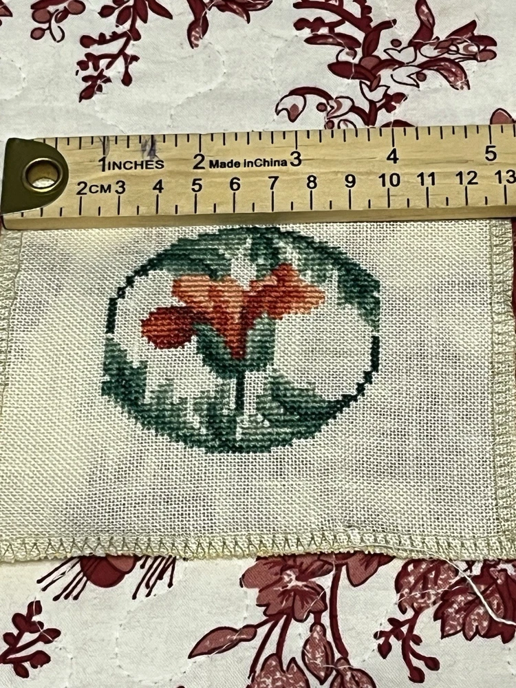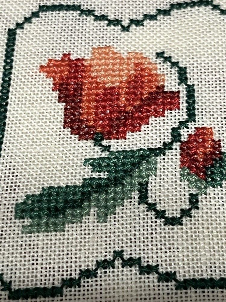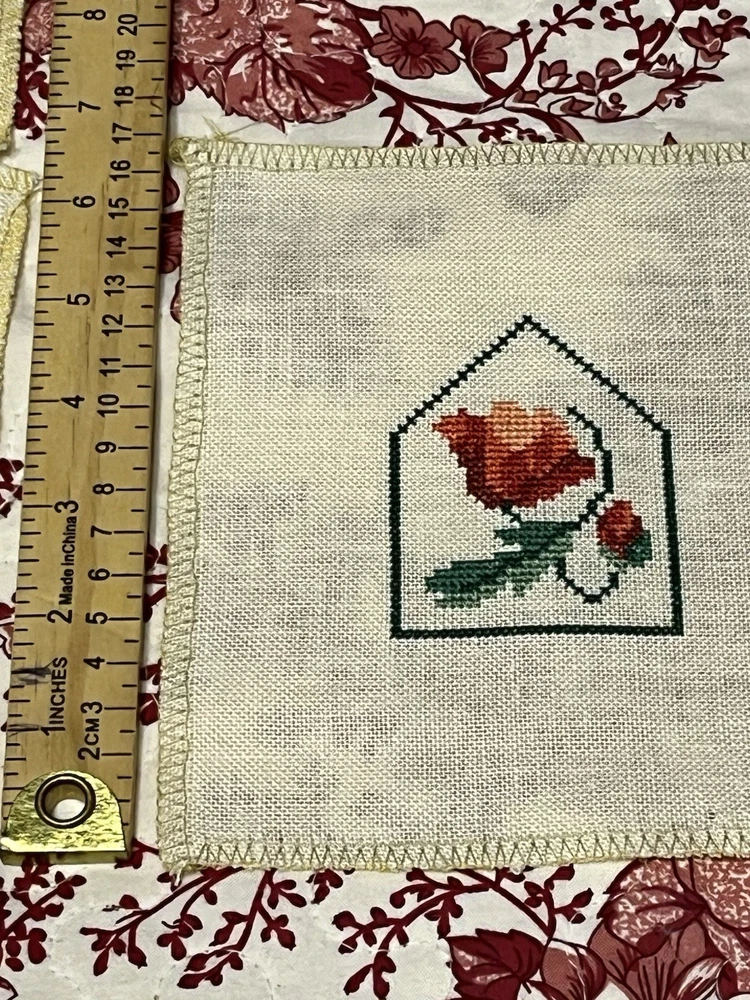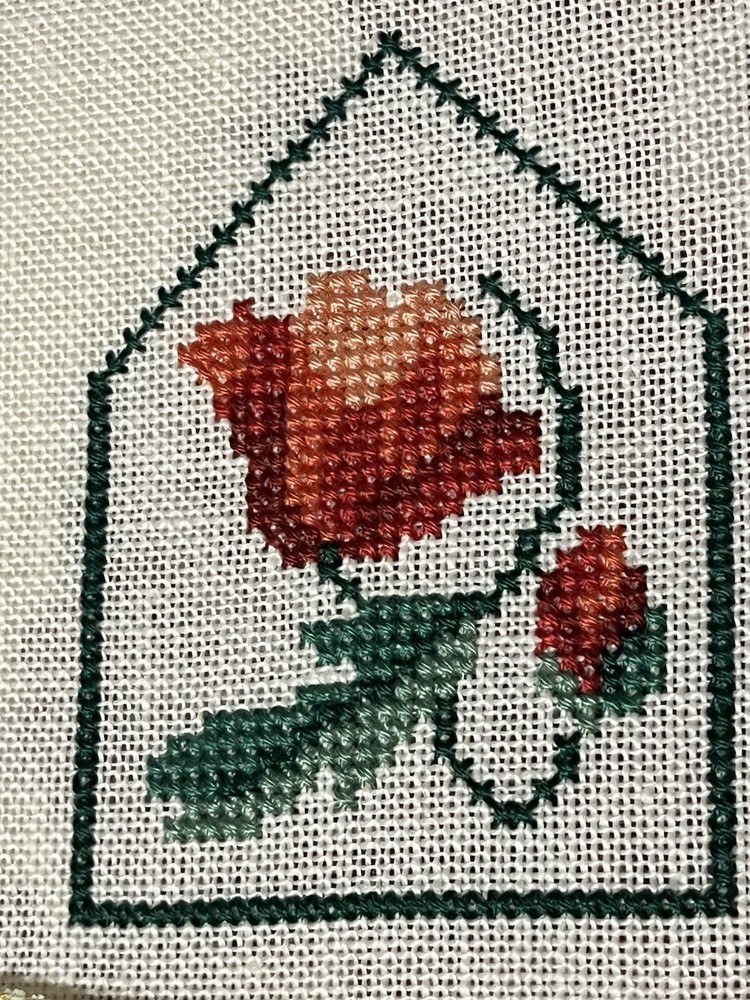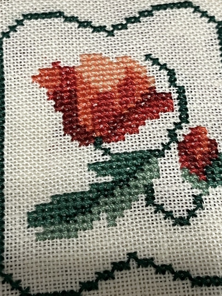 This is a lovely lot of five rose buds done extremely well. The one even has little seed pearls sewn into the bottom border. These are very shabby Chicish, cottage. I was going to frame in metal frames to hang as a small wall collage and never got round to it. Please blow up to see the beautiful details and colors these are more like a burnt orange, orangey pink hue if that is even a color (lol) with the two different greens. Please ask any questions you may have and look at photos I also put ruler for sizes. Comes from clean smoke free home! Happy Holidays!