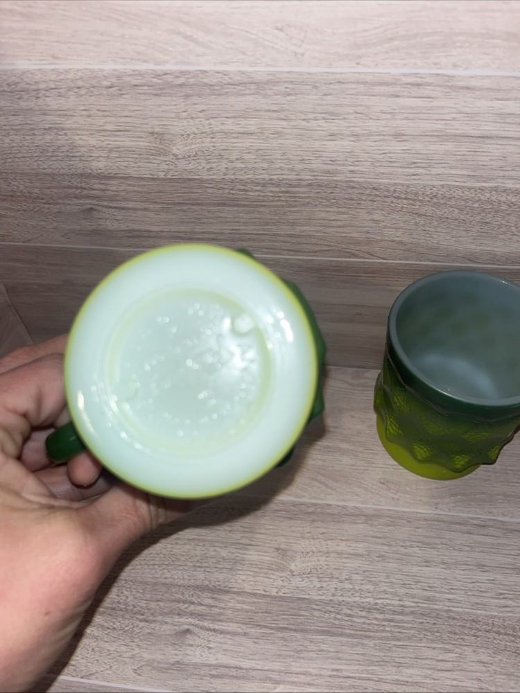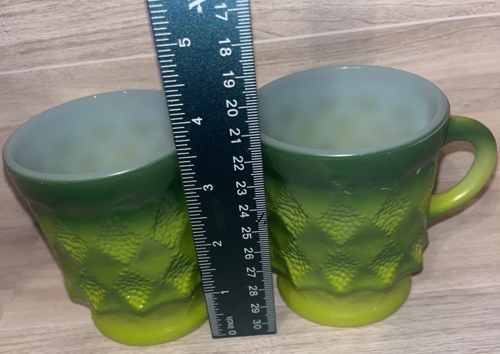The product is a set of two vintage Fire King Anchor Hocking Kimberly Diamond ombre coffee cups retro mugs from the 1970s. These round, glossy milk glass mugs feature a retro style with a Kimberly Diamond pattern and multicolor decorative design. Made in the United States, these coffee mugs are hand wash only and stand at 3.8 inches tall with a 3-inch diameter. The mugs are a unique addition to any collection, perfect for all occasions, and showcase the American theme and production technique of the time period.