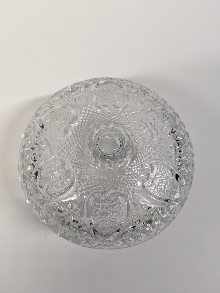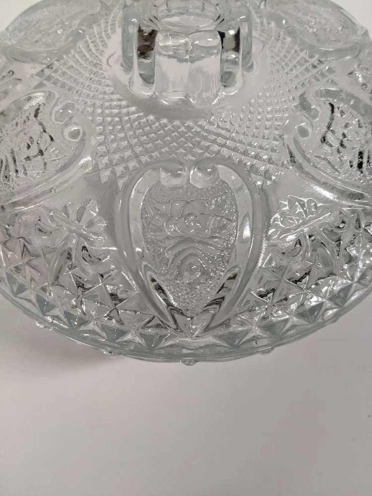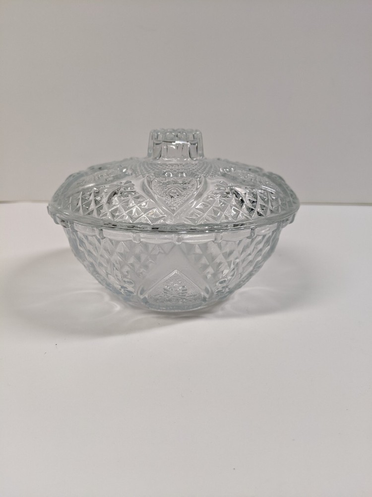 Vintage Clear Glass Candy Dish with lid Firna Indonesia Measures 5-inch round, 3.5 inches without lid and approximately 2 inches deep In great condition no chips or cracks
