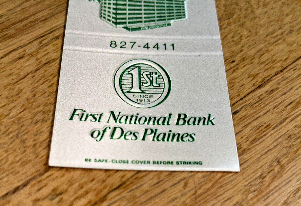 This listing is for a nice FIRST NATIONAL BANK OF DES PLAINES ILLINOIS Matchbook Cover The condition is nice. The strike plate shows no use. The matches were carefully removed The bank was located in: Lee and Prairie Streets, Des Plaines, Illinois PLEASE SEE MY OTHER LISTINGS AND STORE FOR SIMILAR ITEMS AND COMBINE FOR THE LOWEST POSTAGE. Please feel free to message any questions to me.(MB1)