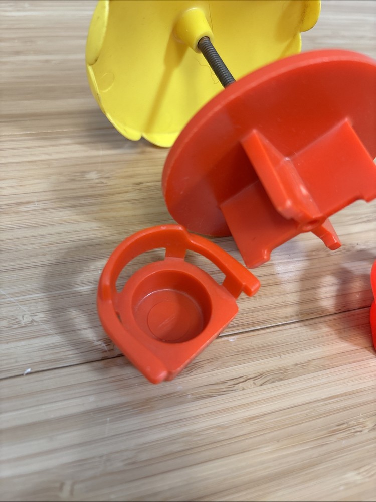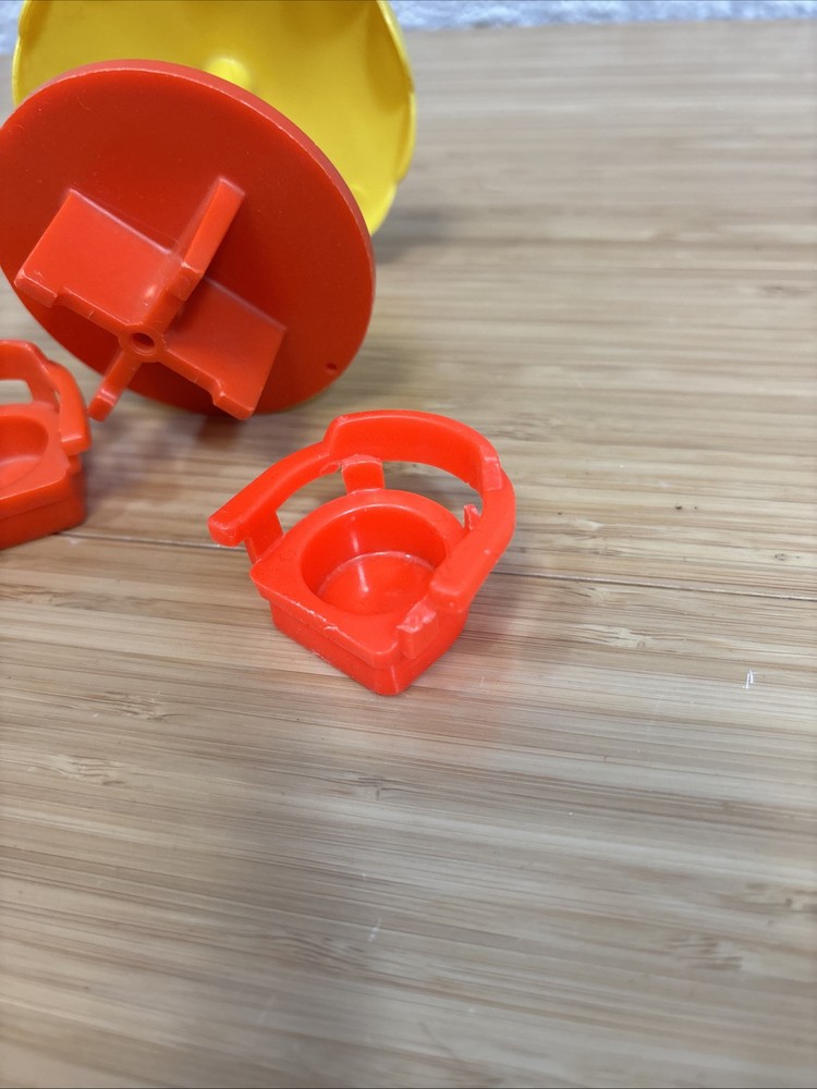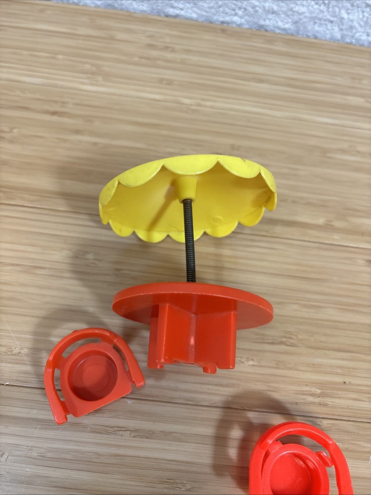 This is a umbrella table for vintage Fisher-Price little people. I’m not sure exactly what set it was from but I am including two chairs. One of the chairs has a broken arm.