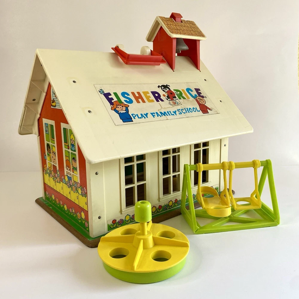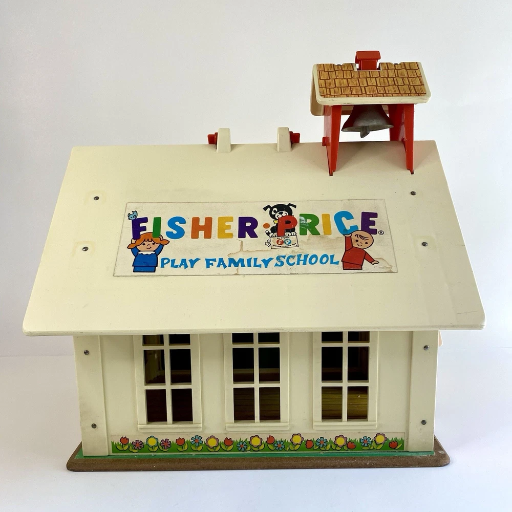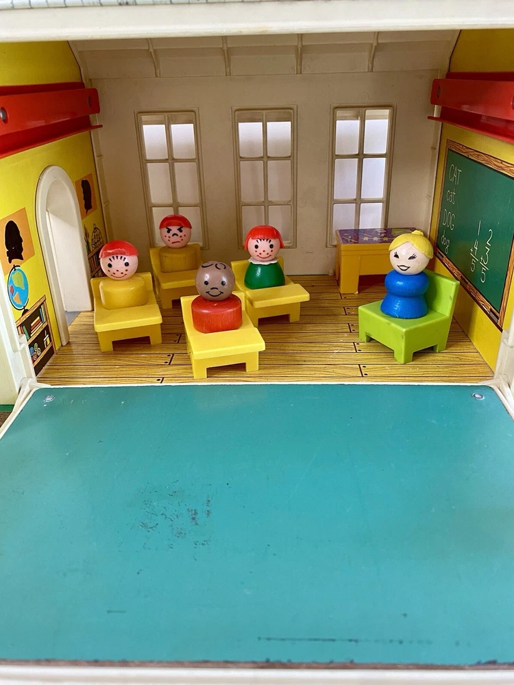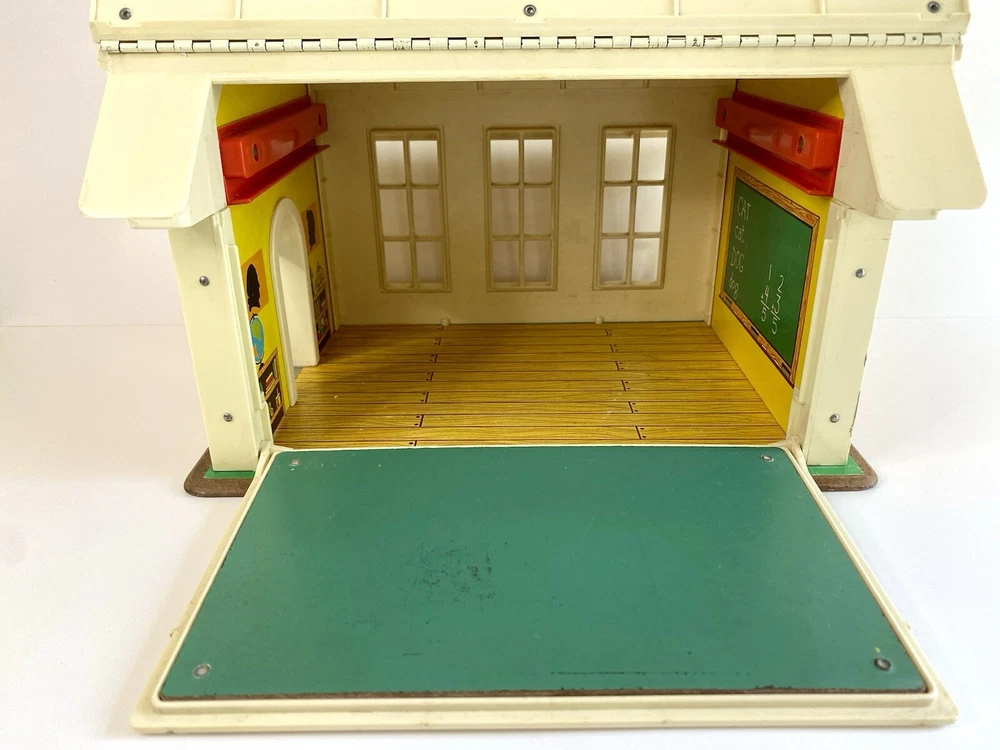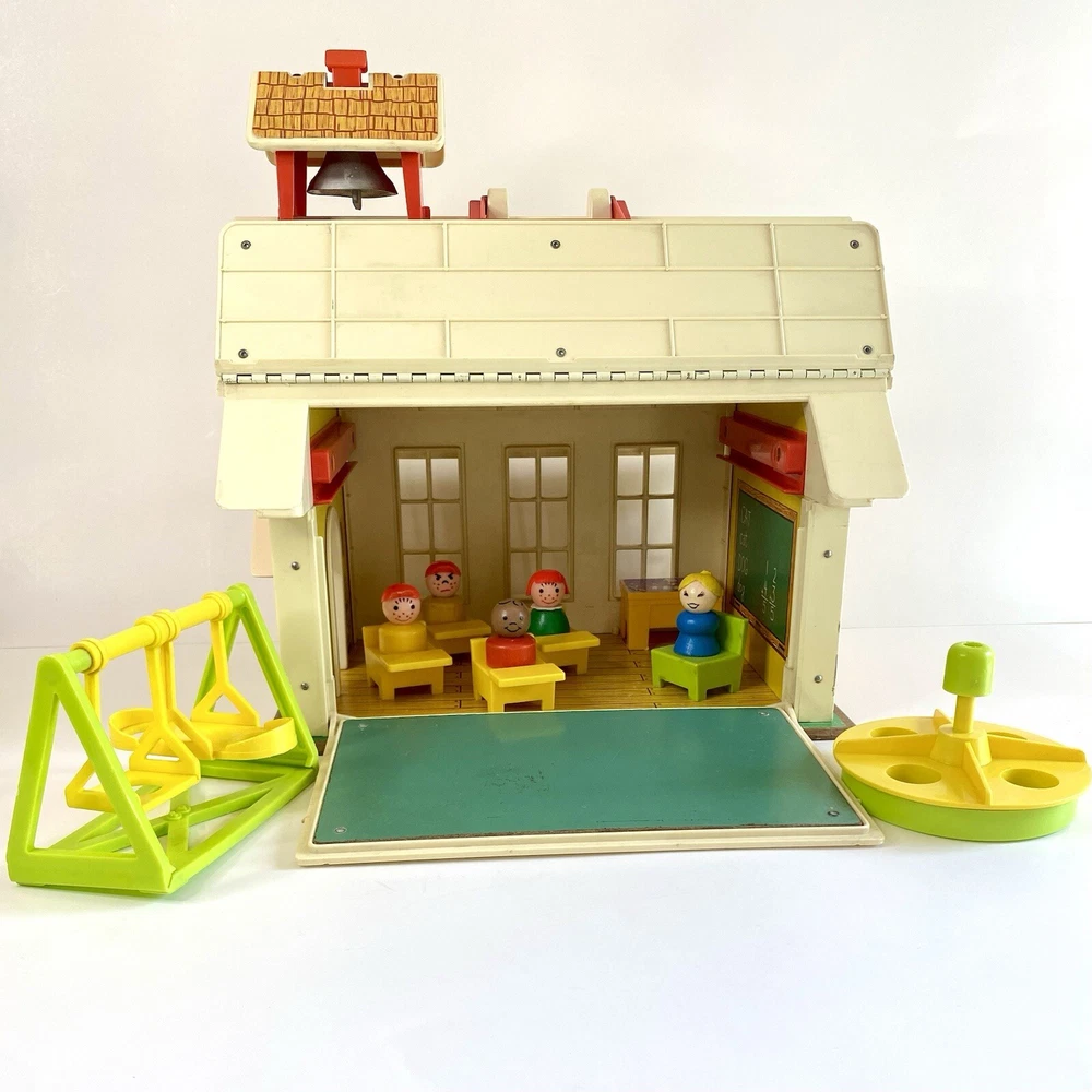 Fisher Price Play Family School partial set, vintage from the early 1970s, containing: School house Little People figures: a blonde teacher and 4 kids; 2 are original from the set (Black boy and redhead girl) and 2 came from other sets (white boys with baseball caps); 1 baseball cap boy is all plastic, and the others have wood bodies with plastic heads 1 green teacher chair and 4 yellow student desks Merry-go-round and swing set Craft table (not part of original set) The entire set is in good to very good used condition, having been played with by a few generations over the past 50 years; see photos for current condition. It's clean and sturdy and ready to be played with by the next few generations!