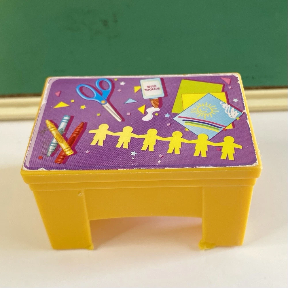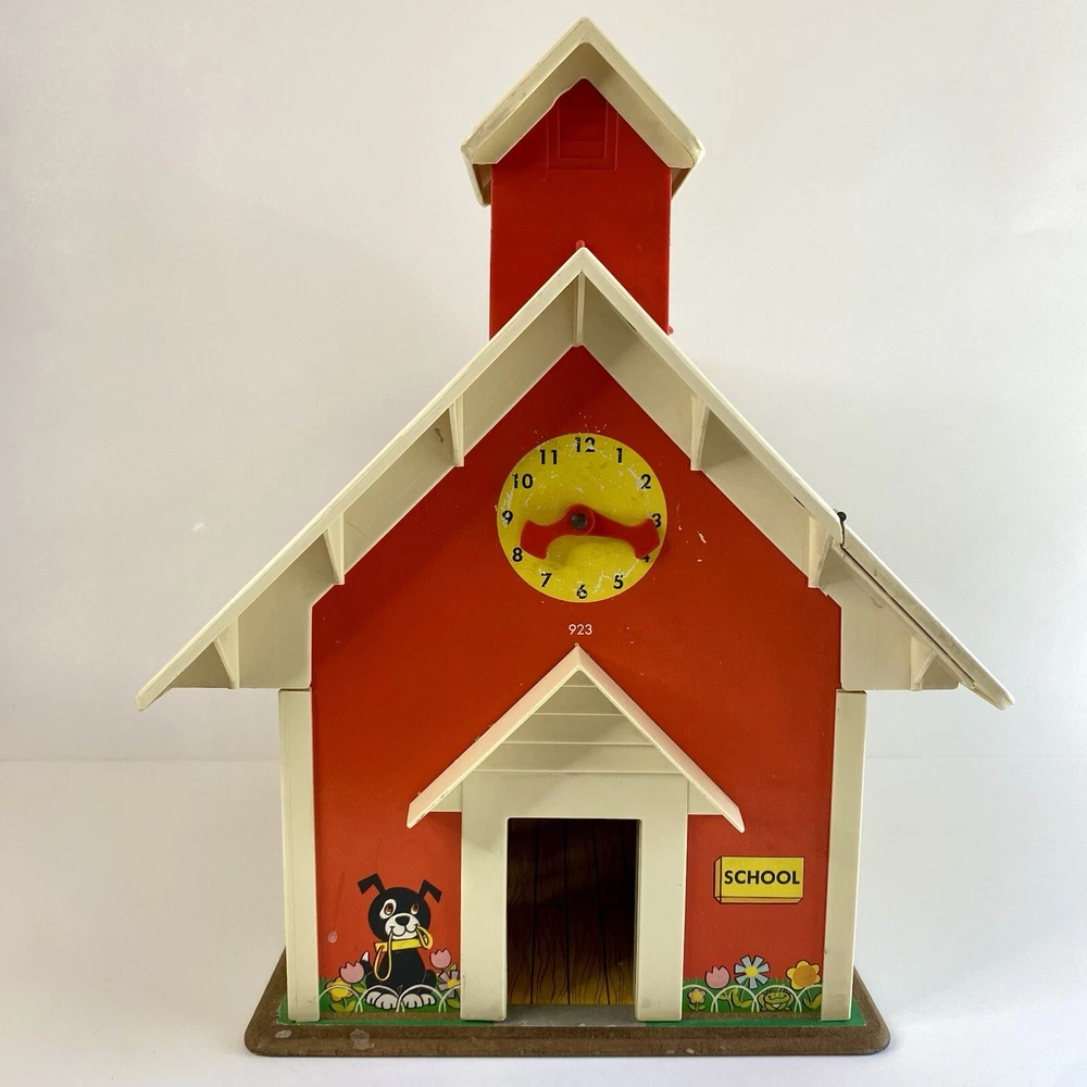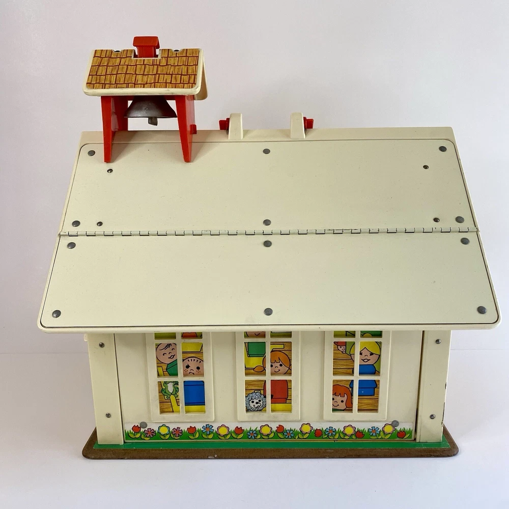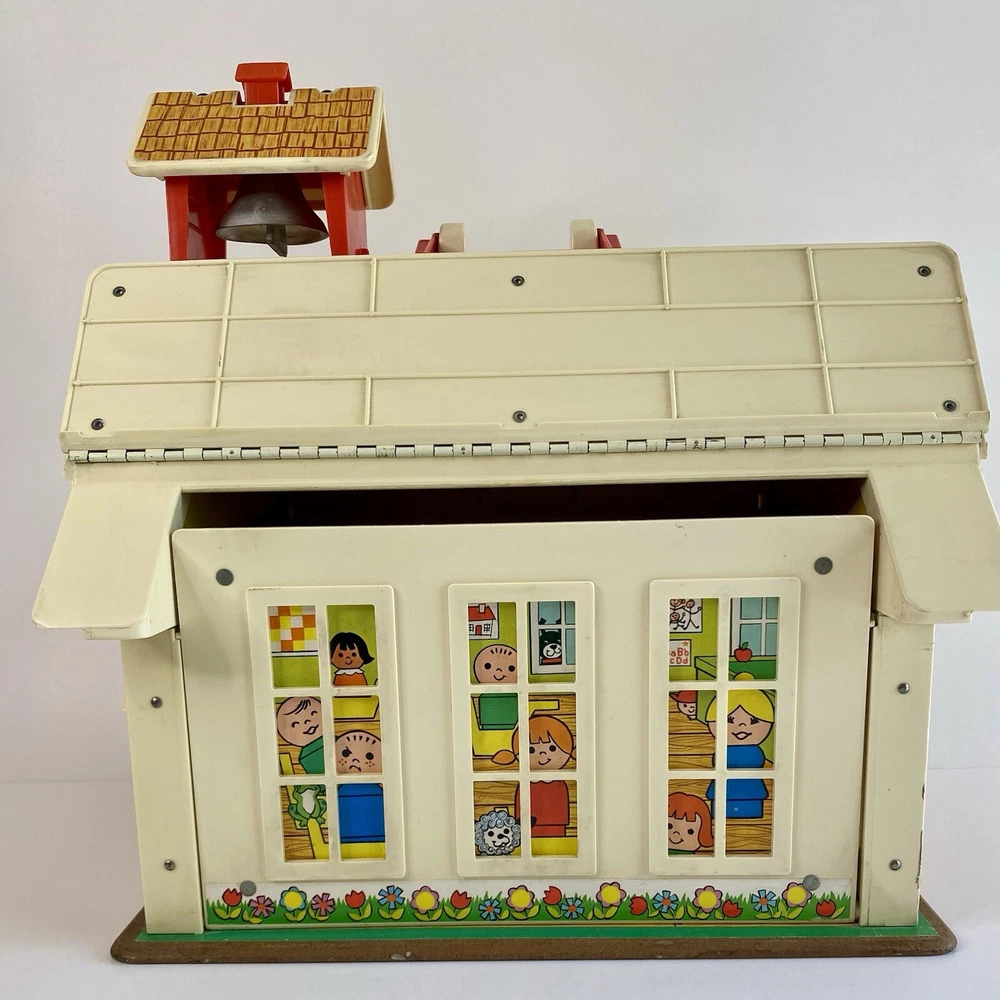 Fisher Price Play Family School partial set, vintage from the early 1970s, containing: School house Little People figures: a blonde teacher and 4 kids; 2 are original from the set (Black boy and redhead girl) and 2 came from other sets (white boys with baseball caps); 1 baseball cap boy is all plastic, and the others have wood bodies with plastic heads 1 green teacher chair and 4 yellow student desks Merry-go-round and swing set Craft table (not part of original set) The entire set is in good to very good used condition, having been played with by a few generations over the past 50 years; see photos for current condition. It's clean and sturdy and ready to be played with by the next few generations!