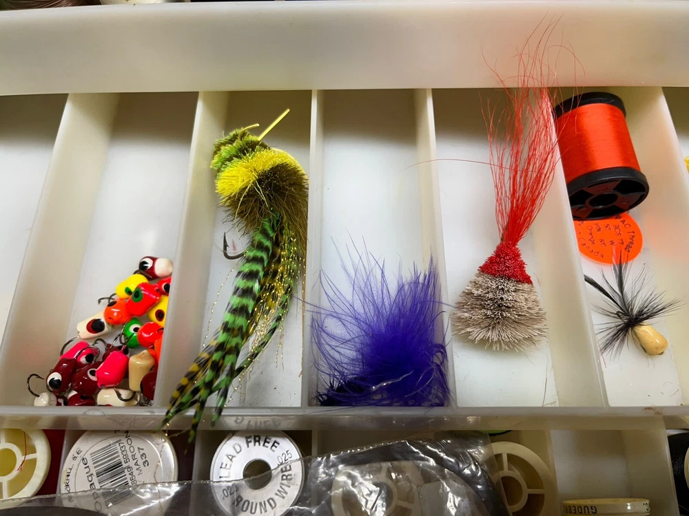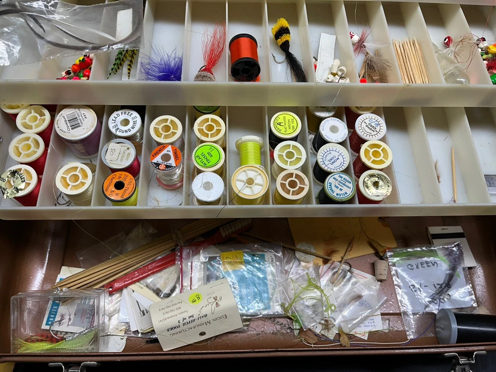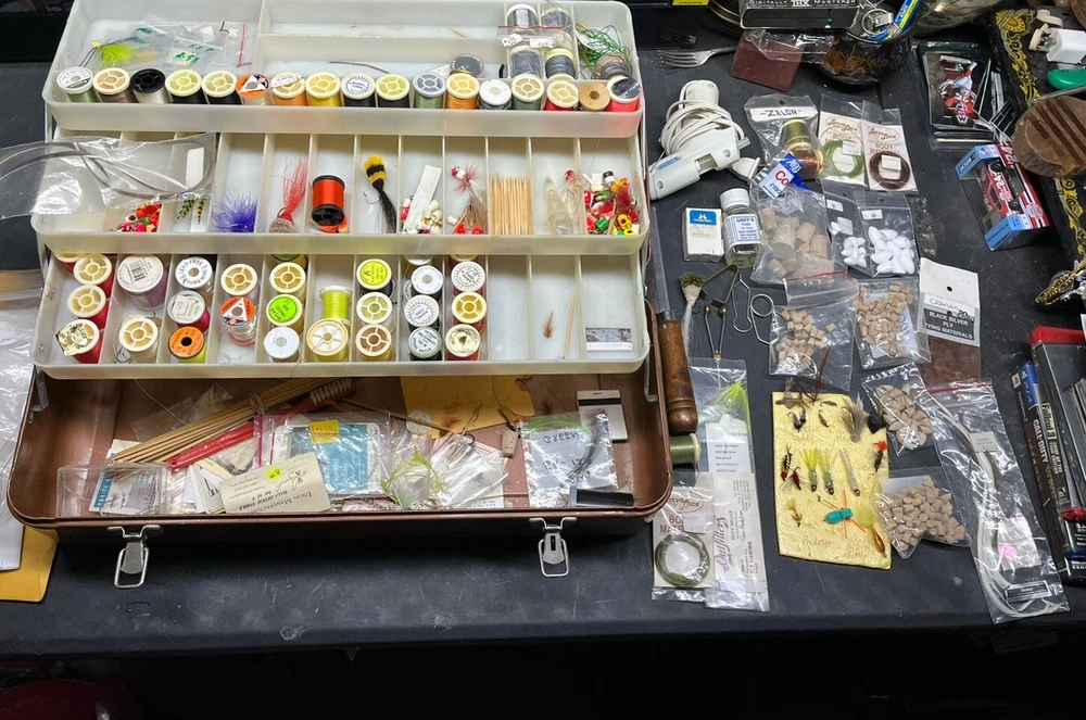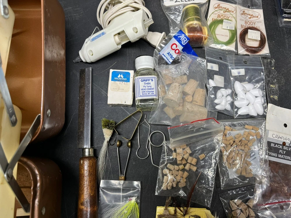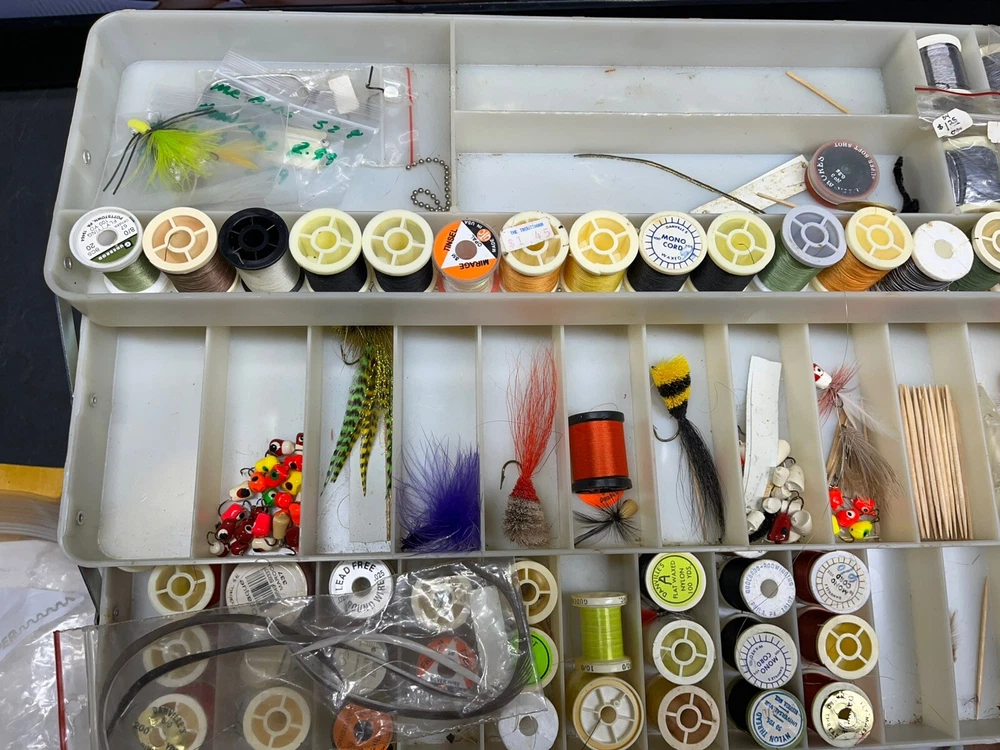 The product is a vintage fishing lot that includes new and used tackle such as hooks, lures, and items for fly fishing. The bait type is crankbait, suitable for freshwater fishing. The bait shape is fish, and the color is multicolor. This fishing lot is versatile, suitable for targeting all fish species. There are tons of line, feathers and other materials for creating your own lures and tools to help with the assembly of the lures for fly fishing and comes within a fishing tackle box