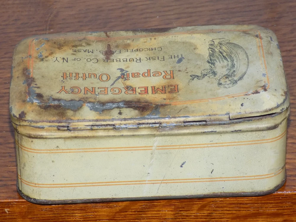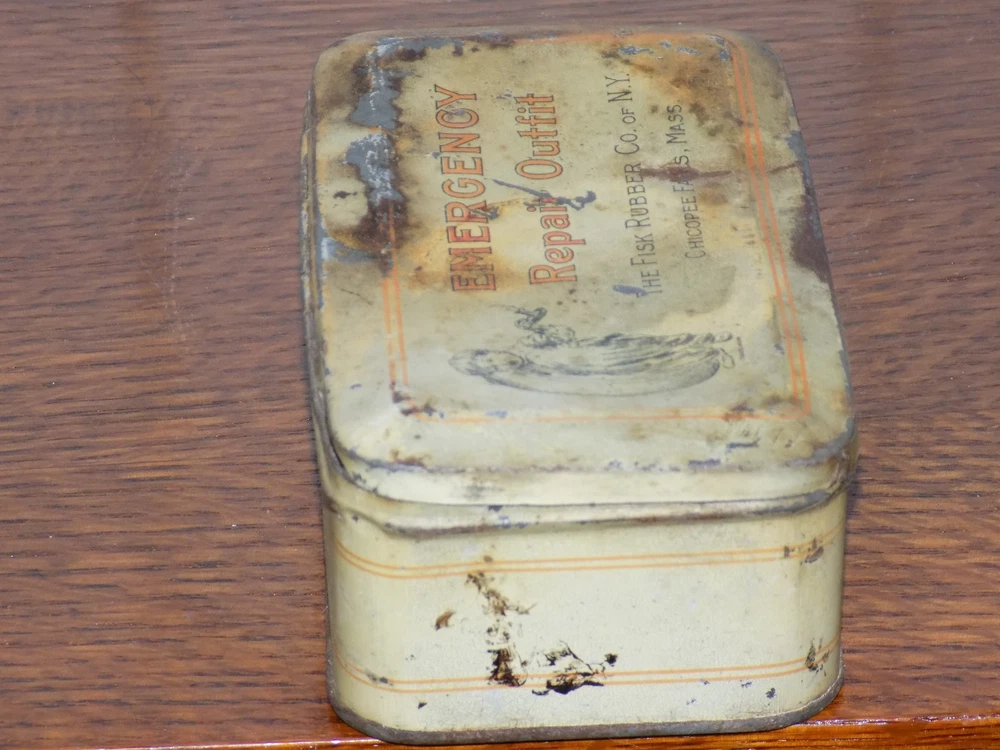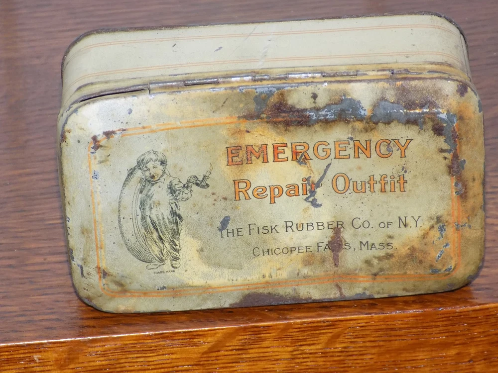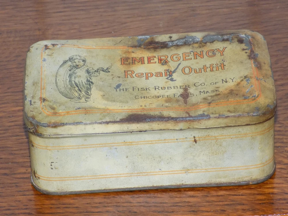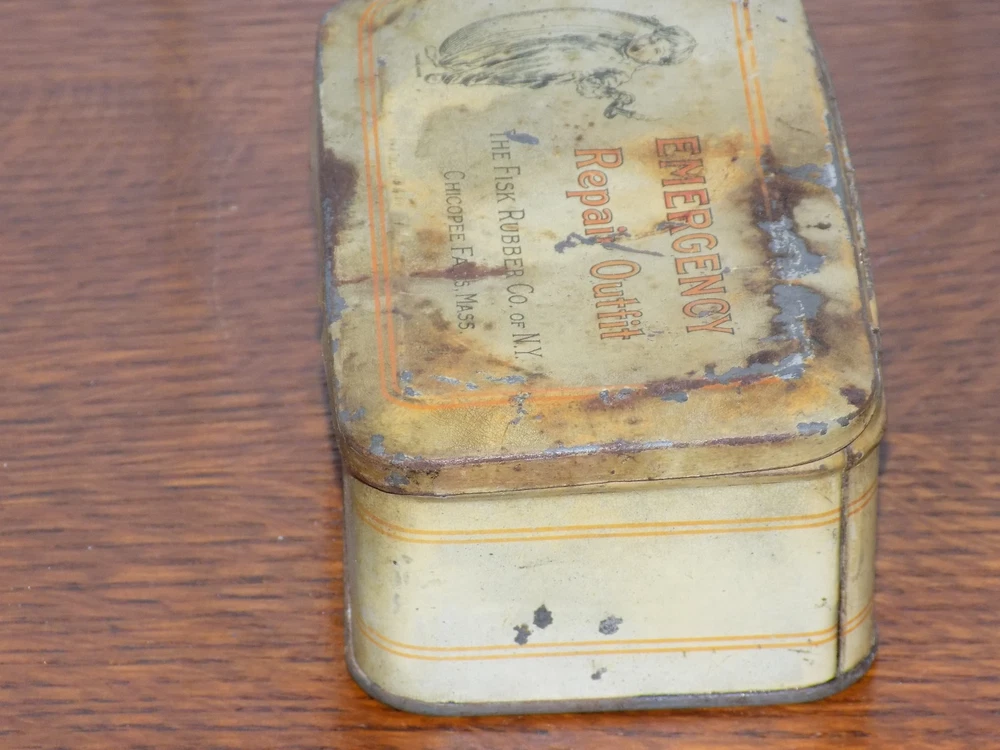 You are buying a Vintage Fisk Rubber Tire Emergency Repair Kit Chicopee Falls, Mass Tin. Tin has wear from age and use. Measures approx. 5 x 3 x 2 inches. Fresh from an upstate NY estate. Buying as is International buyers must use EBay Global shipping. 7.18