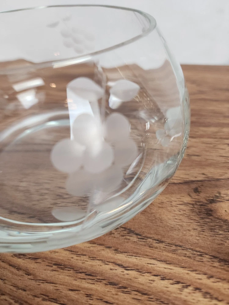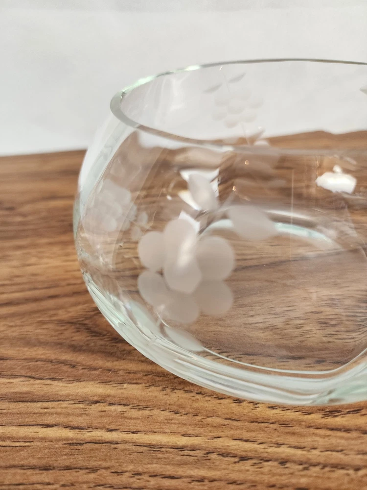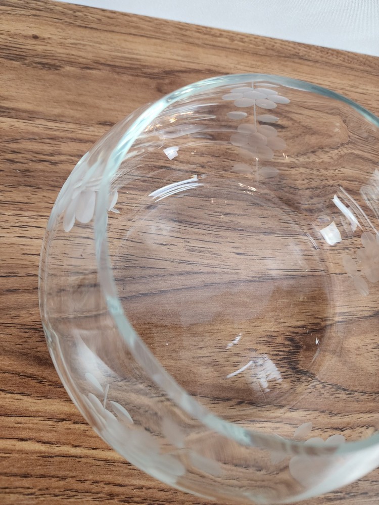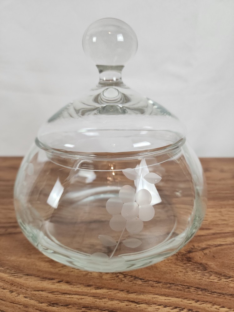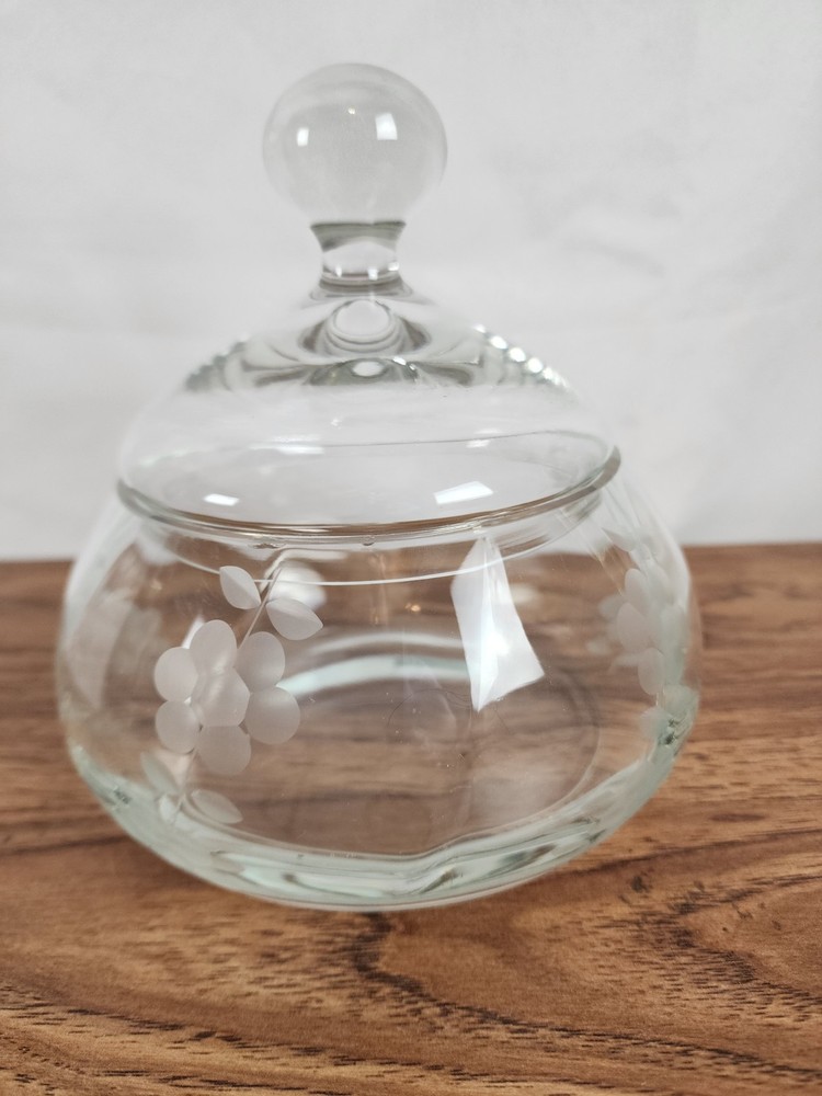 This piece is absolutely stunning! The clear-cut glass is etched with flower details that add a touch of elegance. The dish comes with a lid and is perfect for displaying cookies or other treats. It is made of high-quality glass, and aside from a small chip in the mouth of the piece, it has been well-preserved over the years. The piece measures approximately 7 inches from the base to the tip of the lid. It measures approximately 6 inches at it widest. The opening measures approximately 4.5 inches in diameter. At Makenna Cole Collection, we very much appreciate your purchase and your feedback. Our collection is a wide variety of items, and our passion is to find good homes for our great finds. From old to new, gently used to never used, our collection has a little bit of everything! Box 33-225