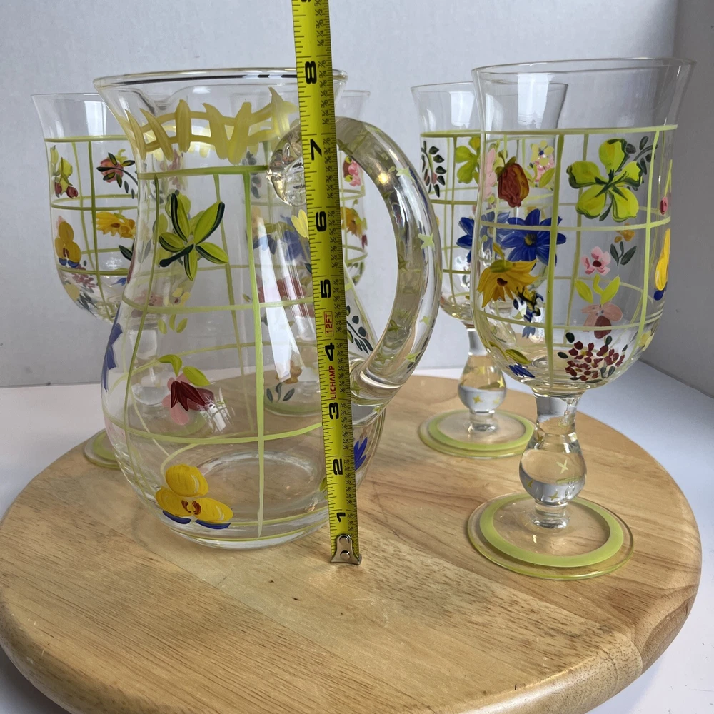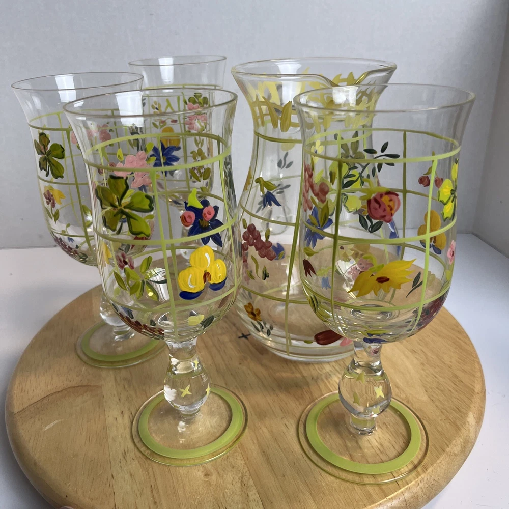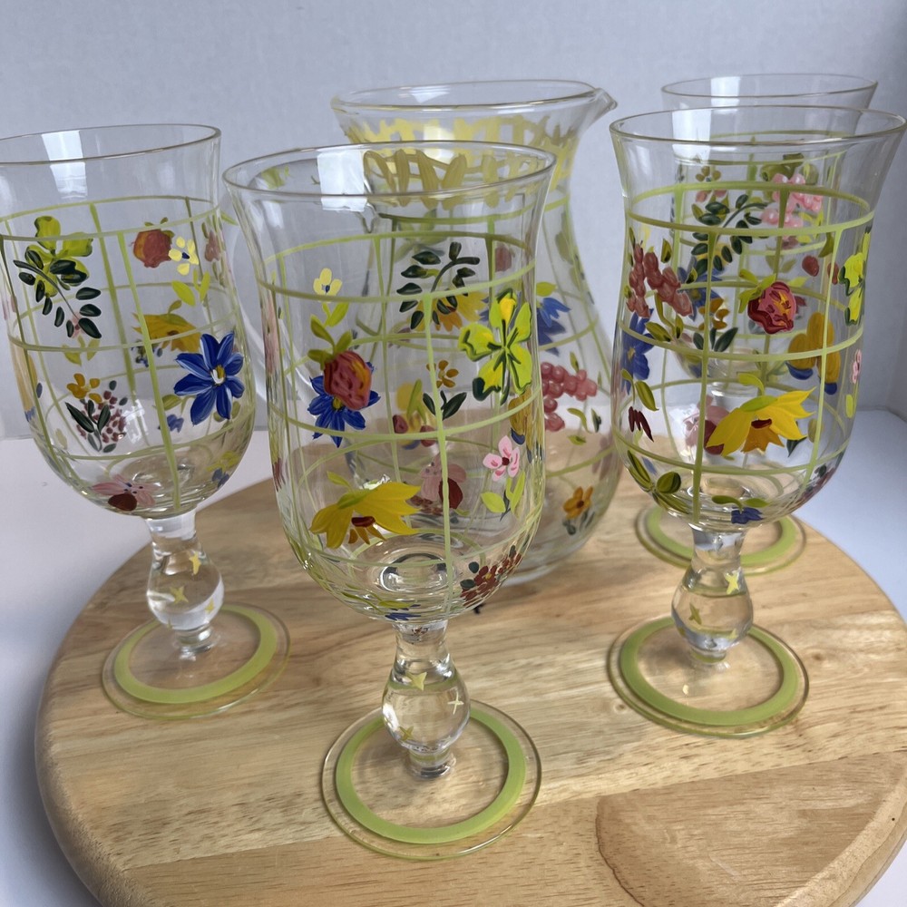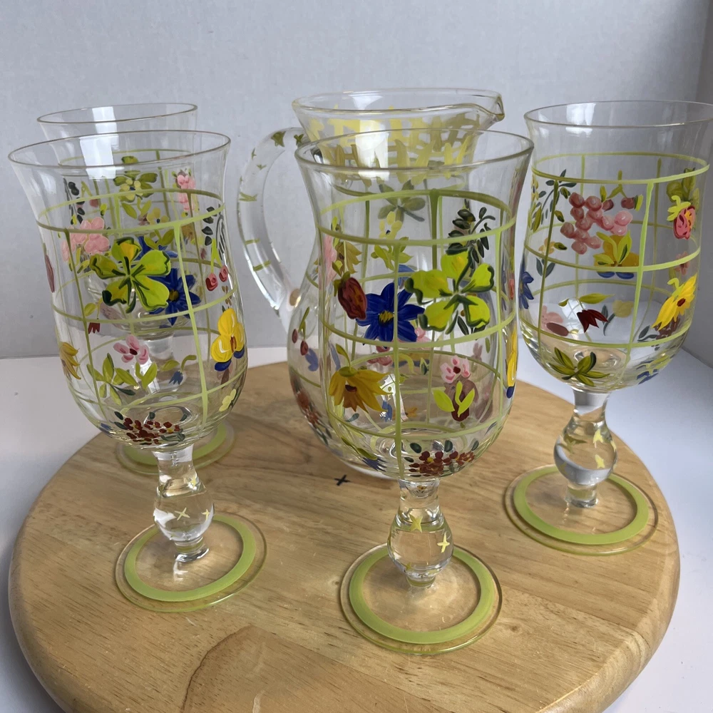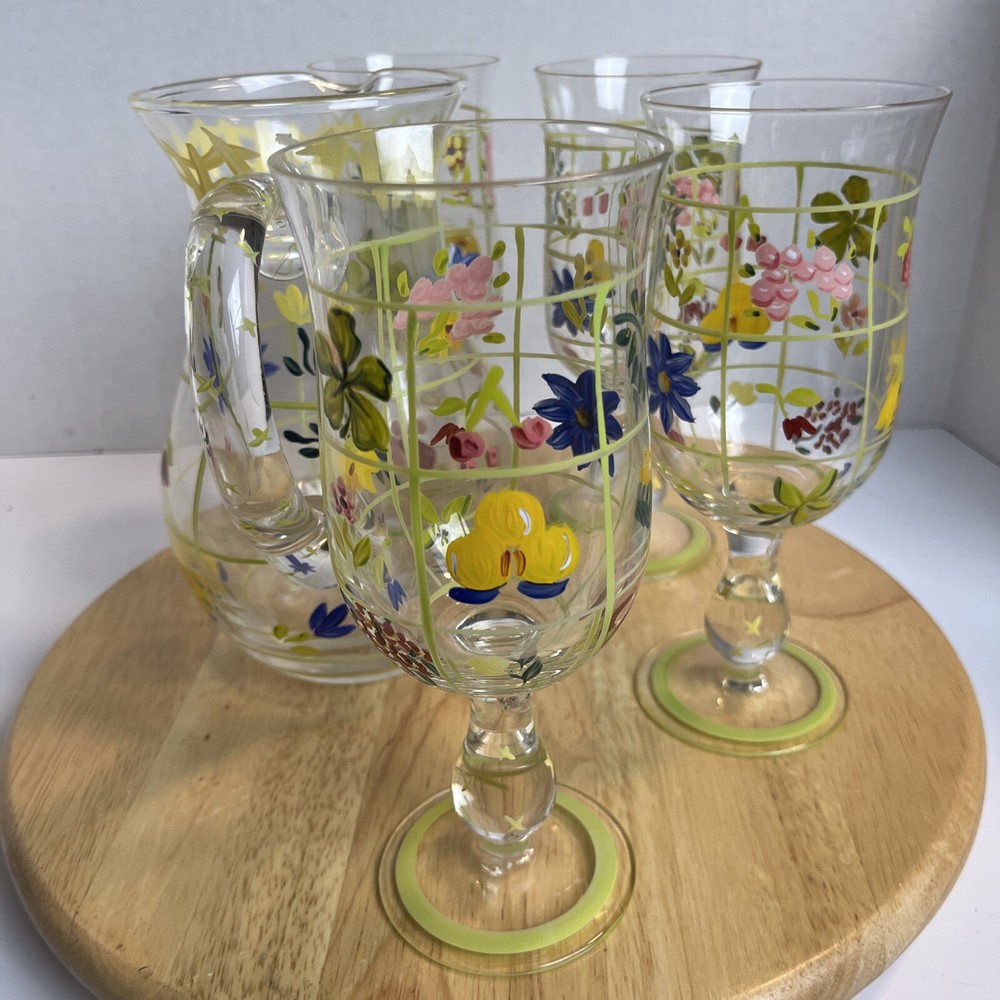 Vintage Pitcher & 4 Stemmed Glasses Hand Painted Flowers Summer Cottage Core. Great for wine, lemonade, ice tea, any summer drinks
