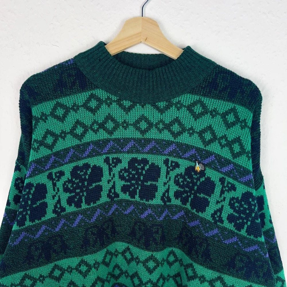 Vintage knitted jumper in green with funky floral & striped geometric pattern. Mock neck sweater, in great condition. Fits approx. a size medium or suits smaller oversized, measurements below Length: 27 inches Pit to pit: 24 inches £3 UK P&P 💌 Model is 5’9 and a men’s medium Please get in touch for more measurements All items are second-hand so please expect small signs of wear - any major flaws will be noted