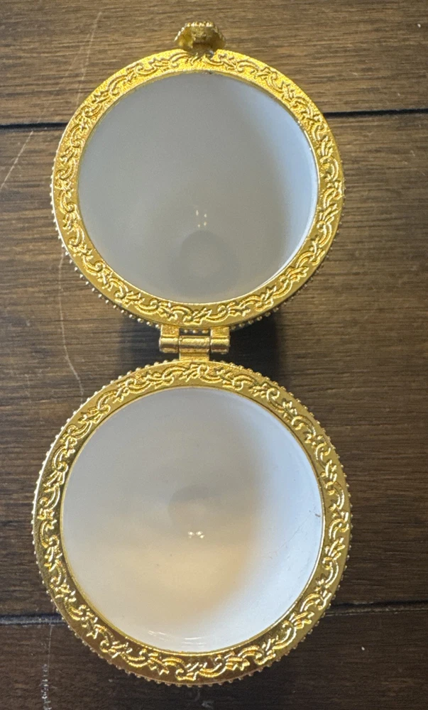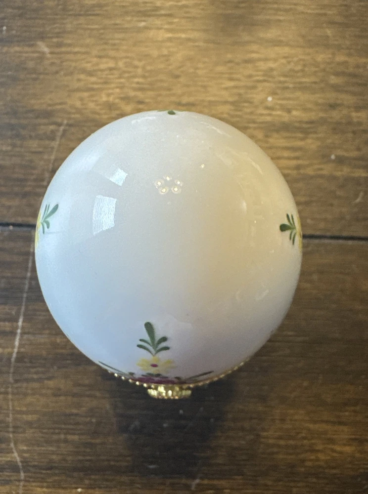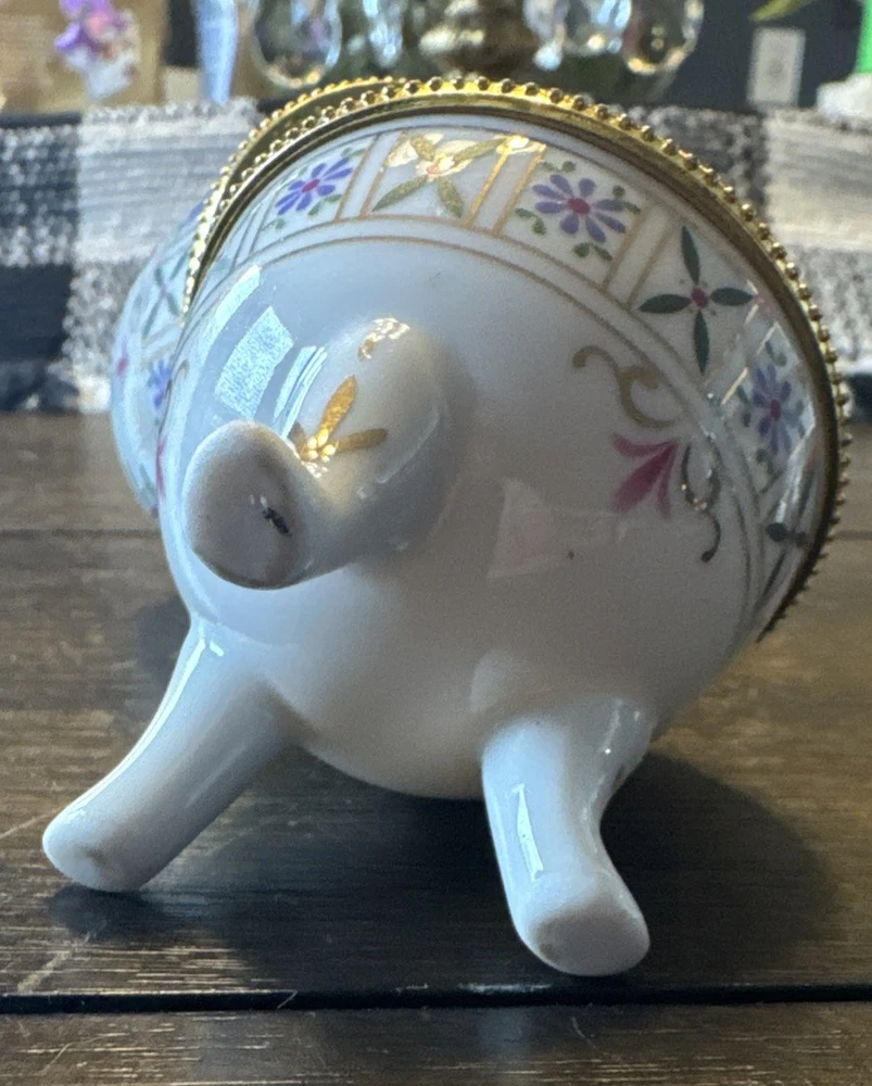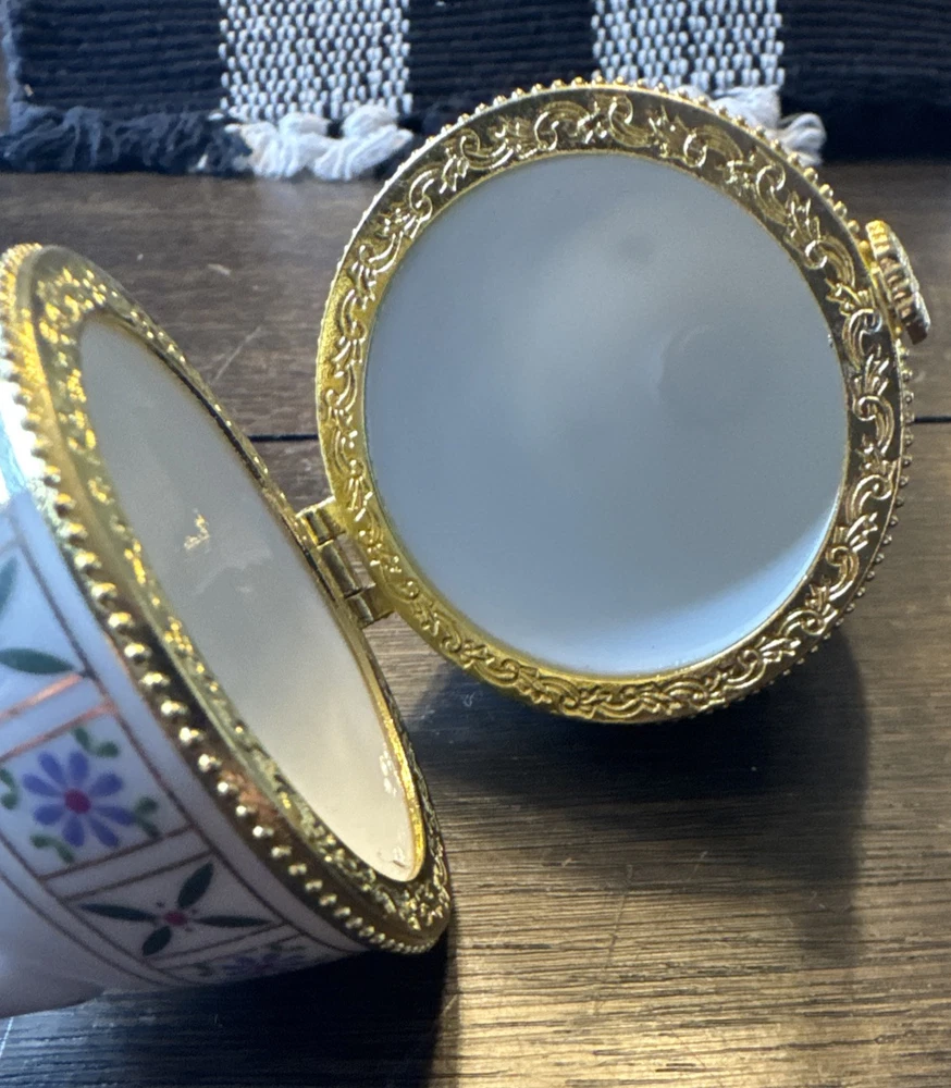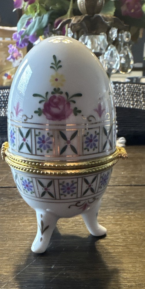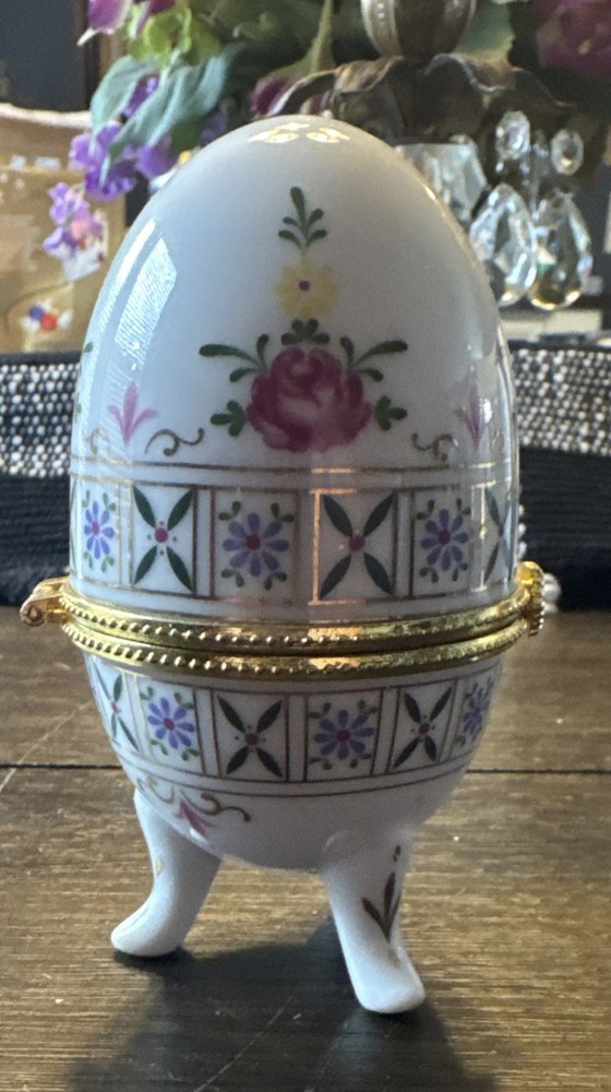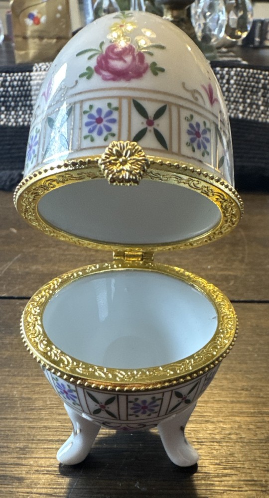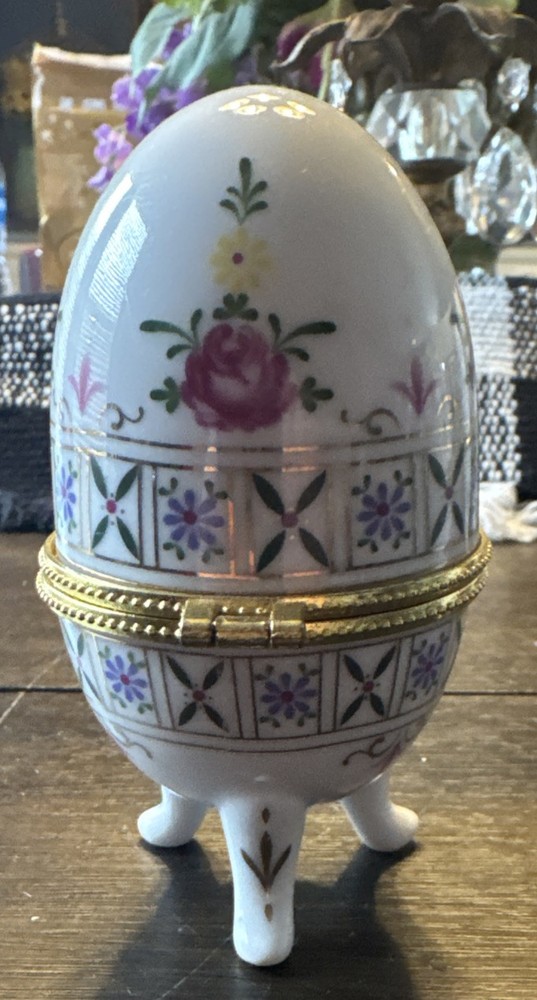 Vintage Floral Porcelain Egg Trinket Box with Gold Hinged Lid and Feet