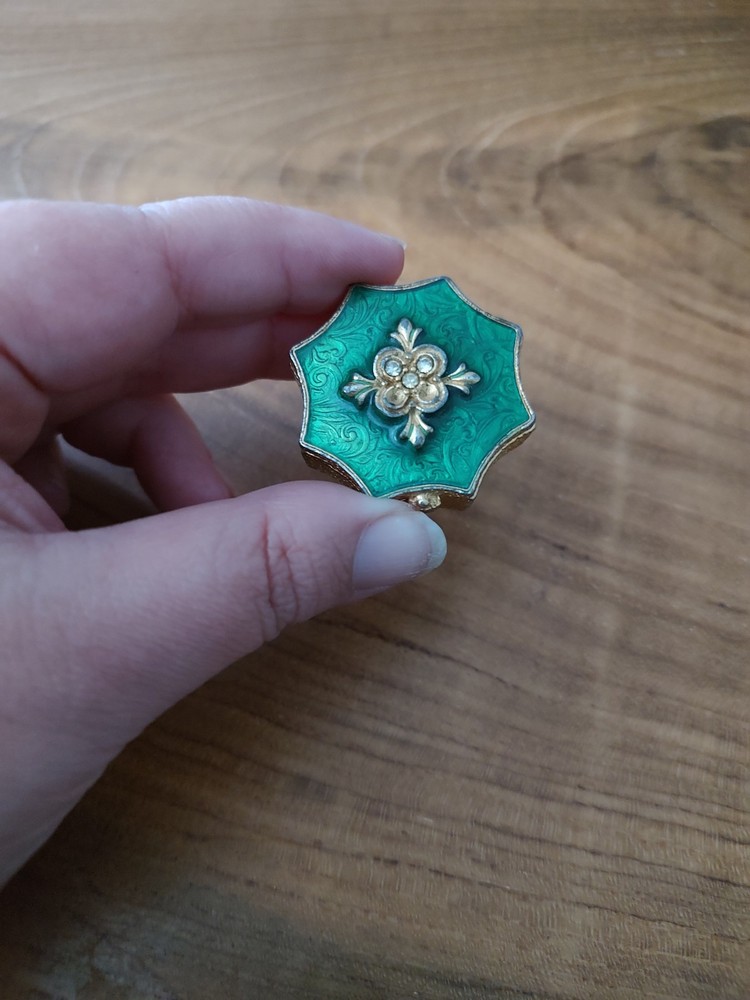 Vintage Florenza Ornate Green Flower Octagon Hinged Trinket Box Gold Tone
